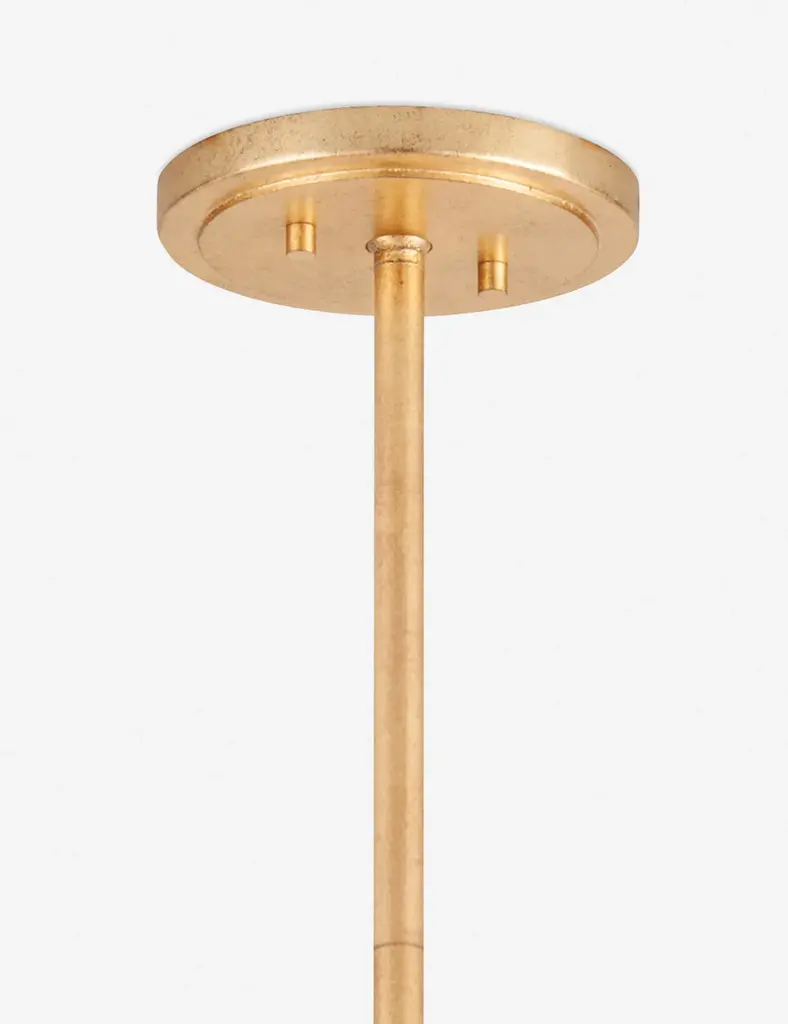 A frosted orb and gold leaf finish offer a touch of brilliance to the graceful lines of this chandelier. Create an opulent overhead statement in a living or dining room with this show-stopping chandelier design.