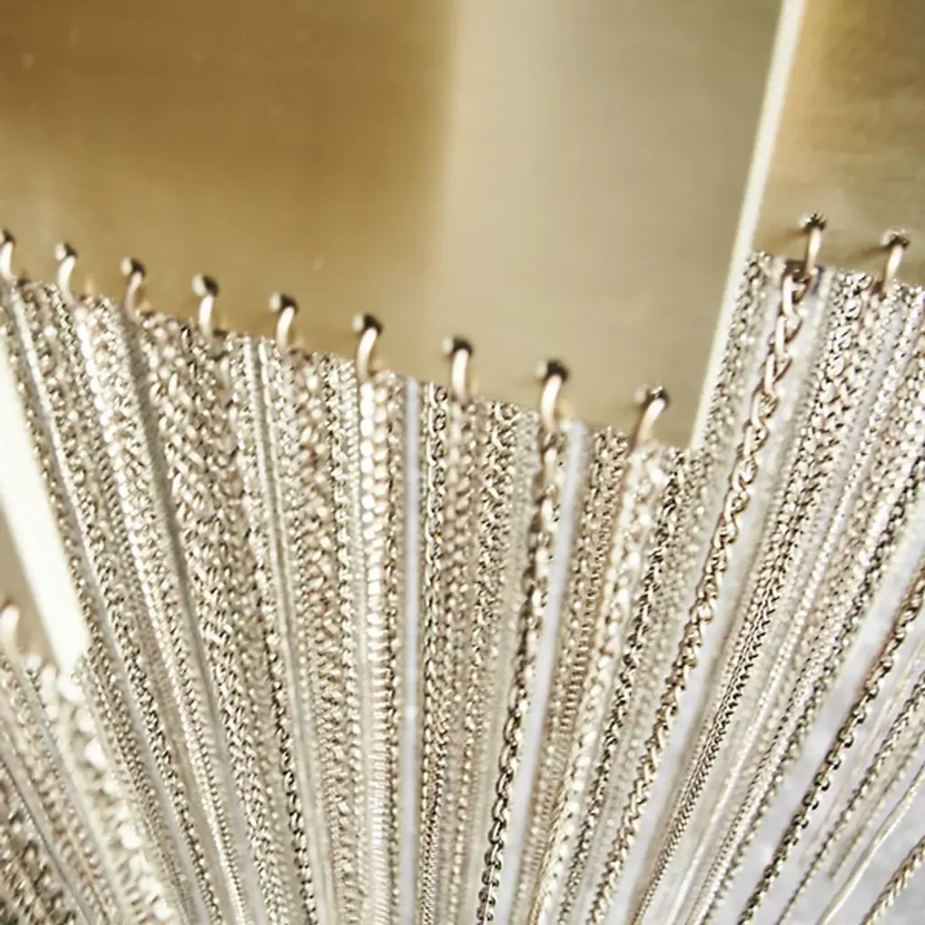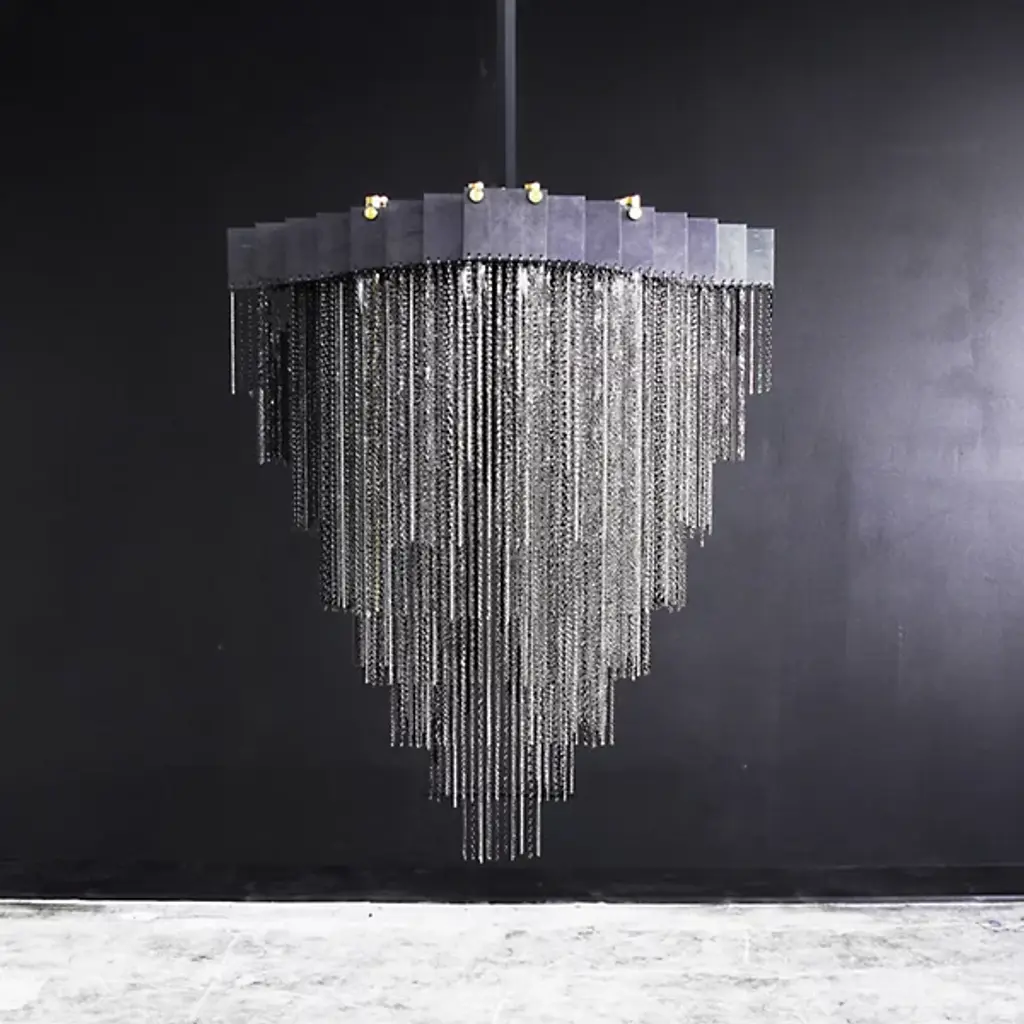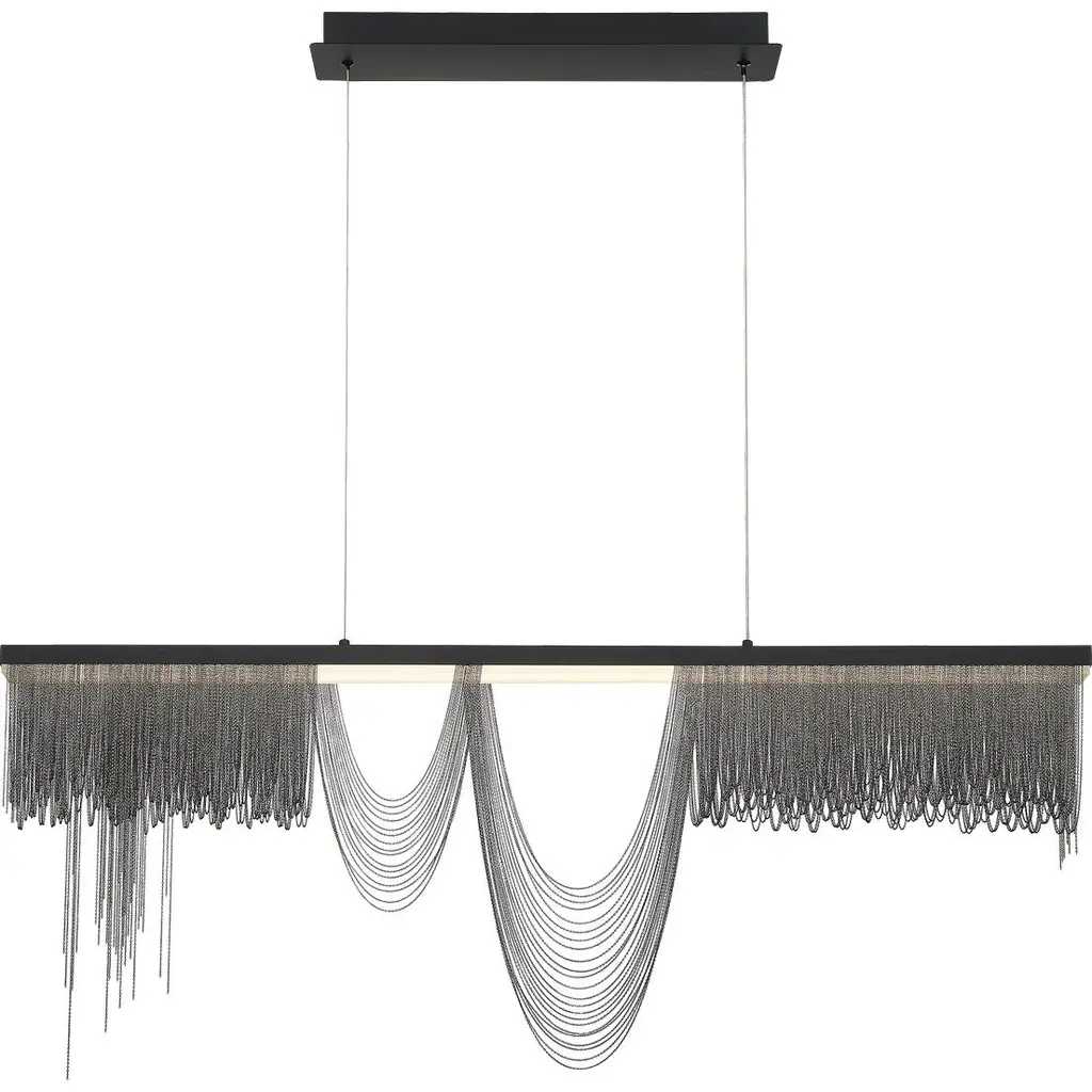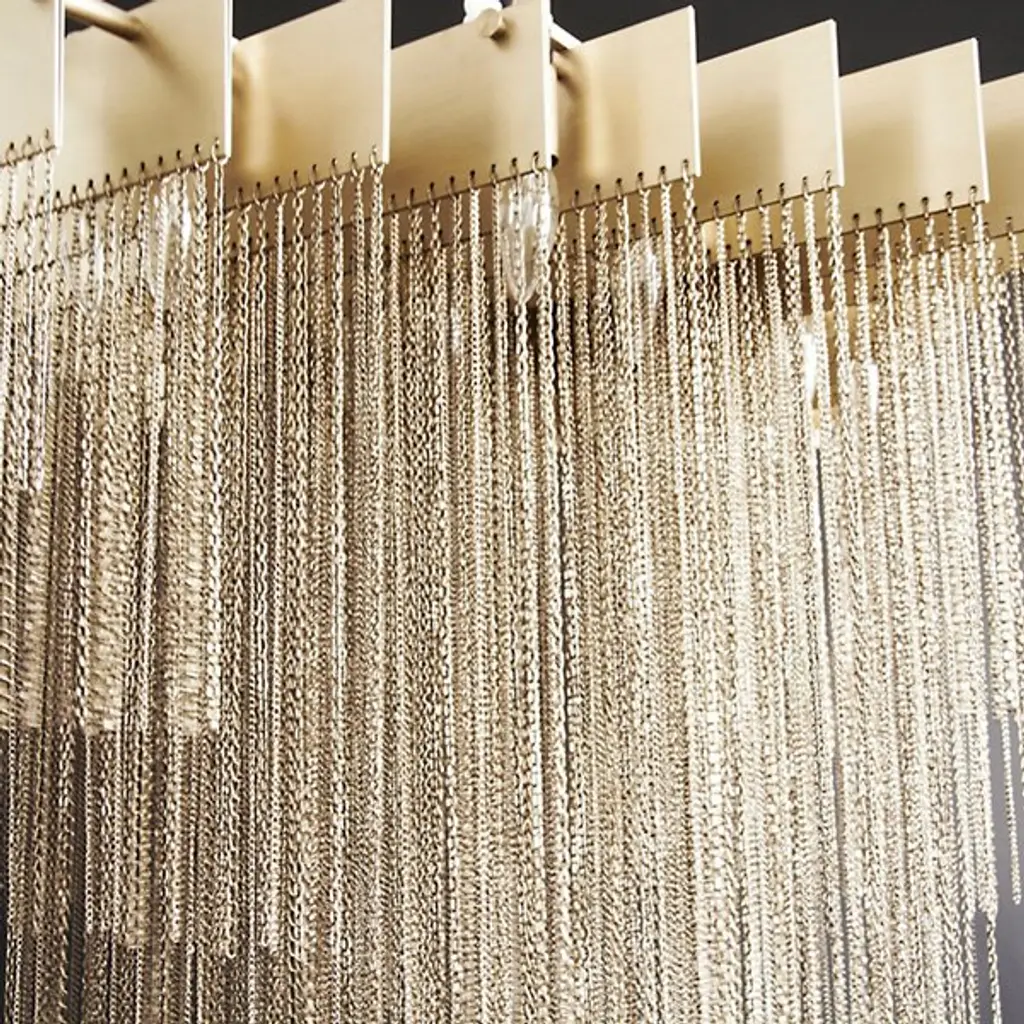A modern fixture with glamorous intrigue. The Kelly Chandelier from Gabriel Scott features an elegant and sophisticated design that complements luxurious, high-end settings. A series of metallic chains hang from the canopy in a cascading manner to create various layers that glisten with reflective light. Cold metal and warm light work together to offer a bold style that brightens any surrounding with midnight color. An Art Deco style is blended with modern sensibilities for a transitional style.