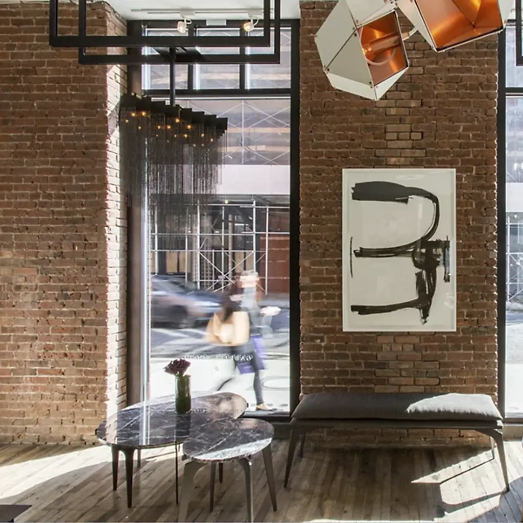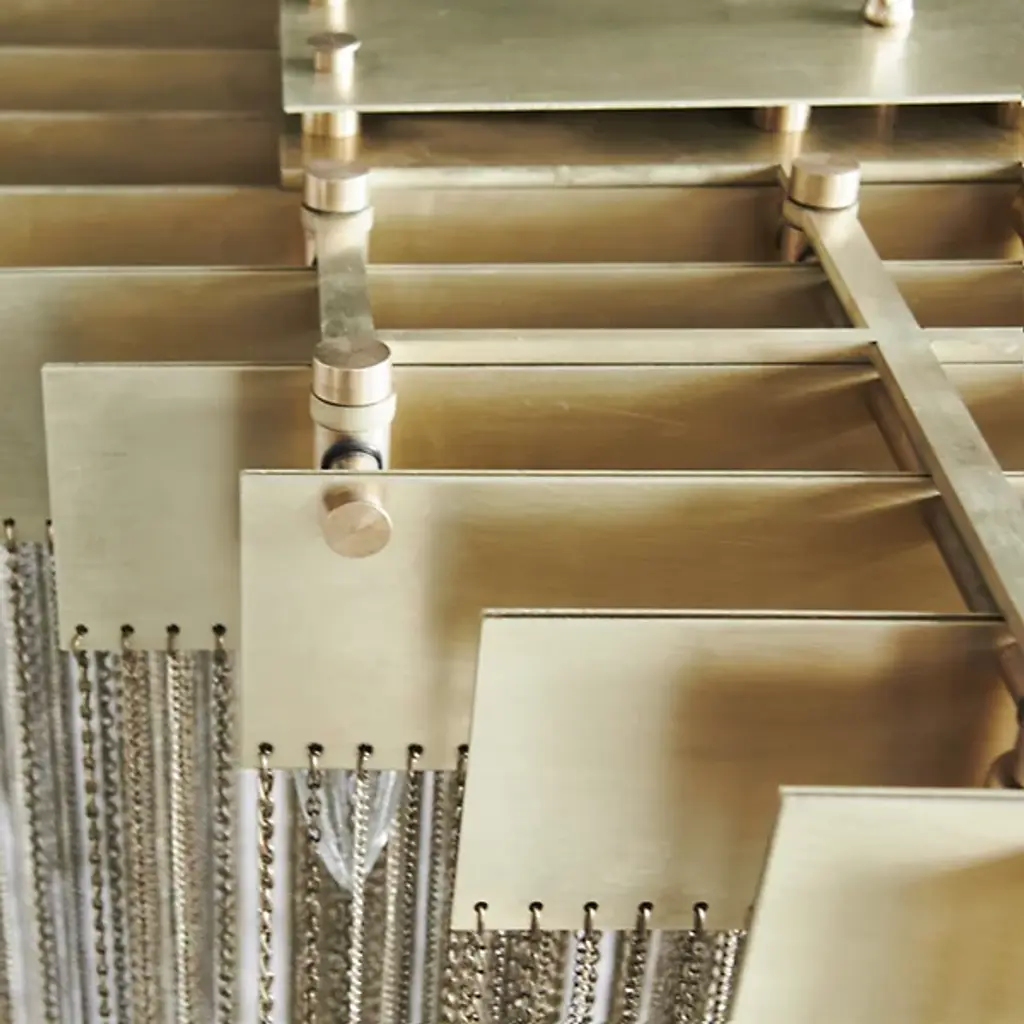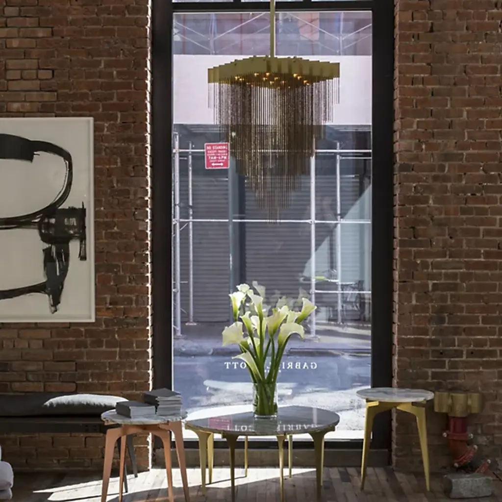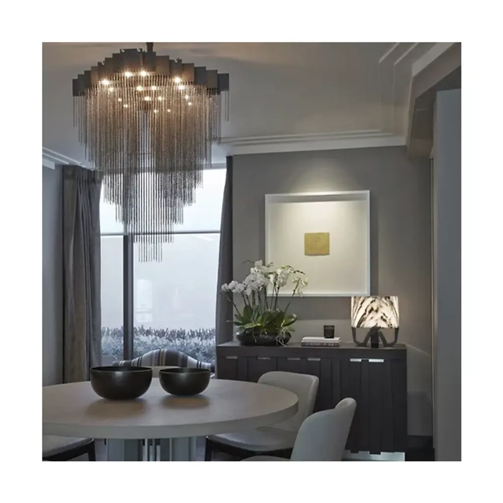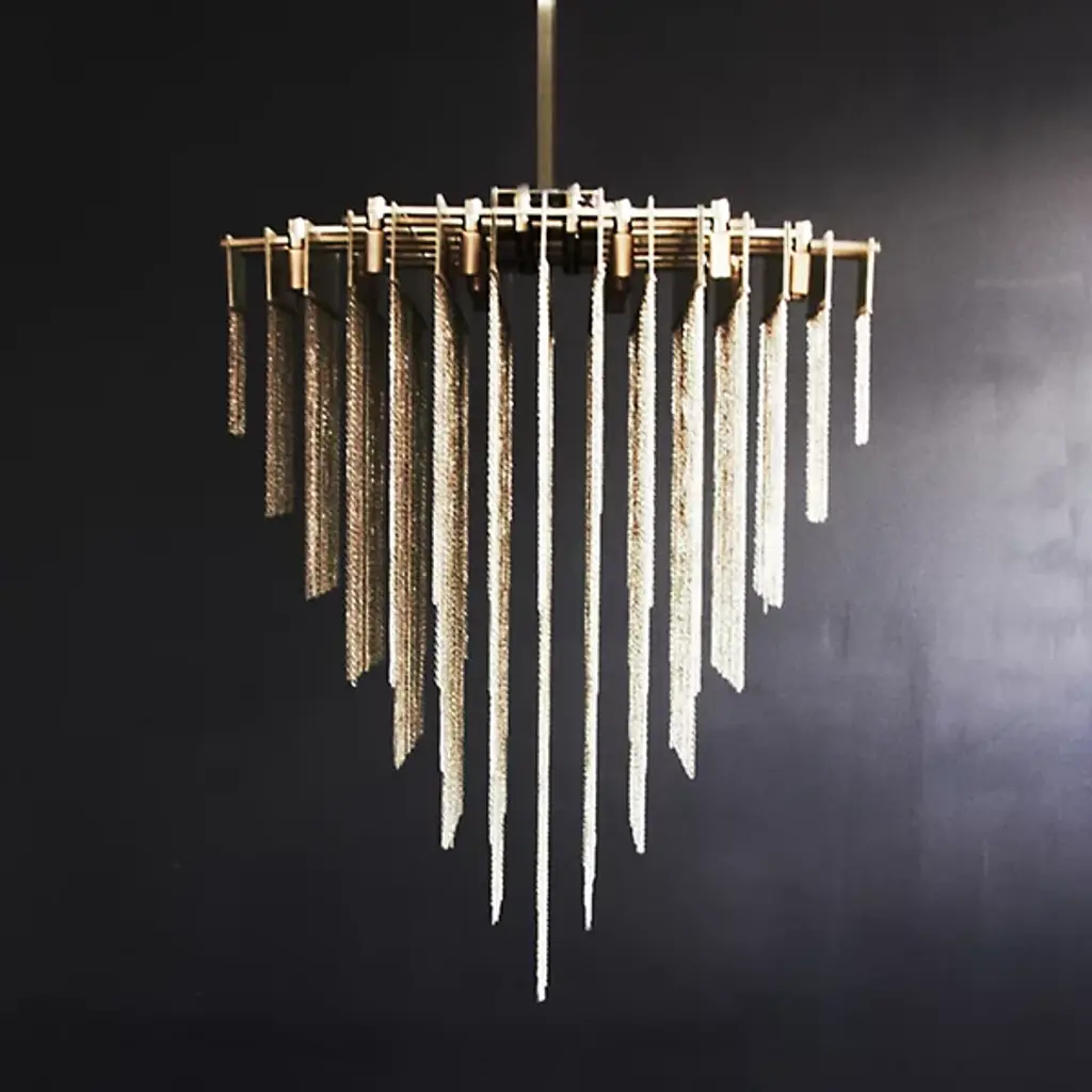 A modern fixture with glamorous intrigue. The Kelly Chandelier from Gabriel Scott features an elegant and sophisticated design that complements luxurious, high-end settings. A series of metallic chains hang from the canopy in a cascading manner to create various layers that glisten with reflective light. Cold metal and warm light work together to offer a bold style that brightens any surrounding with midnight color. An Art Deco style is blended with modern sensibilities for a transitional style.