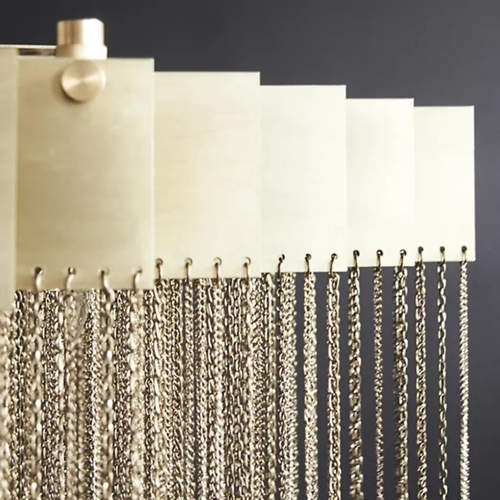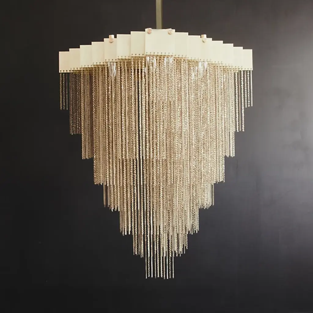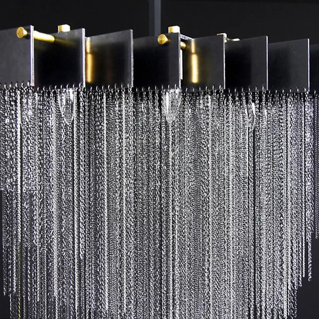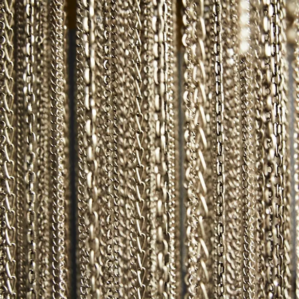 A modern fixture with glamorous intrigue. The Kelly Chandelier from Gabriel Scott features an elegant and sophisticated design that complements luxurious, high-end settings. A series of metallic chains hang from the canopy in a cascading manner to create various layers that glisten with reflective light. Cold metal and warm light work together to offer a bold style that brightens any surrounding with midnight color. An Art Deco style is blended with modern sensibilities for a transitional style.