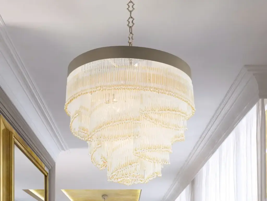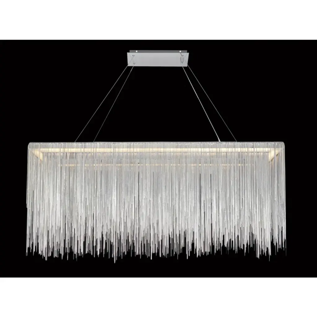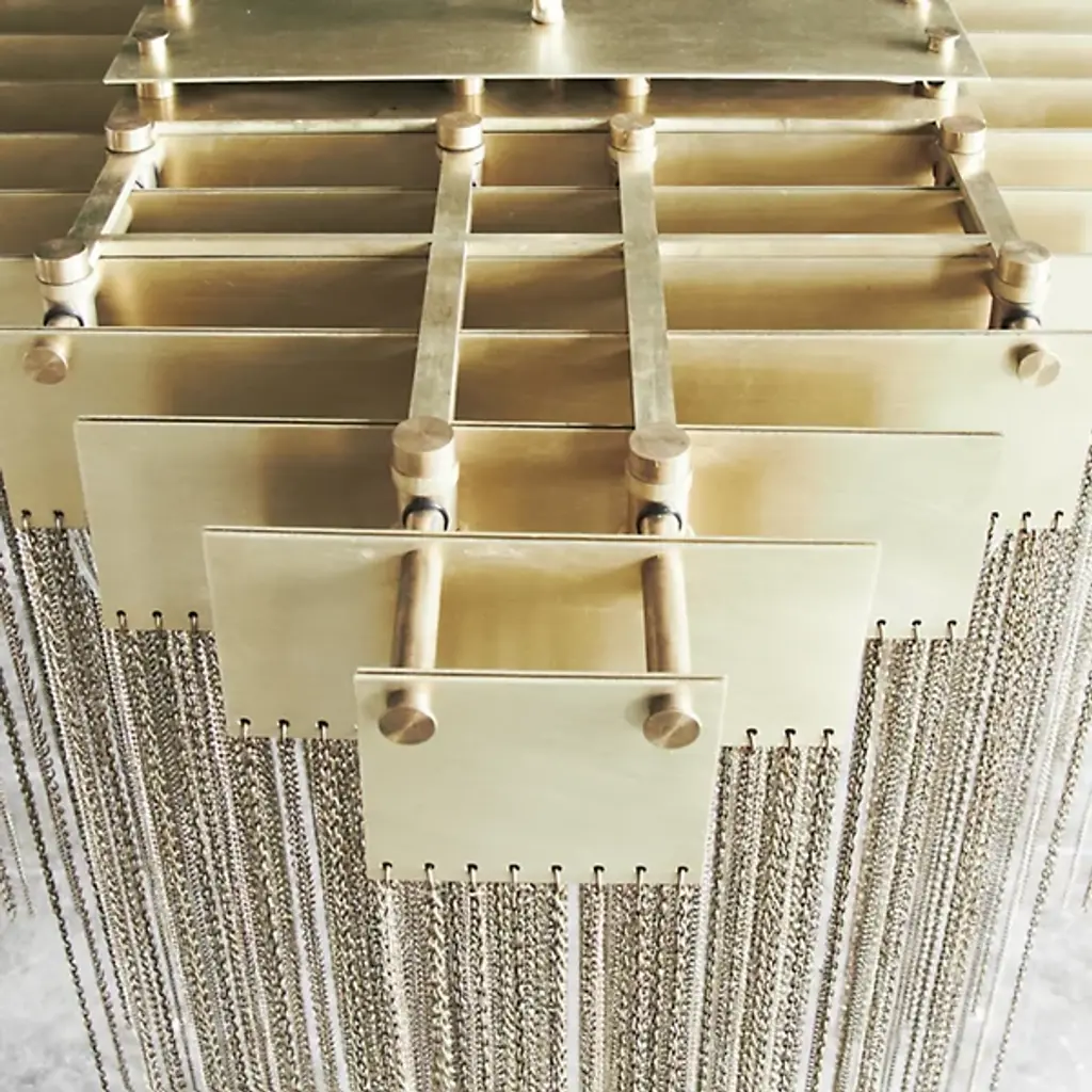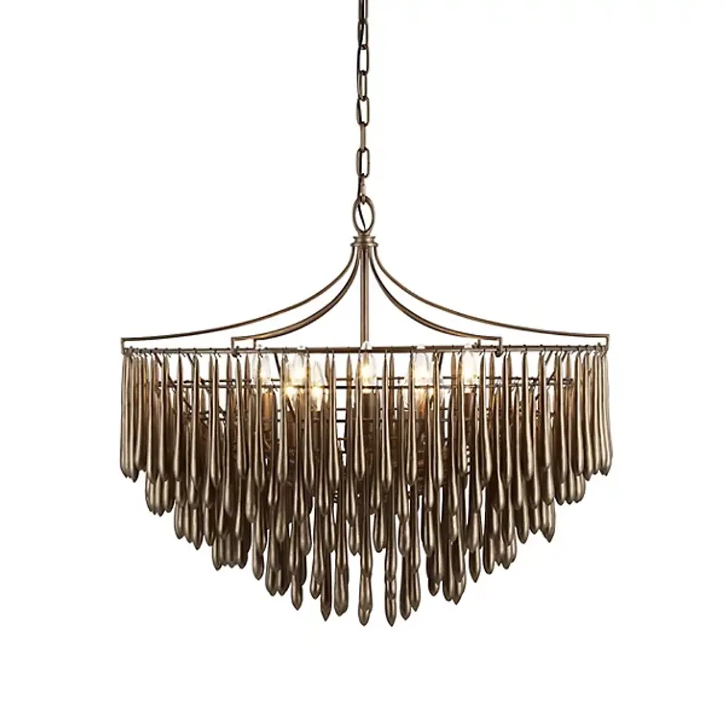 A modern fixture with glamorous intrigue. The Kelly Chandelier from Gabriel Scott features an elegant and sophisticated design that complements luxurious, high-end settings. A series of metallic chains hang from the canopy in a cascading manner to create various layers that glisten with reflective light. Cold metal and warm light work together to offer a bold style that brightens any surrounding with midnight color. An Art Deco style is blended with modern sensibilities for a transitional style.