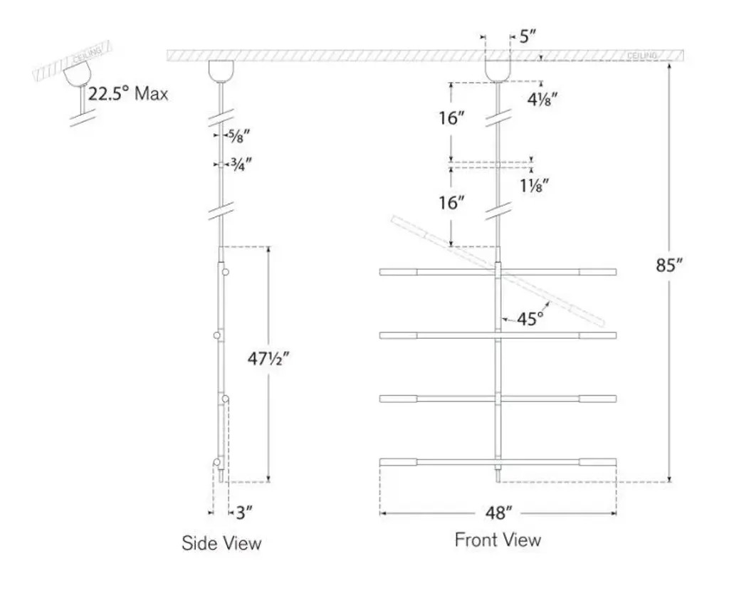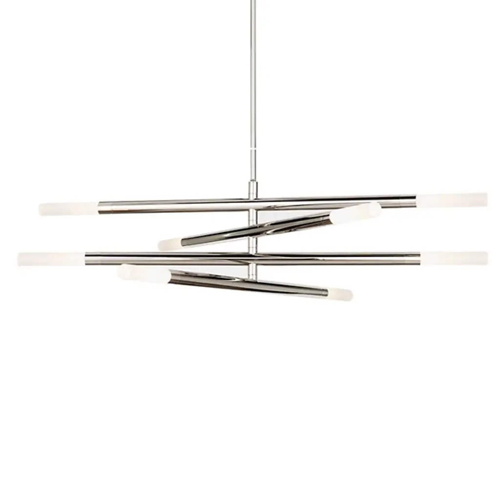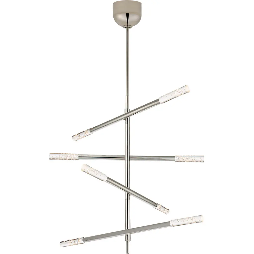 Rousseau Large Articulating Chandelier in Polished Nickel with Etched Crystal Designer: Kelly Wearstler Fixture Height: 47.5" Min. Custom Height: 65" O/A Height: 85" Canopy: 5" Round Mounting: Rod Shade Detail: Etched Crystal Socket: Dedicated LED Wattage: 35w (2800lm) Safety Rating Location: DAMP Note: Custom Height Available