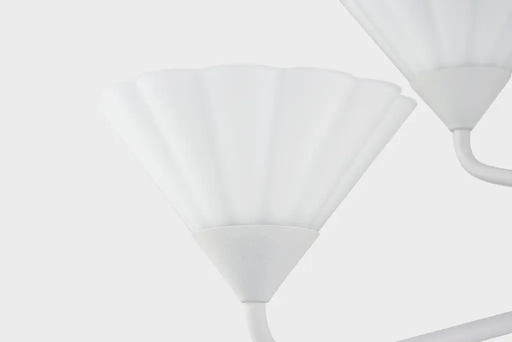 Softly ruffled opal etched glass shades mounted on slender, curved arms give this stylish design a sculptural feel whether hanging from the ceiling or mounted on the wall. The Textured White finish produces a clean, monochromatic effect, while the Aged Brass finish option adds a hint of shine. Mounted for uplight and available as a wall sconce, bath, or chandelier, Kelsey works in spaces throughout the home. Part of our Home Ec. x Mitzi Tastemakers collection.