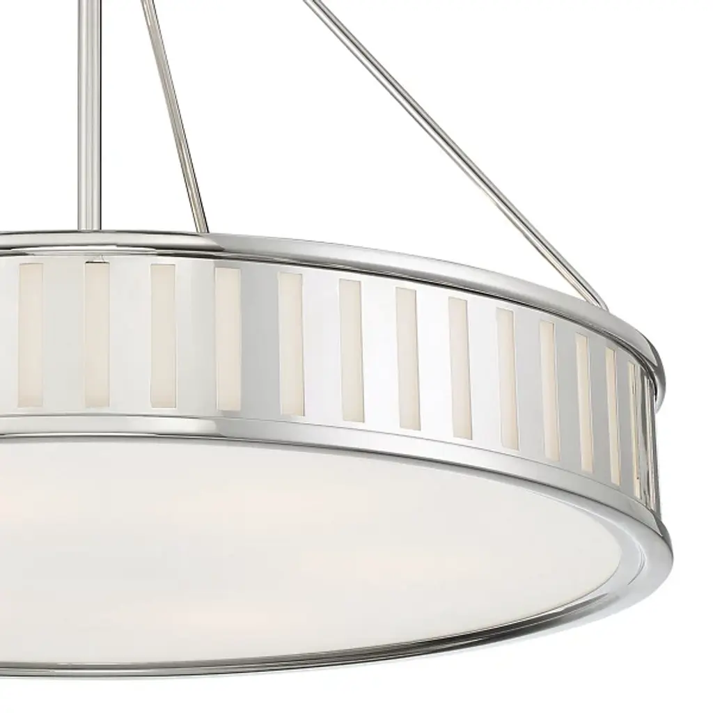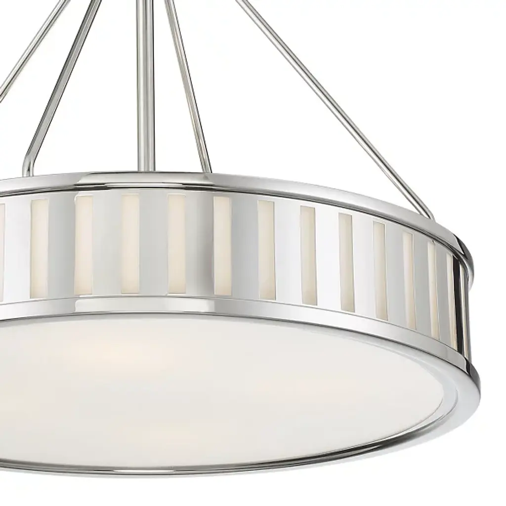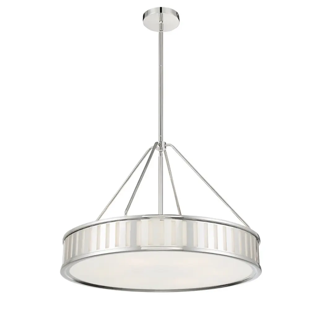 The Kendal Chandelier makes a statement with its graphic, uniform silhouette. The metal framing elegantly surrounds the white glass in this drum-shaped chandelier. This luxurious luminary's clean shapes are a great choice in industrial, modern, and rustic settings. Display the Kendal as a solo piece or in multiples to complete your lighting design vision.
