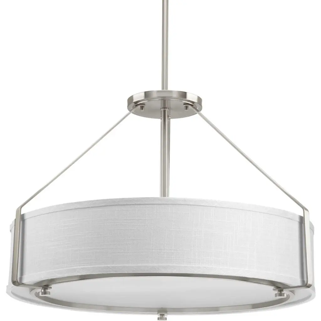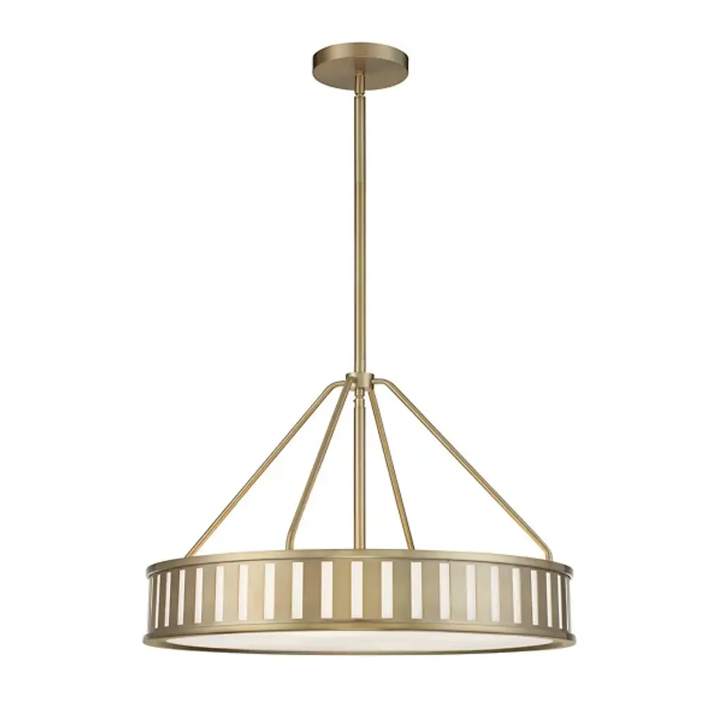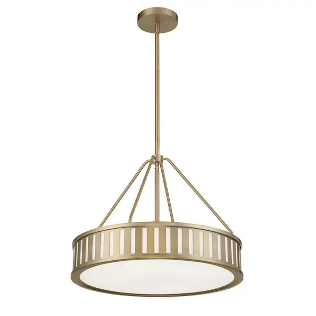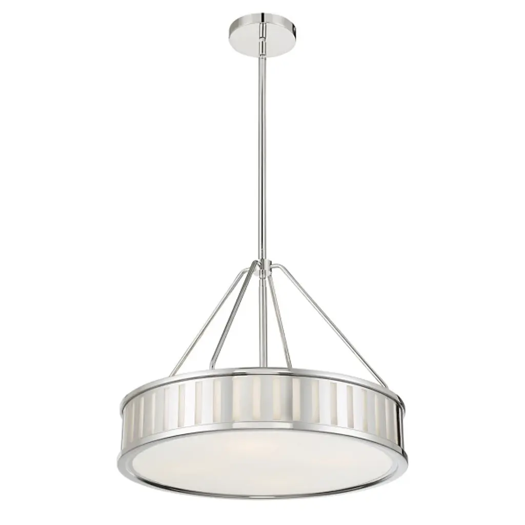 The Kendal Chandelier makes a statement with its graphic, uniform silhouette. The metal framing elegantly surrounds the white glass in this drum-shaped chandelier. This luxurious luminary's clean shapes are a great choice in industrial, modern, and rustic settings. Display the Kendal as a solo piece or in multiples to complete your lighting design vision.