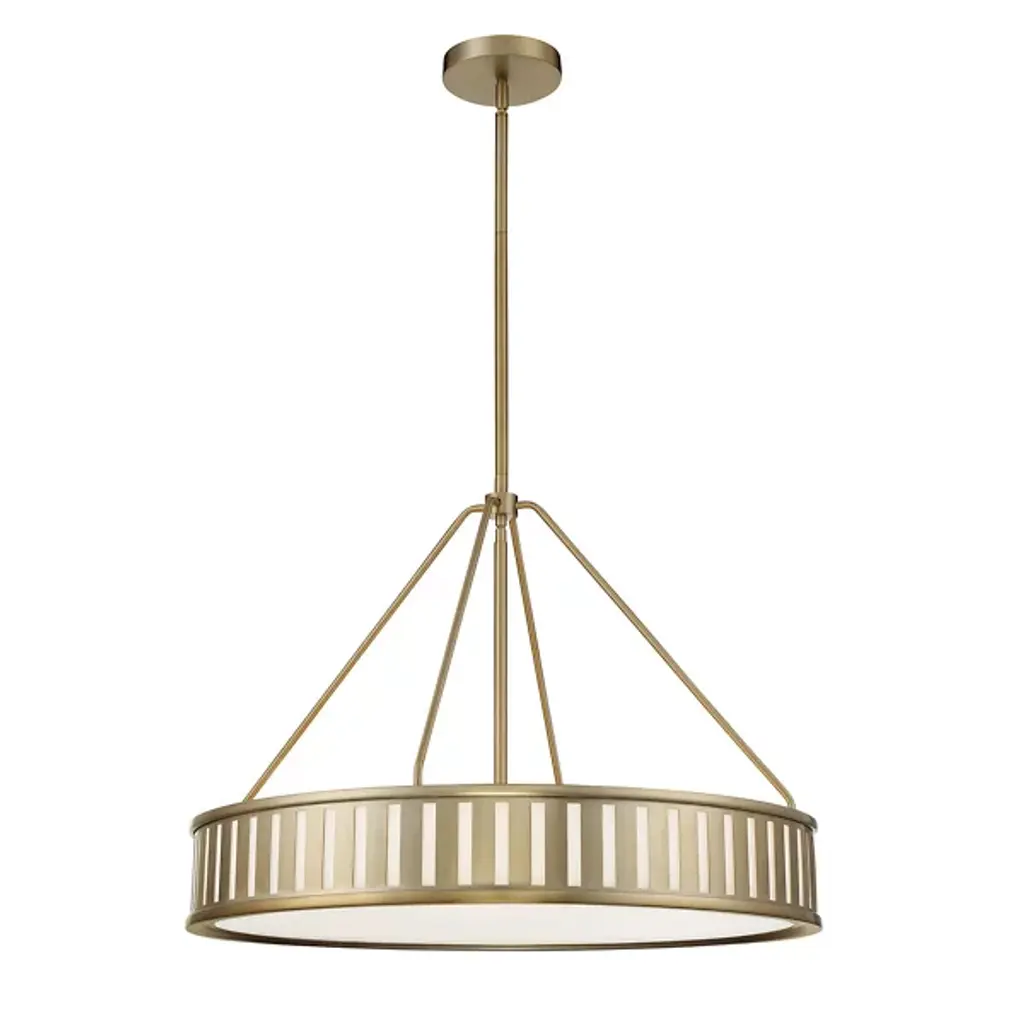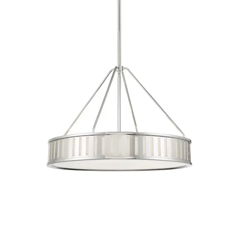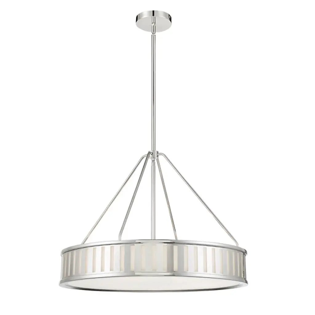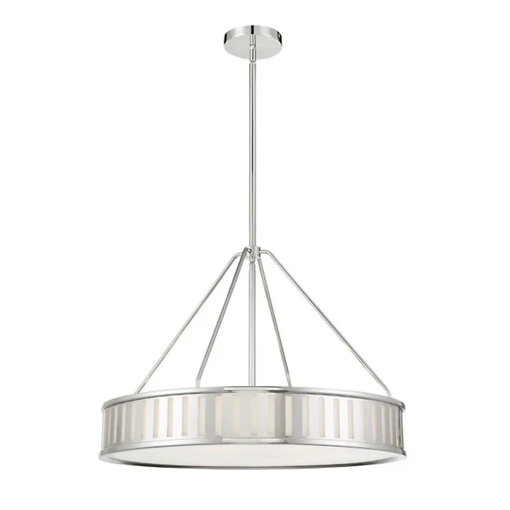 The Kendal Chandelier makes a statement with its graphic, uniform silhouette. The metal framing elegantly surrounds the white glass in this drum-shaped chandelier. This luxurious luminary's clean shapes are a great choice in industrial, modern, and rustic settings. Display the Kendal as a solo piece or in multiples to complete your lighting design vision.
