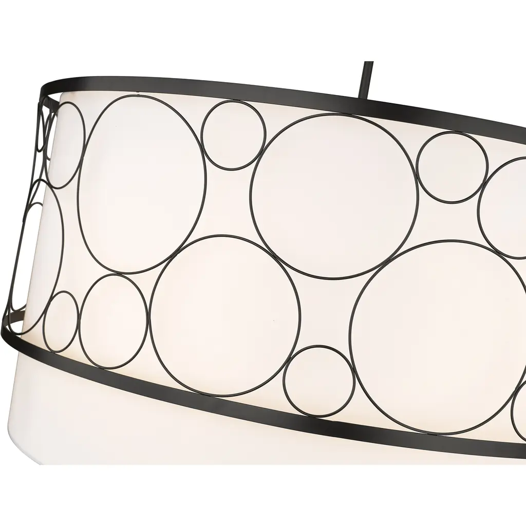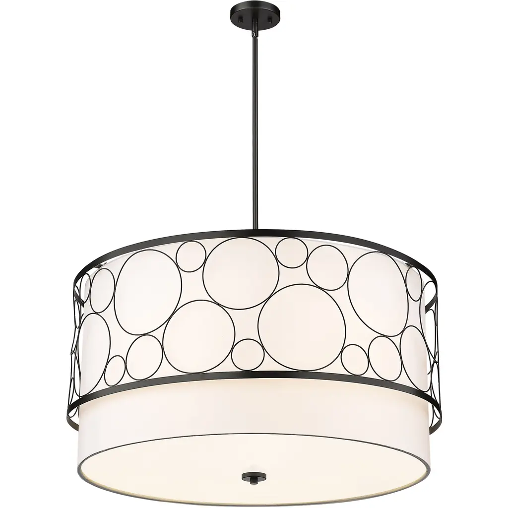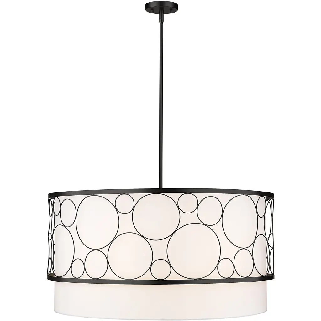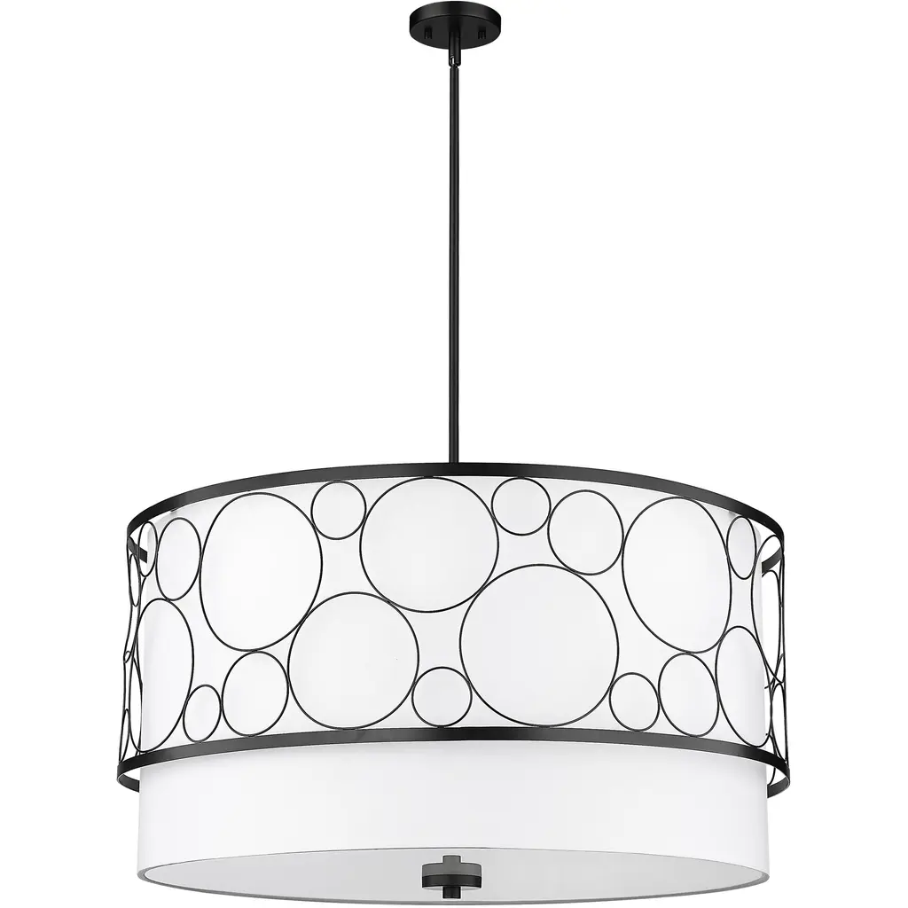 A sophisticated touch to spacious interiors like dining rooms and open concept living rooms, this modern five-light pendant boasts a tiered drum shape design that offers both style and grace. Open ringlets compress against one another to create an outer cage, elevated by a contrasting, stark matte black finish. Behind it, a white fabric shade puts off a serene, captivating glow, casting a gorgeous silhouette across the space.