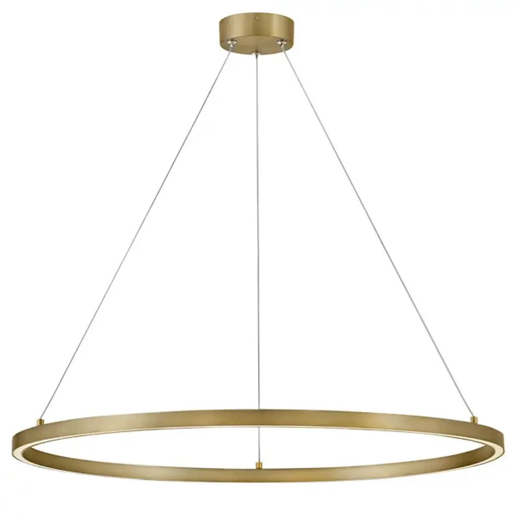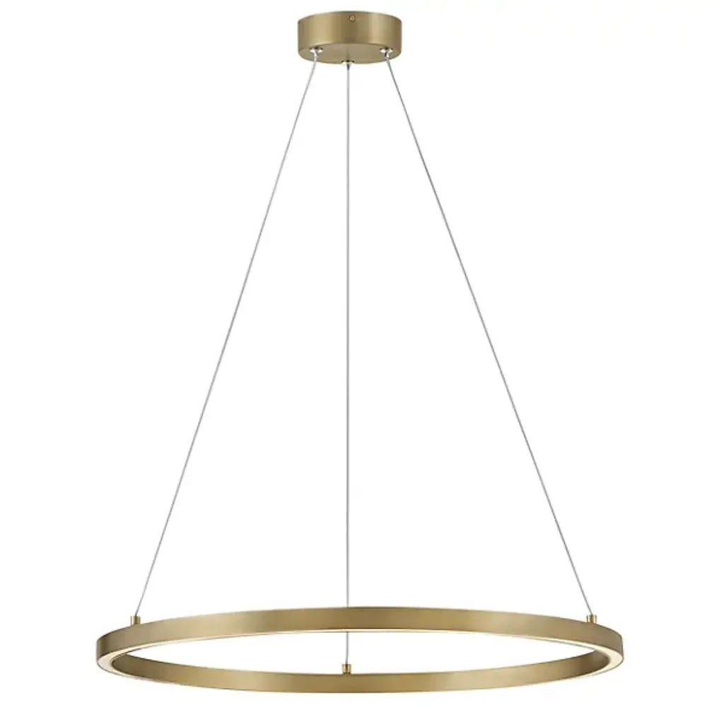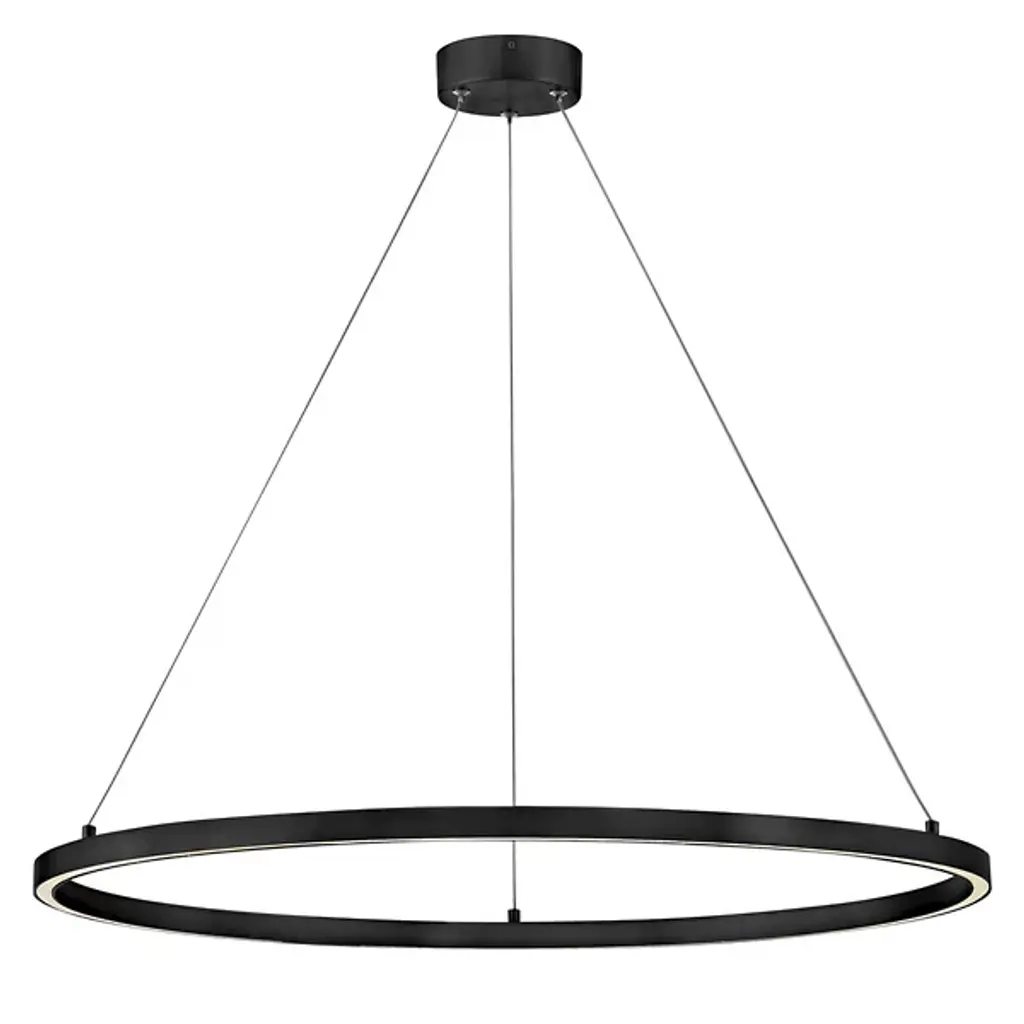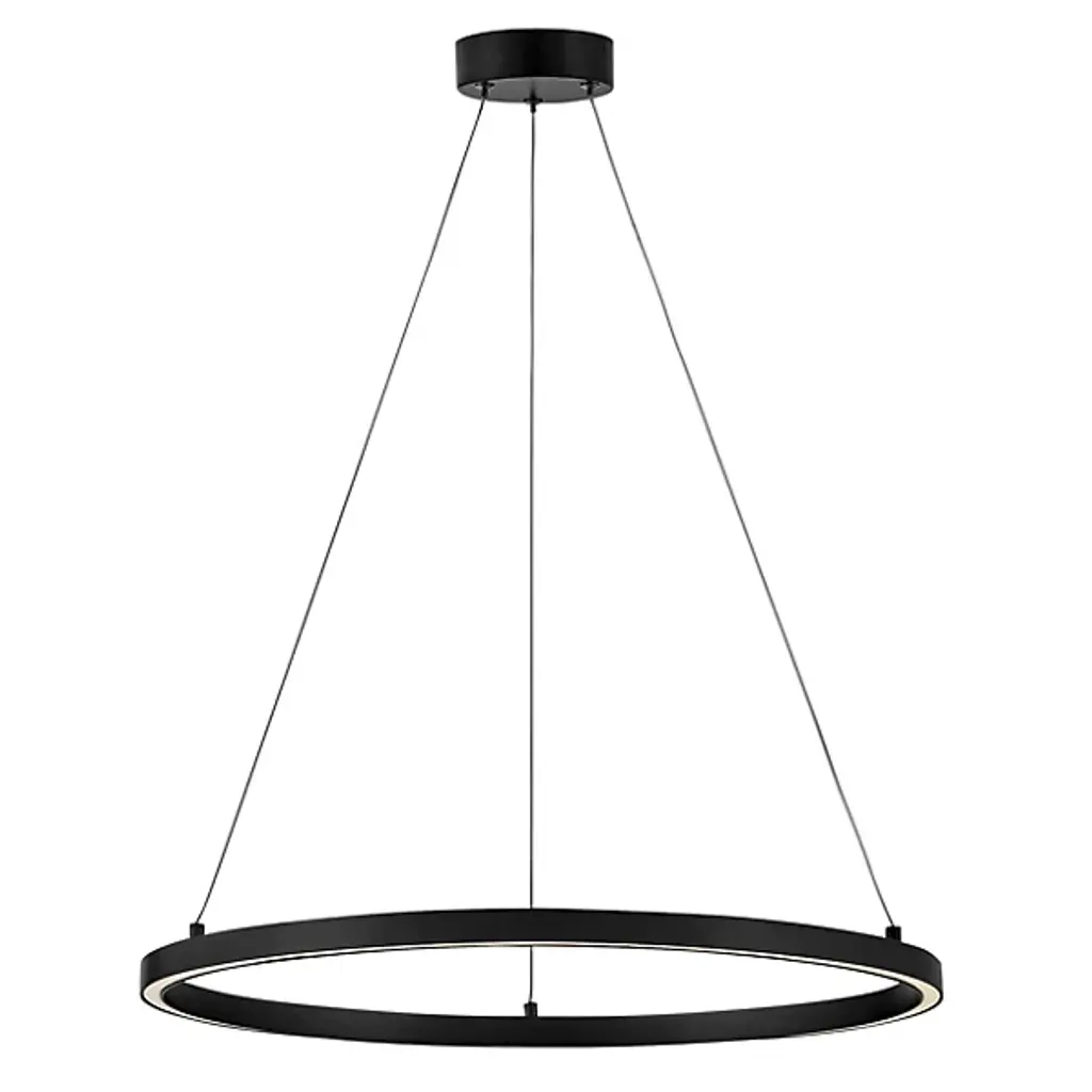 Experience the pinnacle of modern sophistication with the Kenna LED Chandelier from Lark, expertly crafted from aluminum with acrylic lens shades. Its bold circular profile commands attention, striking a balance between significant presence and minimalist simplicity that complements any interior décor. The distinctive ring design, adorned with integrated LEDs, is suspended by easily adjustable cables from a circular canopy, allowing you to tailor the fixture to match your preferred orientation, adding a touch of refined elegance to your home.