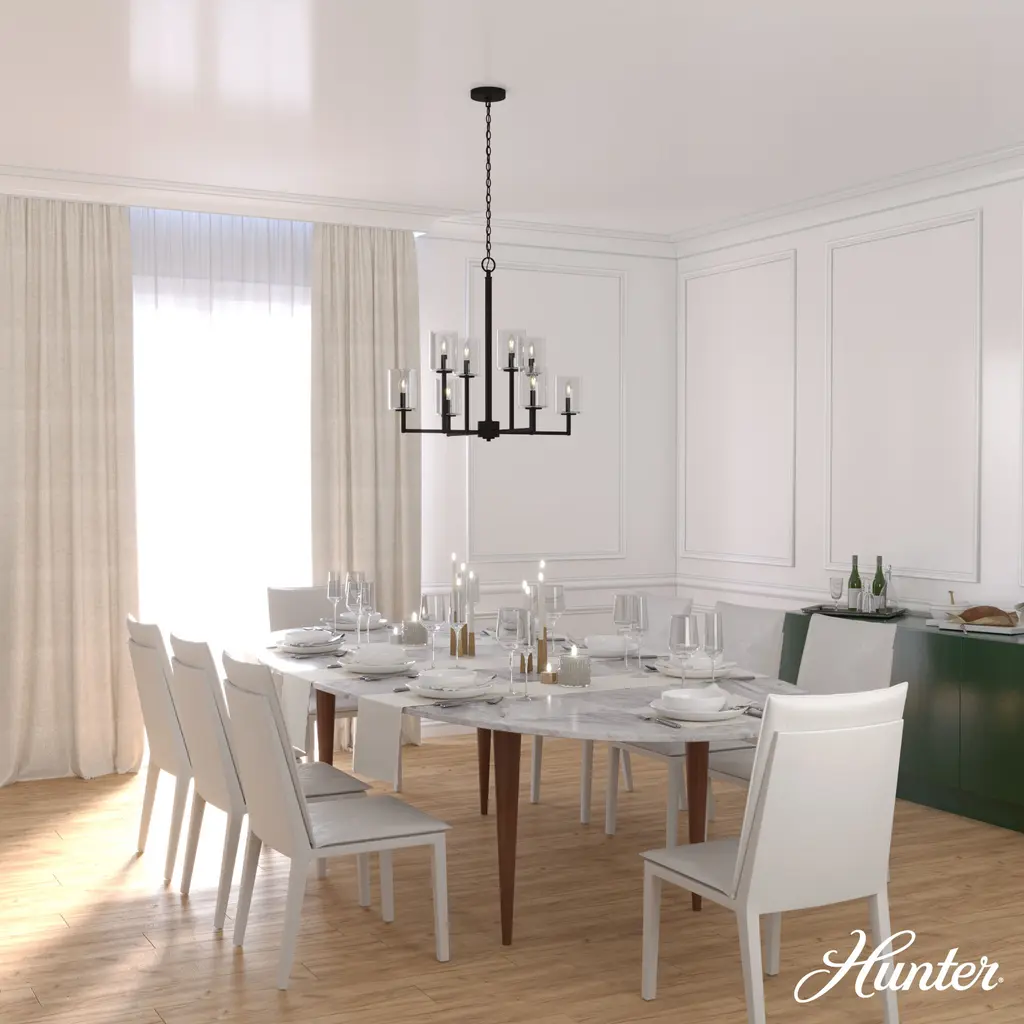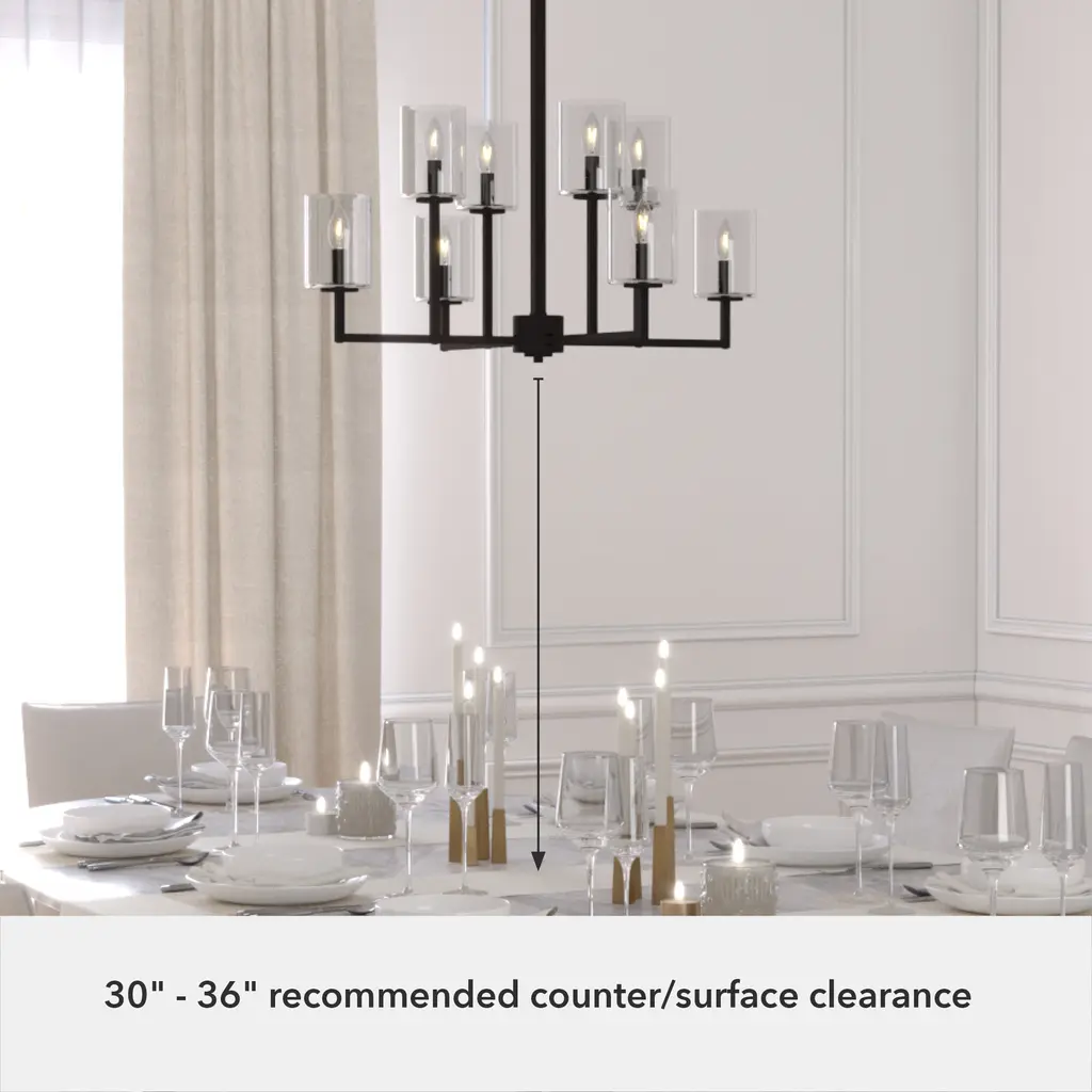 The Kerrison chandelier is a fantastic accessory to refresh the lighting in your home. Imagine dining under the light of this eye-catching chandelier. Our designers have combined metal and glass to construct this geometric showstopper. Clean lines and clear glass shades make this fixture great for transitional decor. Mix and match with other fixtures from this collection or from our ceiling fan designs.