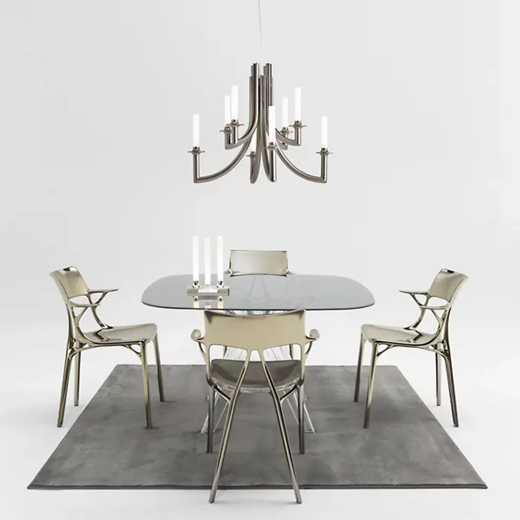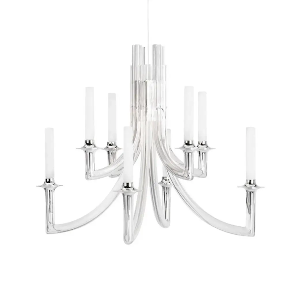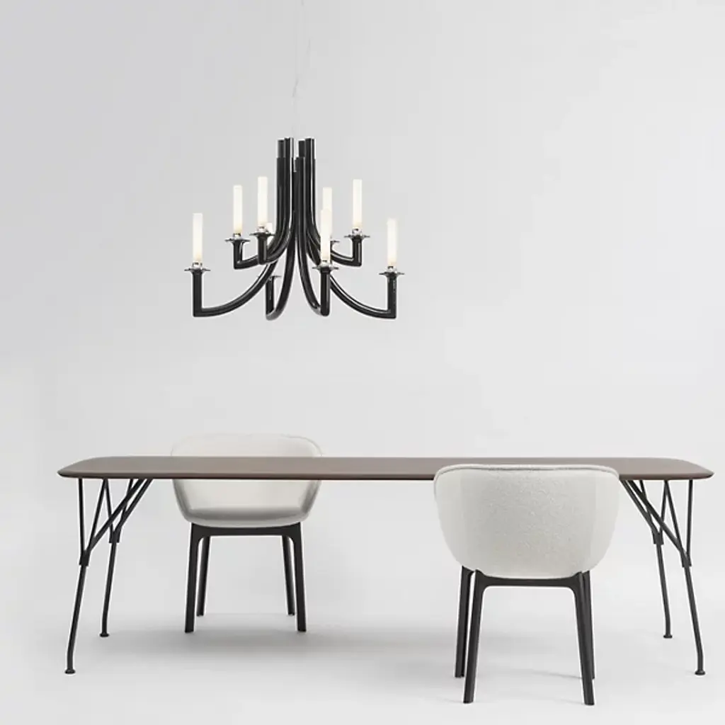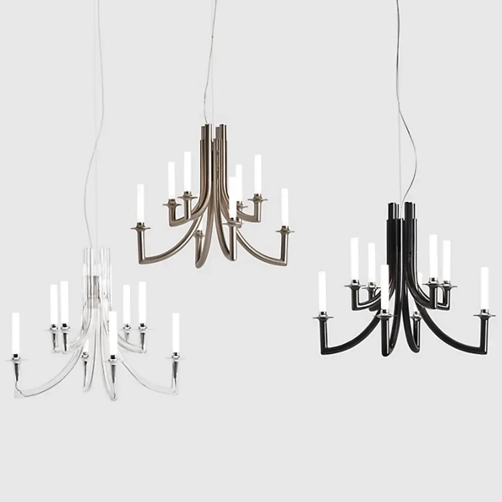 Presented by Kartell, the Khan Chandelier is crafted in Italy, inspired by a fusion of 18th-century eclecticism and contemporary minimalism. Designed by Philippe Starck, a renowned French industrial architect and designer, Khan features a fluid arrangement of metalwork, resulting in a captivating juxtaposition of candelabra arms that extend upwards at right angles to cradle faux candlestick lamping. It also boasts the innovative use of Kartell's polycarbonate 2.0., a groundbreaking material derived from renewable sources in the pulp and paper industry, earning the prestigious ISCC certification.