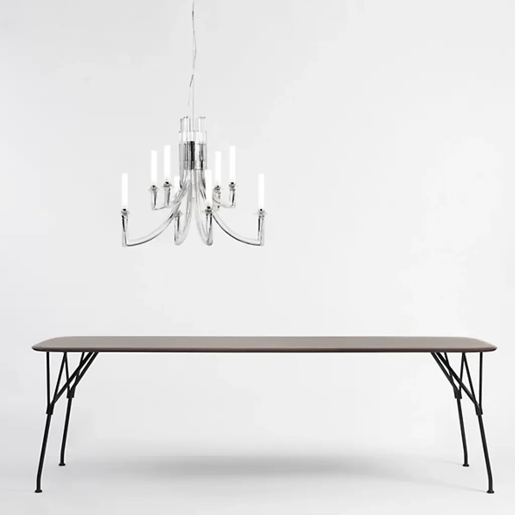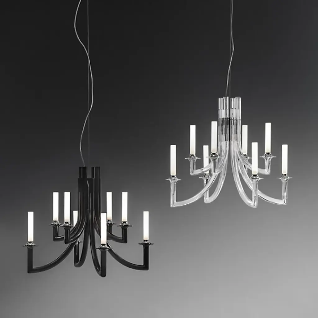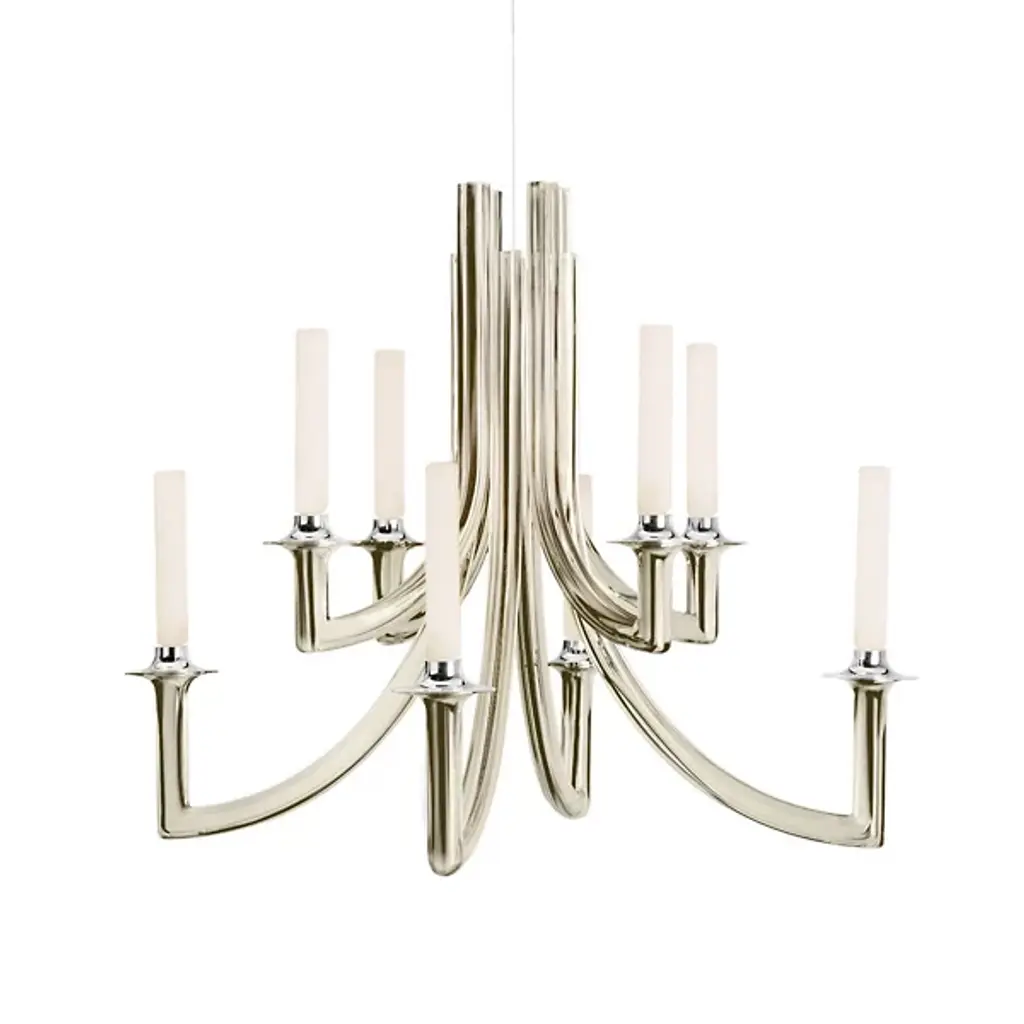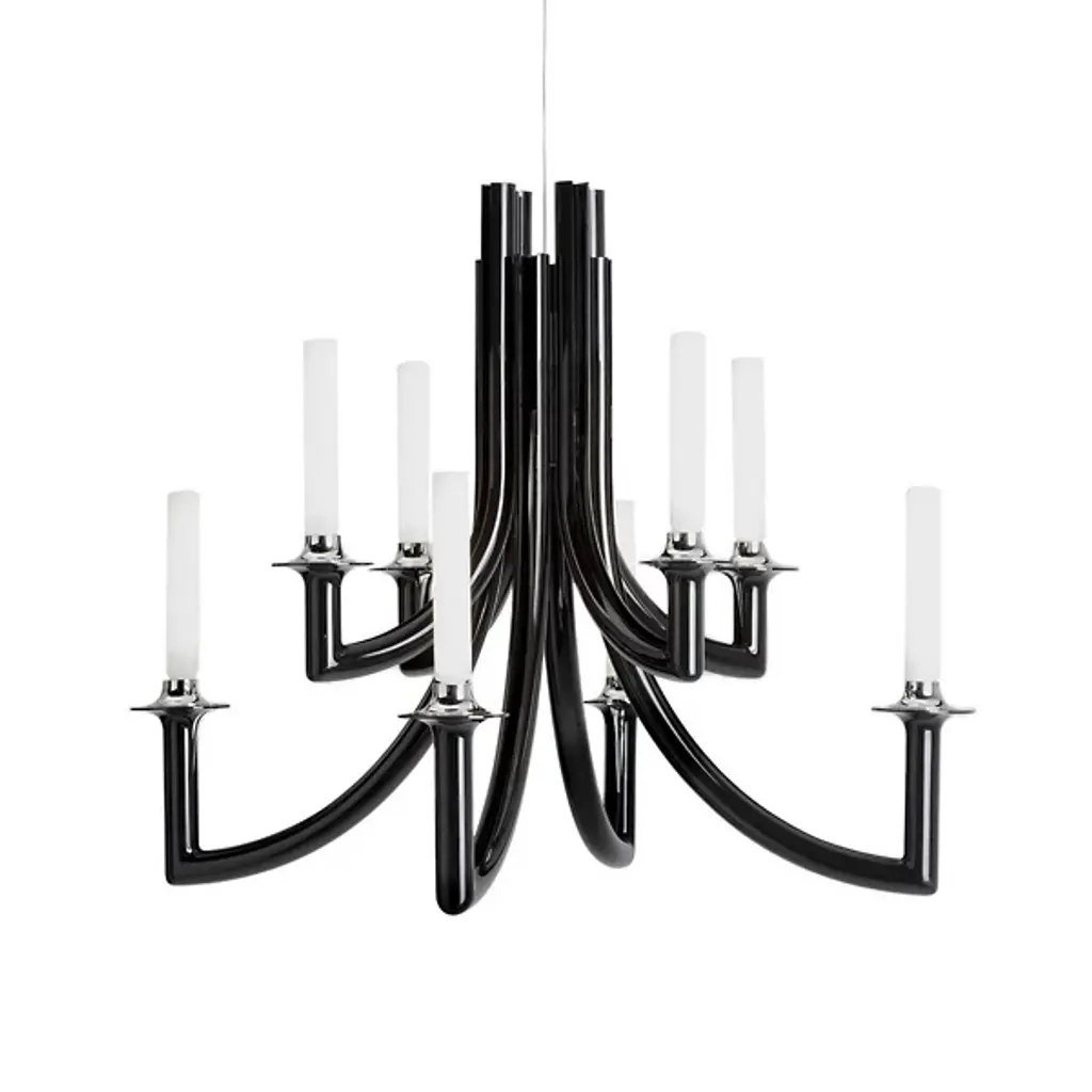 Presented by Kartell, the Khan Chandelier is crafted in Italy, inspired by a fusion of 18th-century eclecticism and contemporary minimalism. Designed by Philippe Starck, a renowned French industrial architect and designer, Khan features a fluid arrangement of metalwork, resulting in a captivating juxtaposition of candelabra arms that extend upwards at right angles to cradle faux candlestick lamping. It also boasts the innovative use of Kartell's polycarbonate 2.0., a groundbreaking material derived from renewable sources in the pulp and paper industry, earning the prestigious ISCC certification.