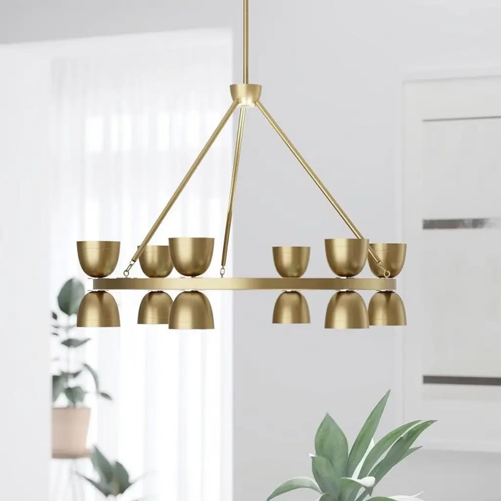 The Baland 31" 12 light chandelier features ceramic-inspired cups in Black with Polished Nickel rims. Six cups face up, and six face down, creating both direct and indirect light. Far from routine, this chandelier is the centerpiece of your space. Material: Steel, Finish Color: Brushed Natural Brass, Width: 31", Height: 23", Hanging Method: Stem, Lamping Type: LED, Number Of Bulbs: 12, Cri: 90, Color Temperature: 3000 Kelvin, Lumens: 2300, Dimmable: Yes, Moisture Rating: Dry Rated