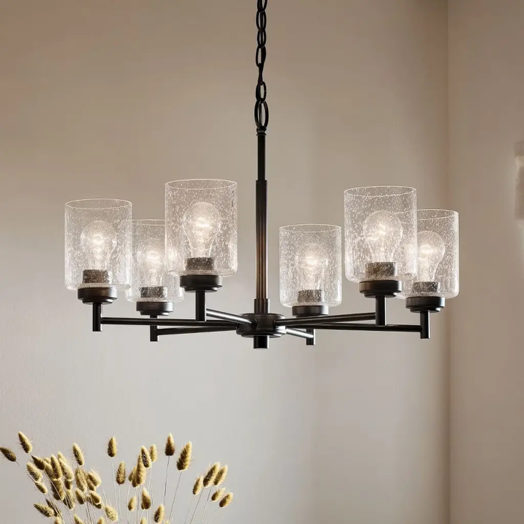 A classic design with a timeless feel, the Winslow 6-light chandelier is sure to brighten any space in your home. As versatile as it is stylish, Winslow's clear seeded glass filters light beautifully and is removable for ease of cleaning or replacement. Set its arms and glass in an upward or downward direction during assembly to achieve just the right look for industrial aesthetics.