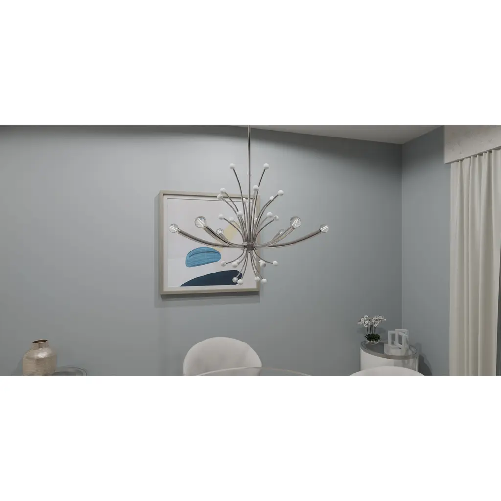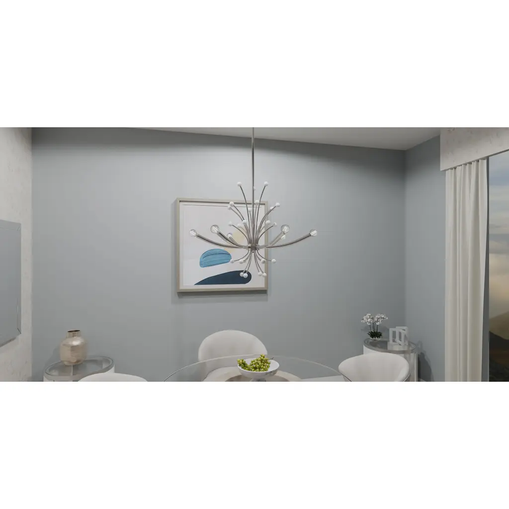 Kiera radiates on-trend, modern style. The captivating chandelier features a futuristic design with sleek, curving lines and small white spherical accents. Kiera is available in two beautiful finishes - choose brushed weathered brass for a slightly retro vibe or polished nickel for a timeless shine.