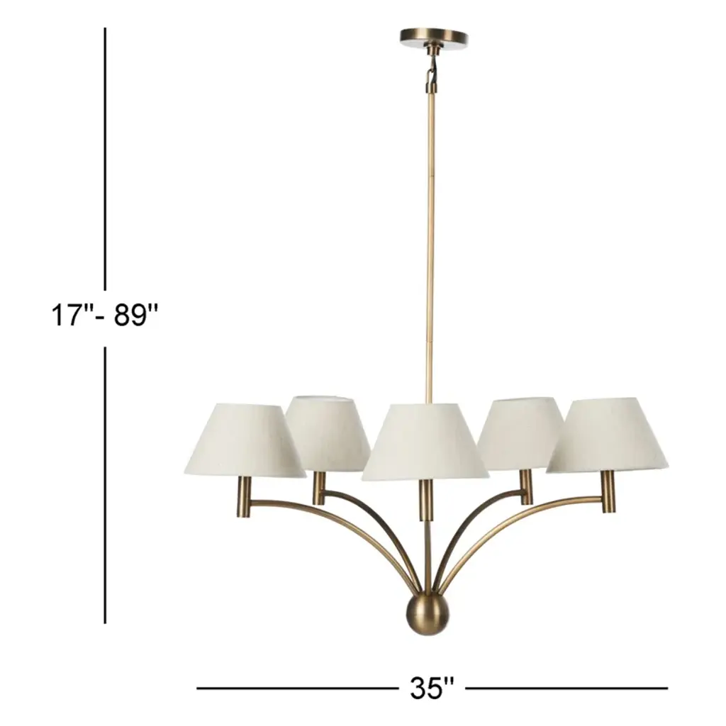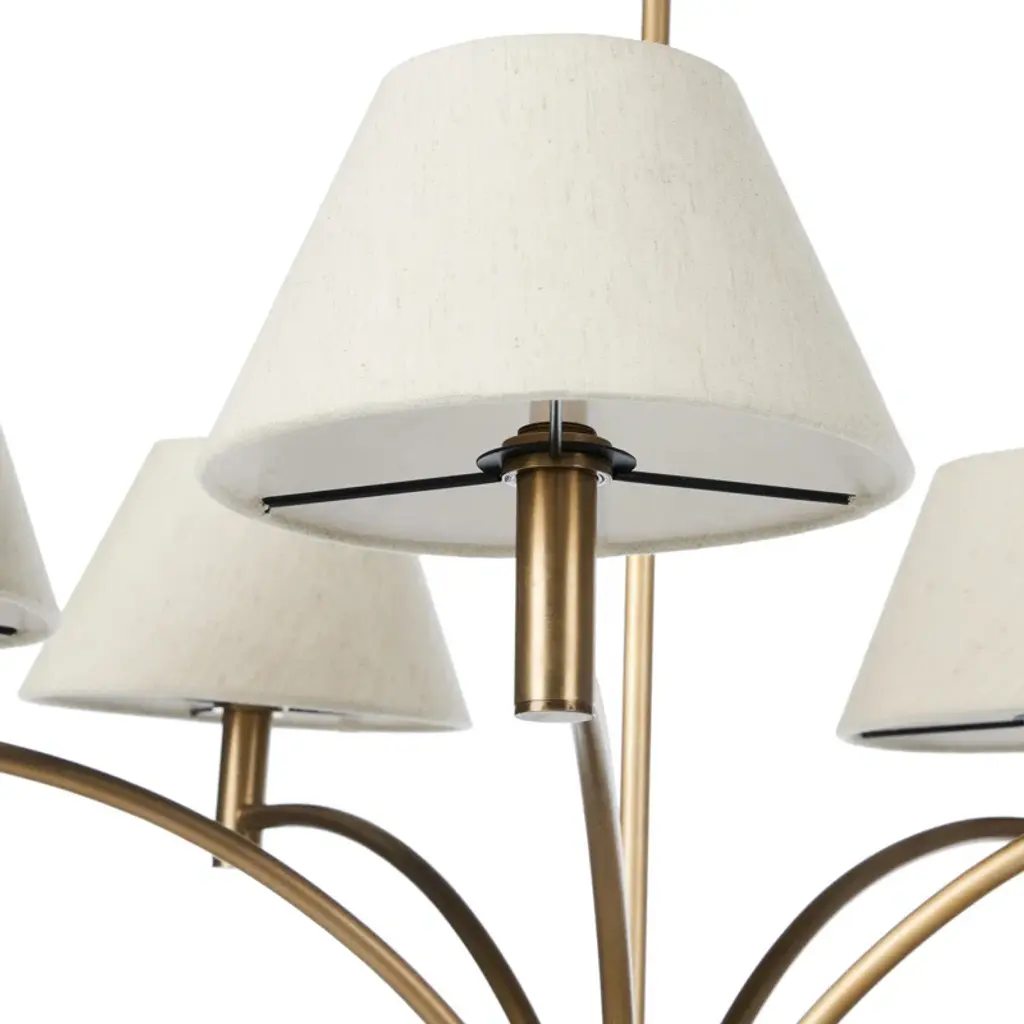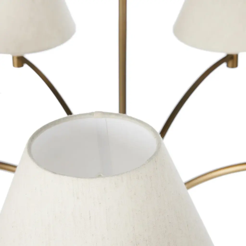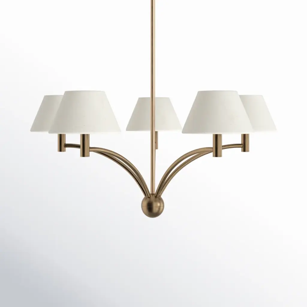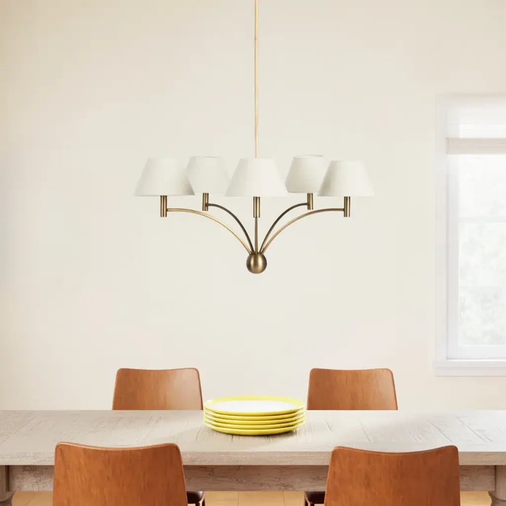 Curved arms and a central ball detail give this chandelier a traditional silhouette, while low tapered shades provide a fresh update. It is designed for versatility and can be hung on slanted ceilings or converted to a flush mount with the included extra pipe piece.