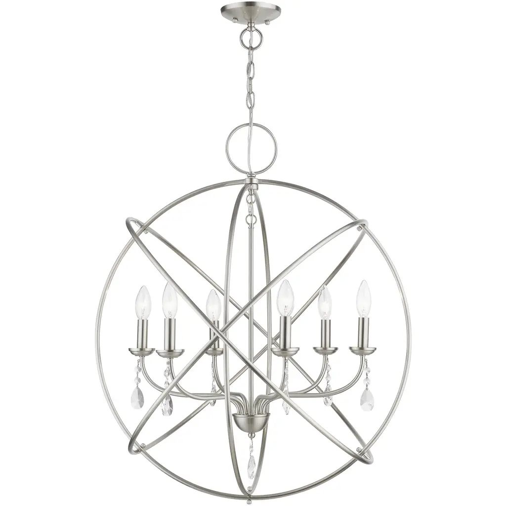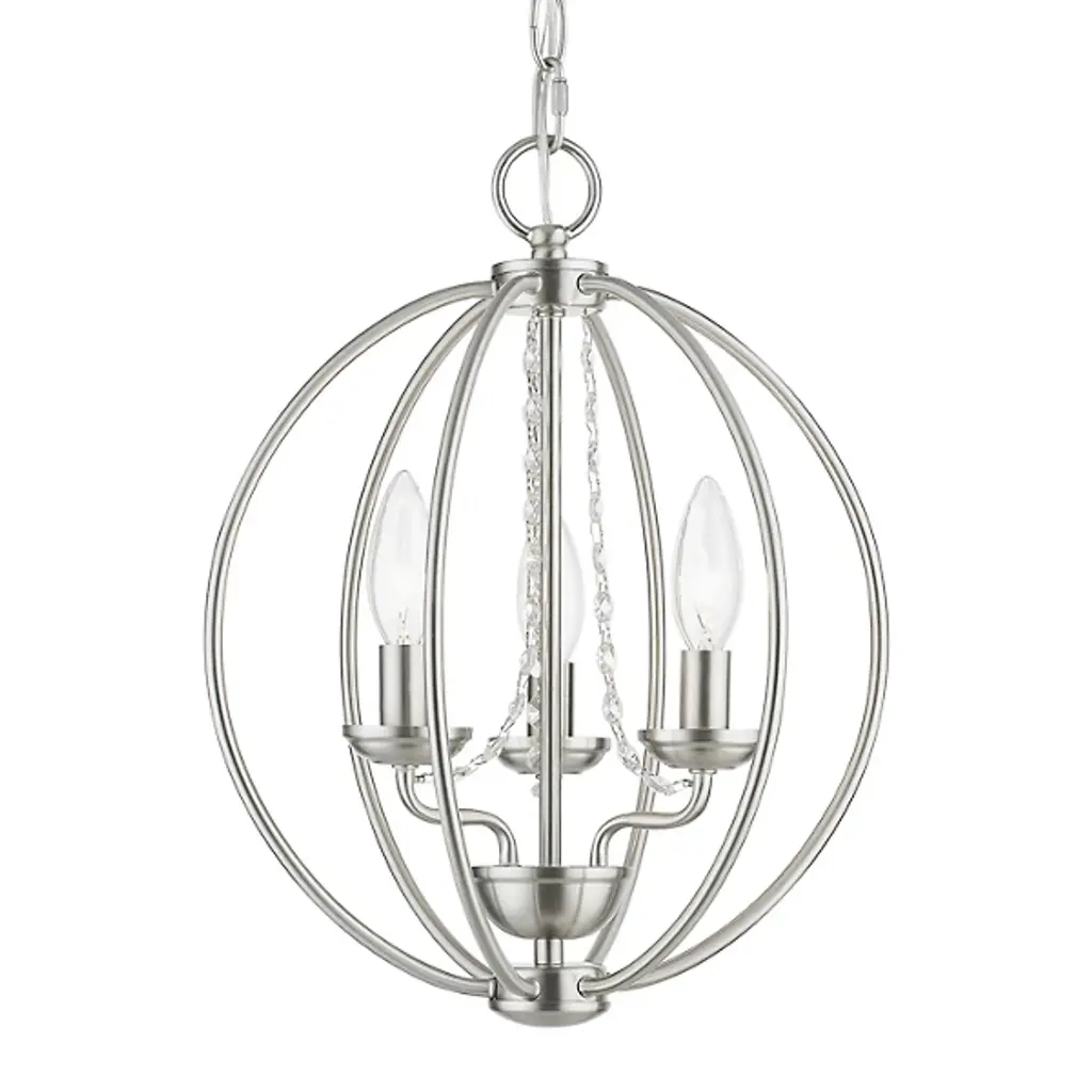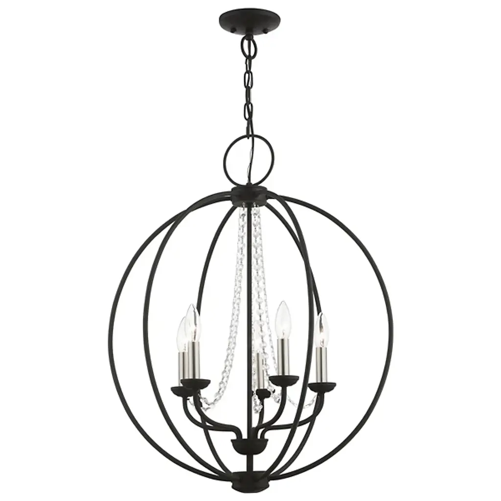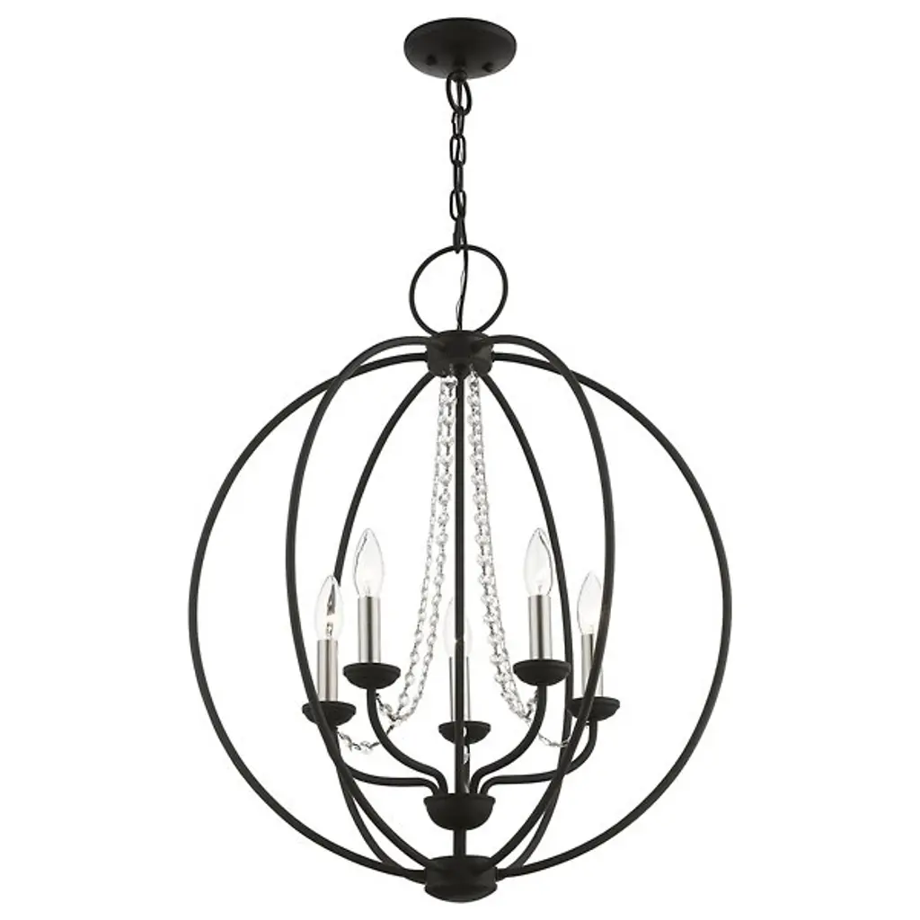 The Kimmy Chandelier is a contemporary piece of luxury by Alder & Ore. It features a multi-pronged candelabra at the center of the orbed silhouette, with a decadent arrangement of crystals draping from within. Hanging from a minimal chain link and canopy on the ceiling, the Mia may be displayed solo or in multiples for an elevated illumination experience.