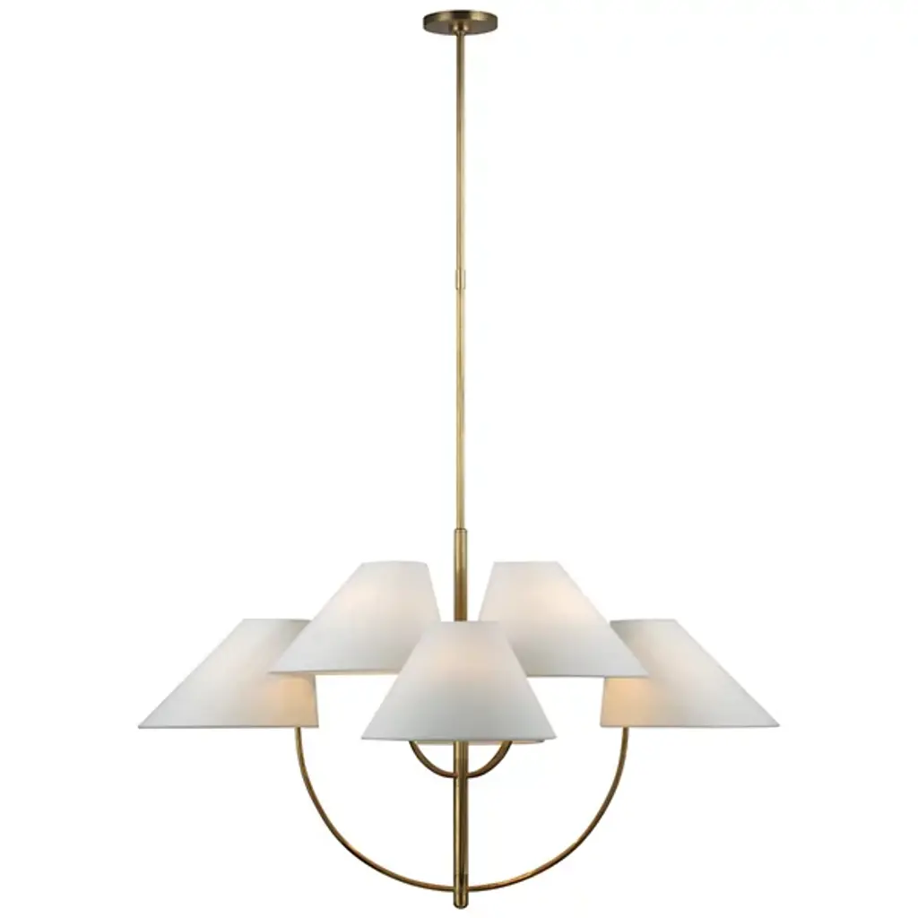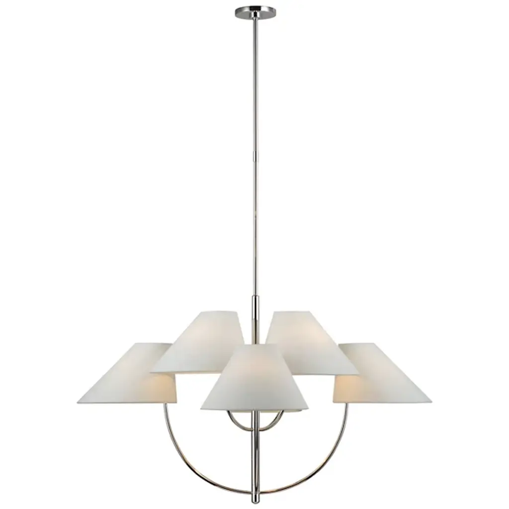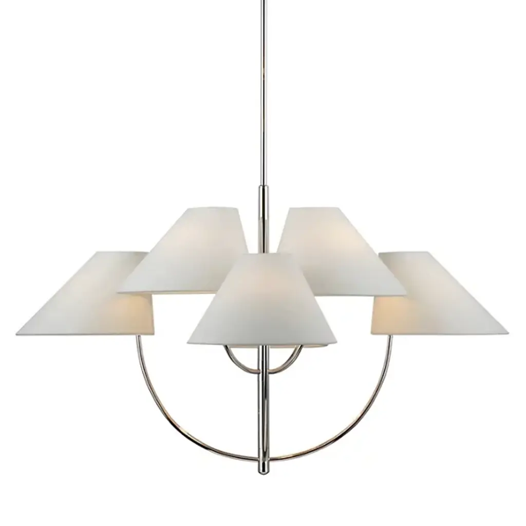 The Kinsley 2-Tier Chandelier by Visual Comfort Signature, formerly known as Visual Comfort, has a sleek, modern feel as it balances an array of crisp, angled linen shades at different heights at the end of gracefully curved arms. The minimal, slender stem suspending this two-tiered arrangement allows the clean lines and soft curves found throughout the rest of its form to shine while bringing a welcoming layer of illumination to surroundings. Simple and sophisticated, this design adds a dynamic, practical touch to its environment.