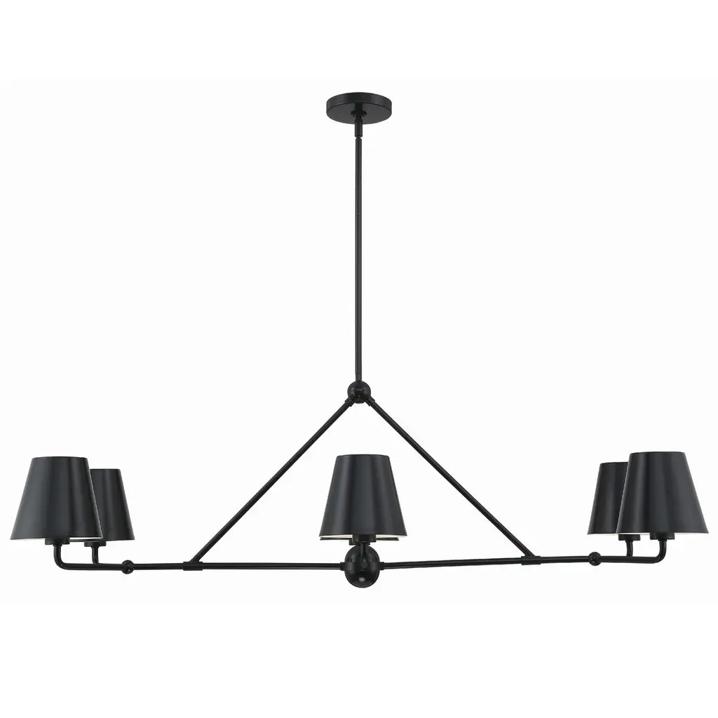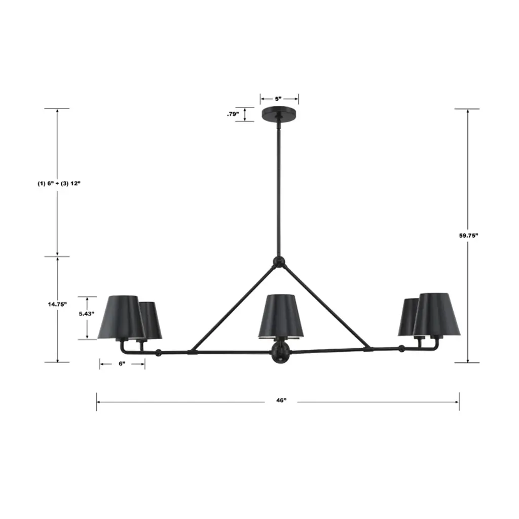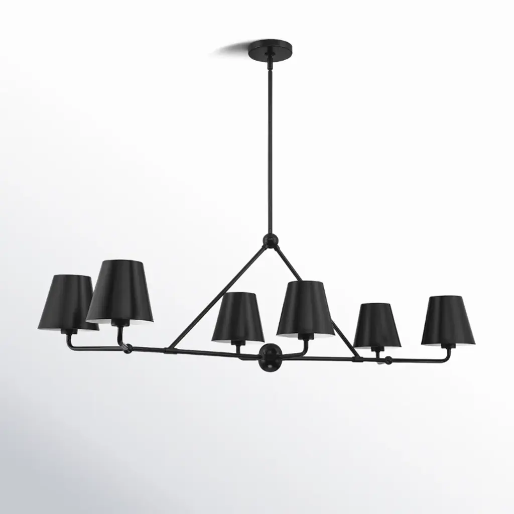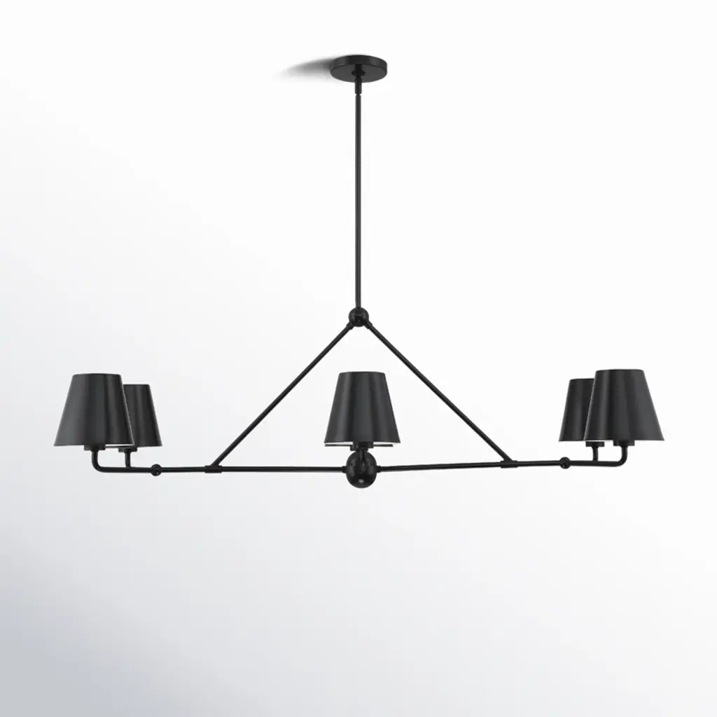 This 6-light linear chandelier is a versatile piece that fits nicely over dining tables and kitchen islands. Stylish, mod-inspired, and minimal in design, it features a clean-lined silhouette and a fixture crafted from steel with a distinctive finish. Six empire shades surround corresponding bulbs, which are sold separately and compatible with dimmer switches. This chandelier hangs with the help of a downrod and a circular canopy that can be installed on sloped ceilings. It's also damp-rated for safe use in high-moisture environments.