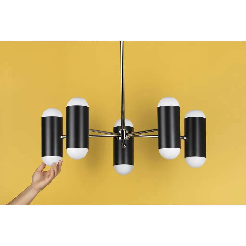 A futuristic vision, Kira is a charming, fashion-forward light fixture that is sure to make waves. In both the chandelier and wall sconce styles, globe bulbs nestle perfectly in the cylindrical, pill-like forms, diffusing light in opposite directions for a bold effect. Available in soft white, soft black, and aged brass, Kira comes as a wall sconce, 10-light chandelier, and 12-light chandelier.