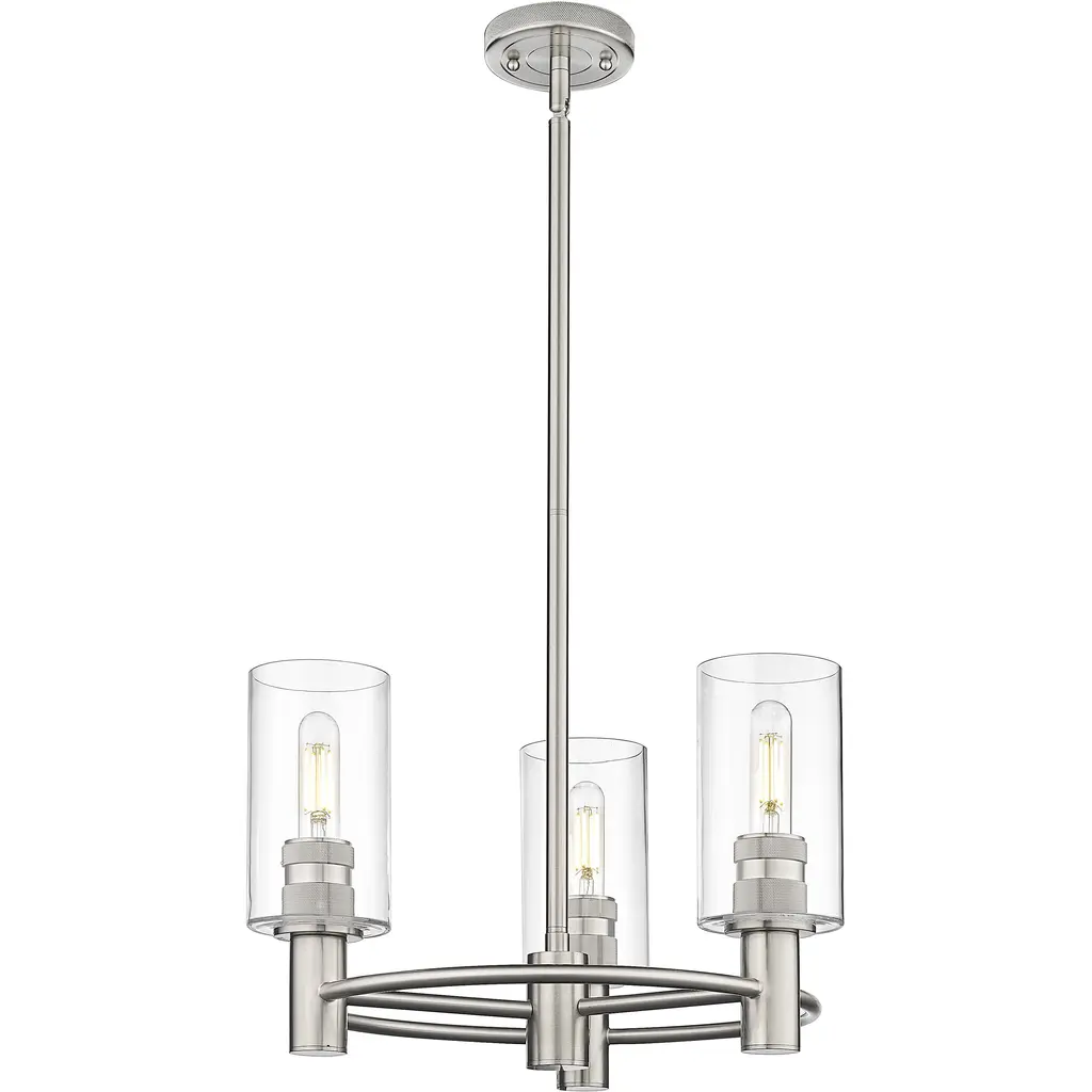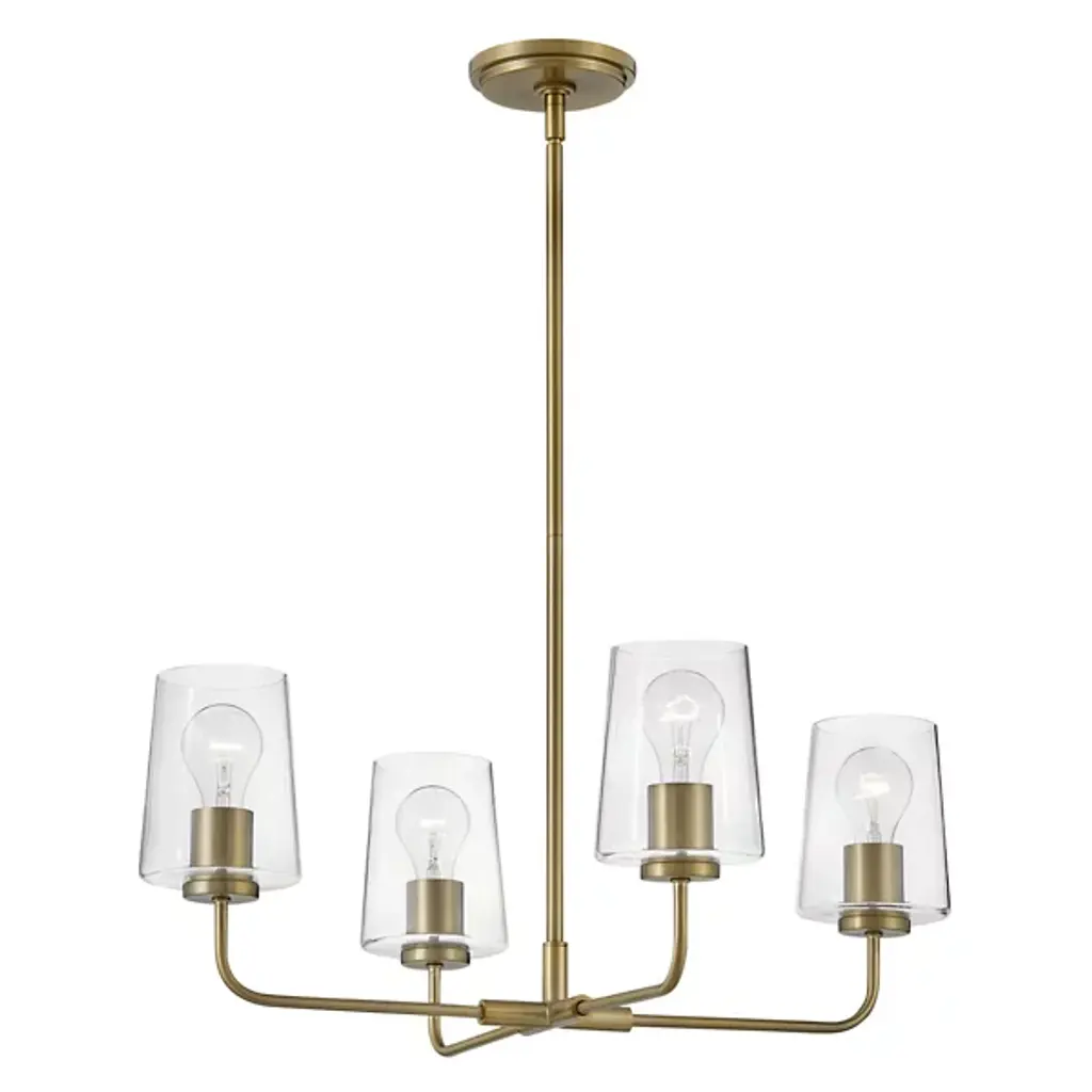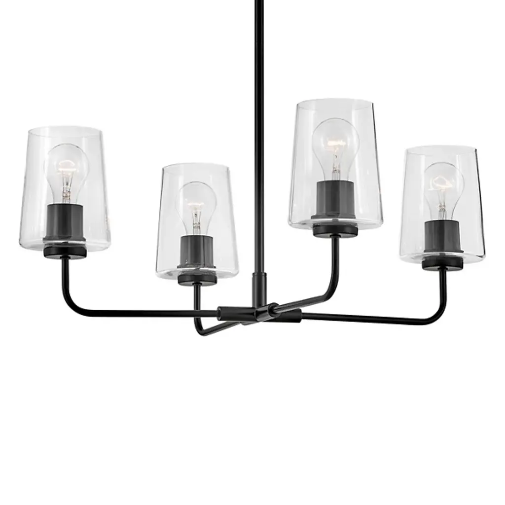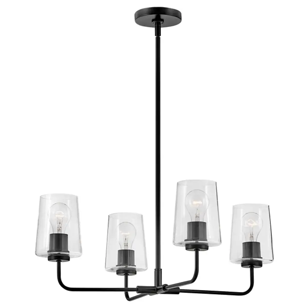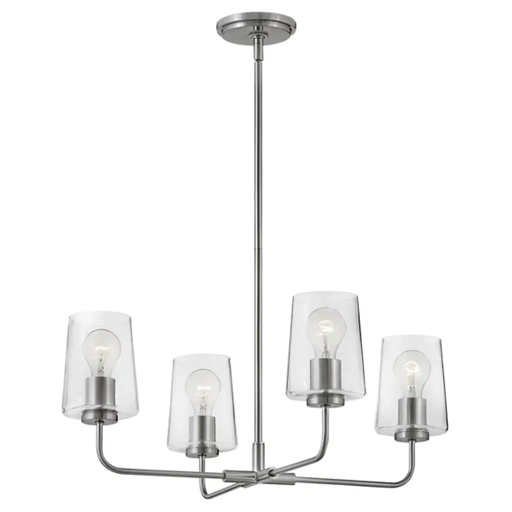 The Kline Chandelier from Lark delights by taking a captivating transitional form and bringing it back to basics. An excellent choice for high-ceilinged spaces, this sleek steel piece sweeps down along a single slender downrod, securing four upward-curving arms at an intersection with a robust array of collars. Each arm ends in a single-socket lamp set within an inward-beveled glass shade, and the structure is simple; vintage-style lamps can add a touch of retro intrigue as they extend an even ambiance out in all directions.
