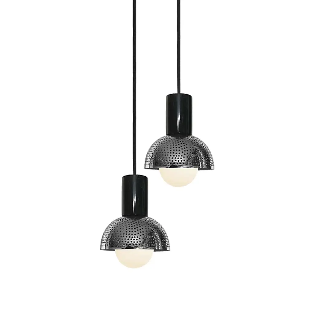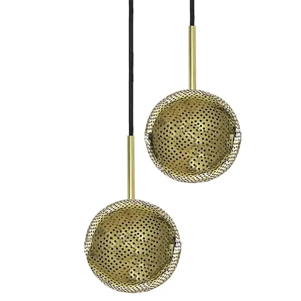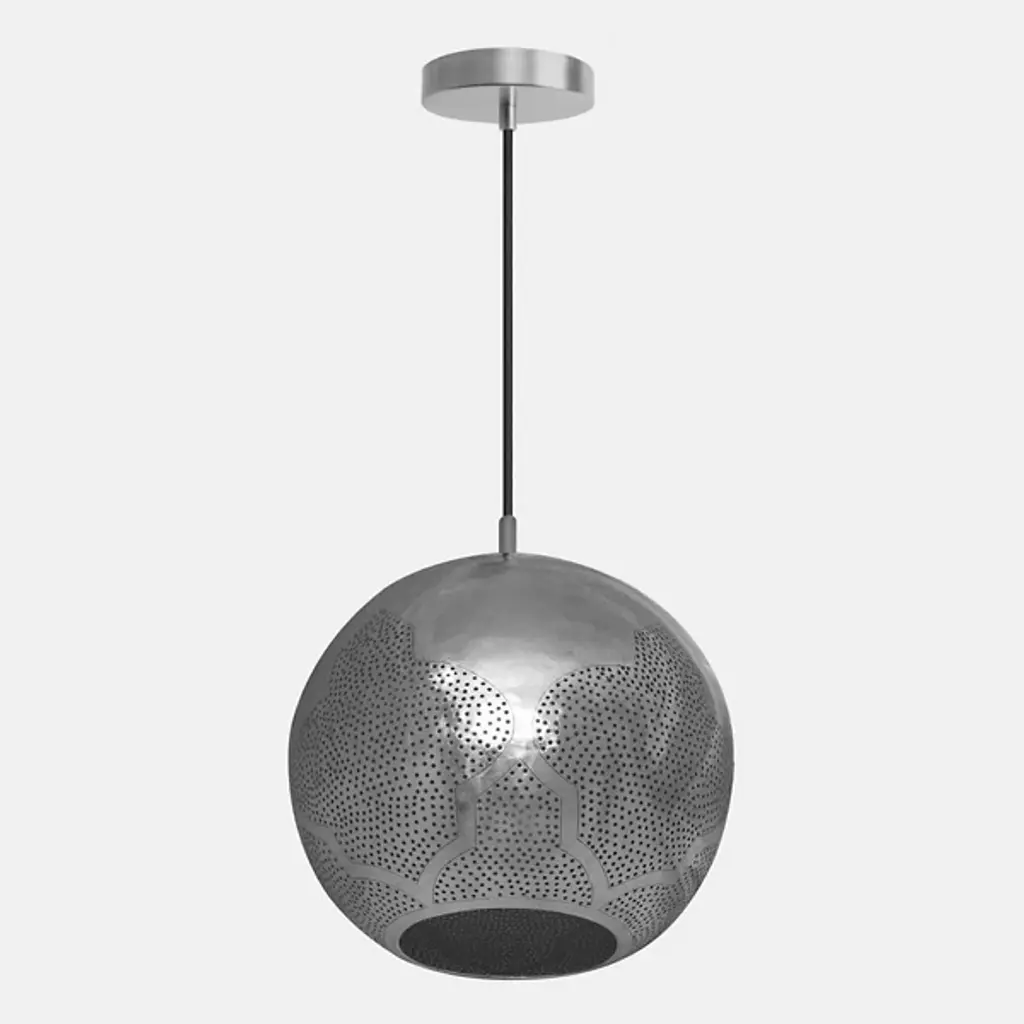 The Kora Chandelier from Dounia Home provides a welcome, artisanal appeal to its surroundings with a spherical, handcrafted character. The lamp is handcrafted by Moroccan artisans, showing off the enduring elements of individual craftsmanship. Suspended from a circle canopy, it sends down slim cables to damp-rated lamping inside spherical metal shades with pinhole openings. The handcrafting helps each element of the fixture stand out, shining a mix of reflected warmth and precise light outward through the pinhole piercings to cast unique shadows around the fixture.