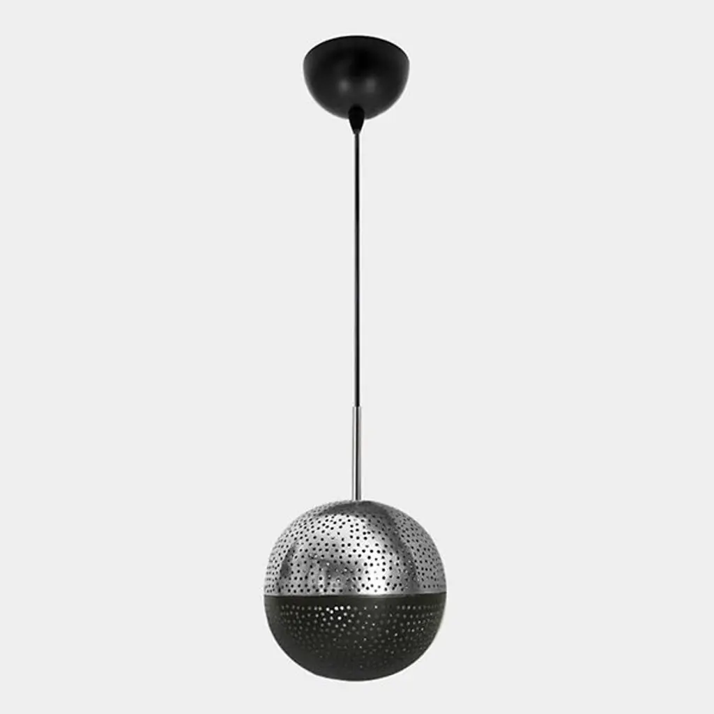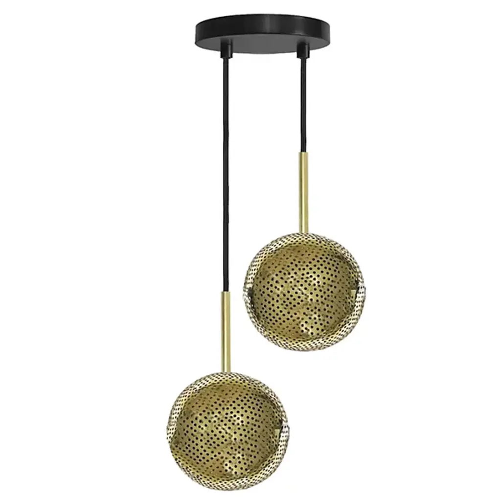 The Kora Chandelier from Dounia Home provides a welcome, artisanal appeal to its surroundings with a spherical, handcrafted character. The lamp is handcrafted by Moroccan artisans, showing off the enduring elements of individual craftsmanship. Suspended from a circle canopy, it sends down slim cables to damp-rated lamping inside spherical metal shades with pinhole openings. The handcrafting helps each element of the fixture stand out, shining a mix of reflected warmth and precise light outward through the pinhole piercings to cast unique shadows around the fixture.