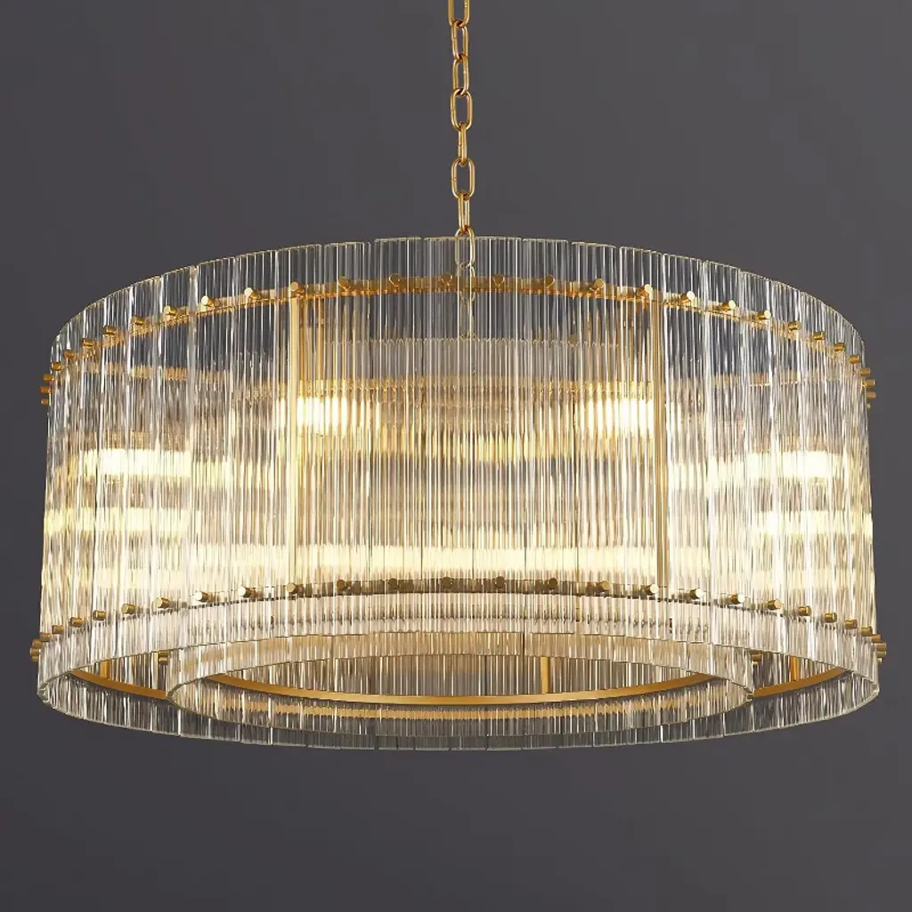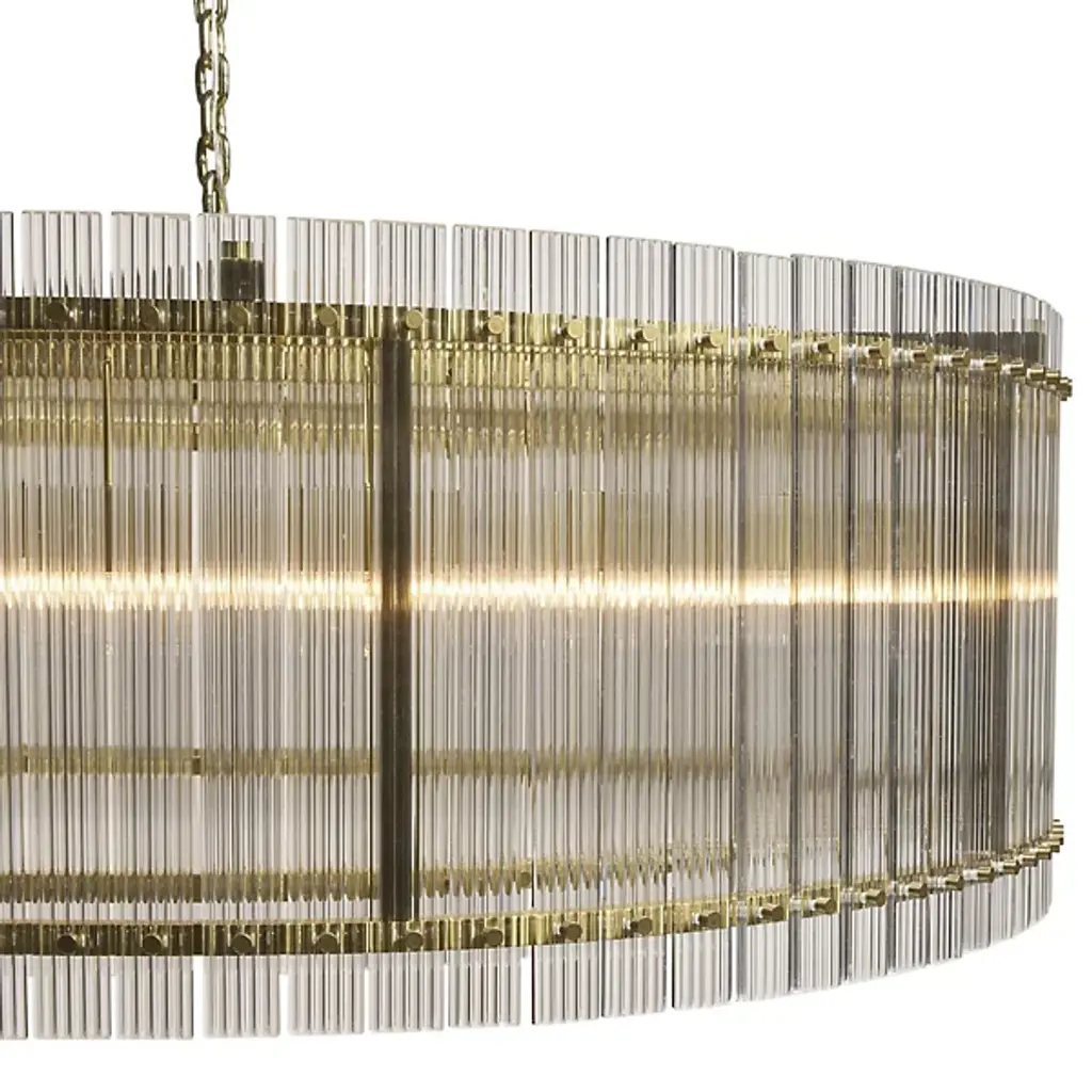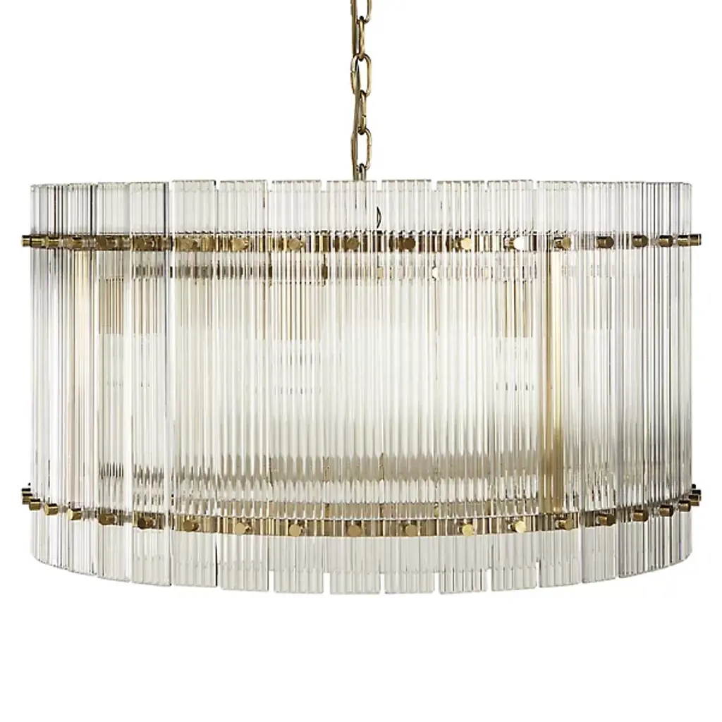 The Kore Chandelier from Sunpan provides a stunning display of radiance to any space with this dazzling, eye-catching modern chandelier. Its large, clear, fluted glass design creates a beautiful play of light, while the complementing metal frame in a luxurious brass finish adds a touch of elegance and sophistication. Perfect for making a bold statement in dining rooms, living areas, or entryways, this chandelier combines contemporary style with timeless charm, transforming any room into a luminous and inviting space.