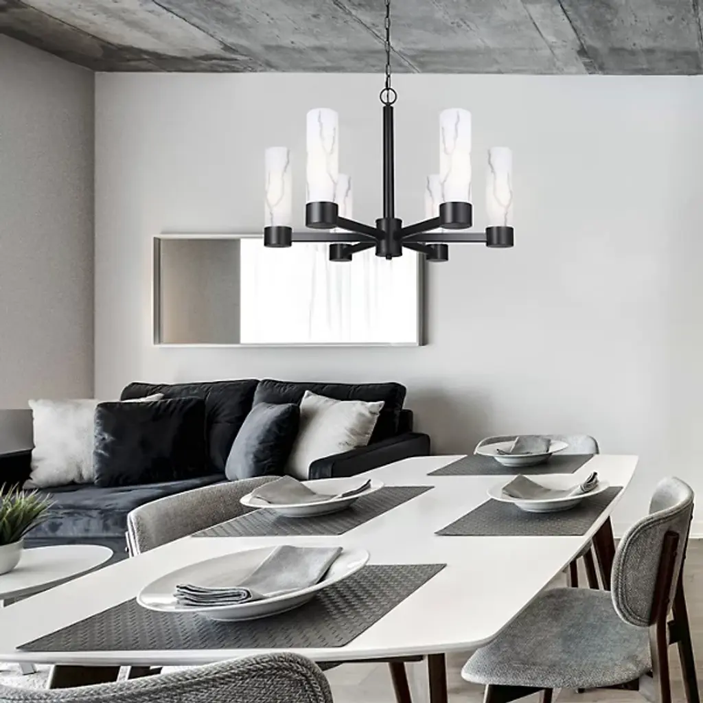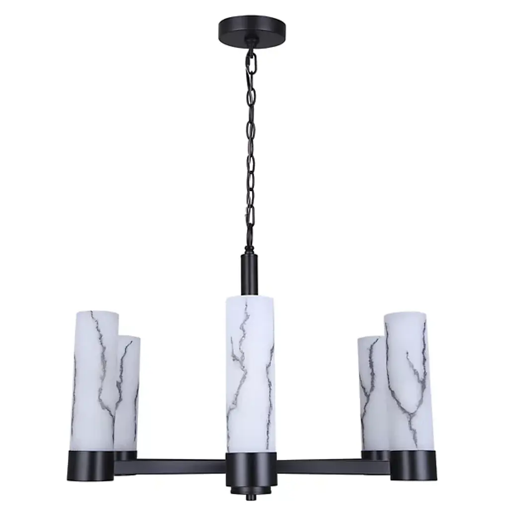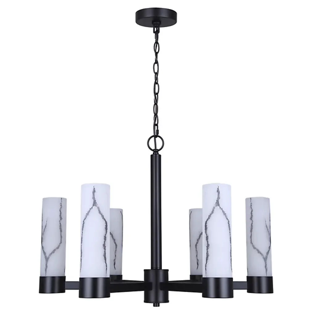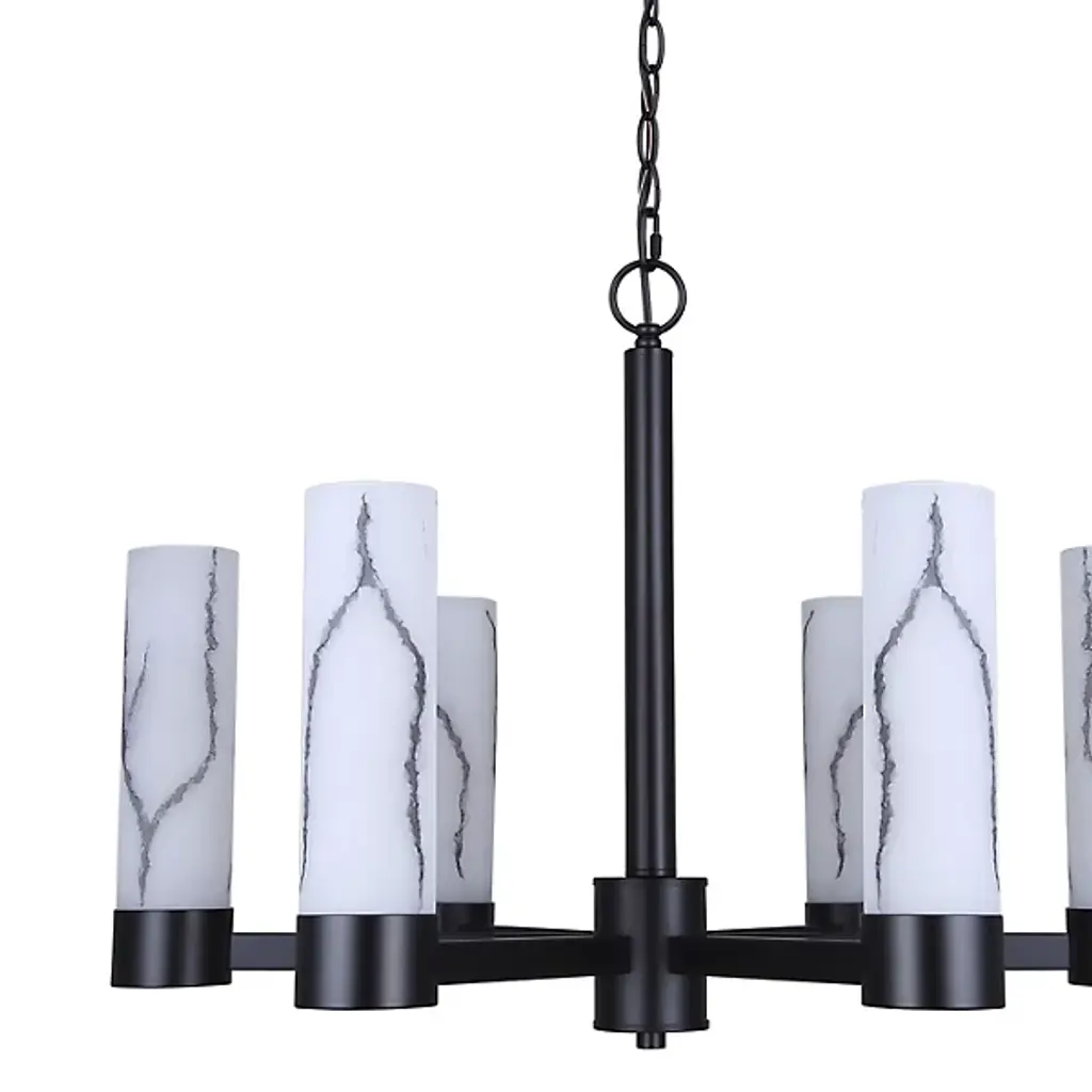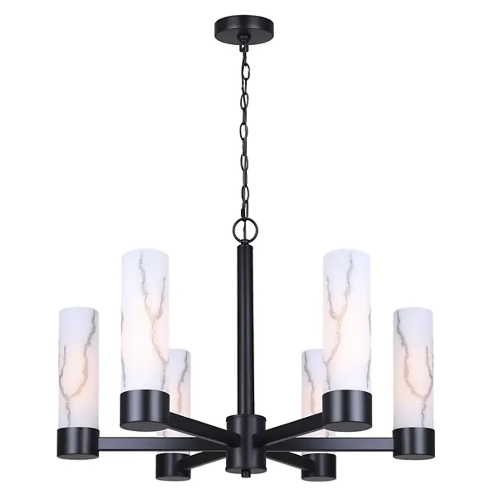 The Kristella Chandelier from Canarm arranges six marble-patterned glass cylinders in a radial pattern for dramatic overhead lighting. Each glass tube contains subtle veining that appears to glow from within when illuminated. The substantial chain suspension allows for custom height positioning. This chandelier works beautifully in dining rooms where intimate lighting enhances meal experiences. The thoughtful engineering ensures stable, wobble-free performance even in homes with active families. Its proportions make it suitable for medium-sized rooms without overwhelming the space.