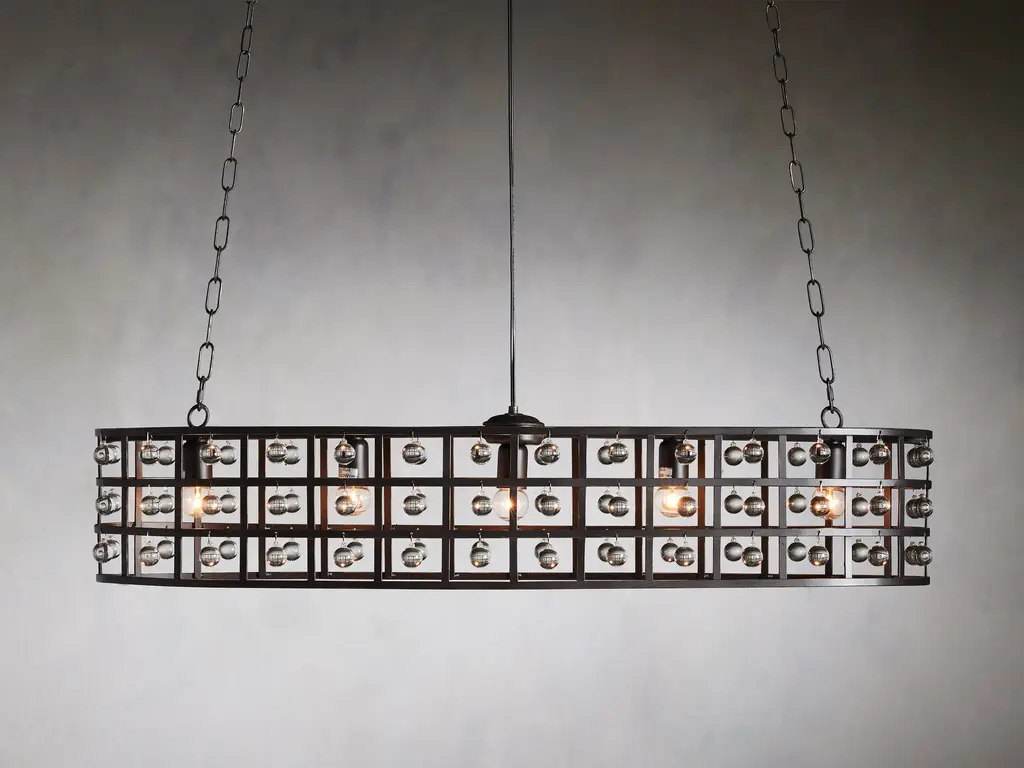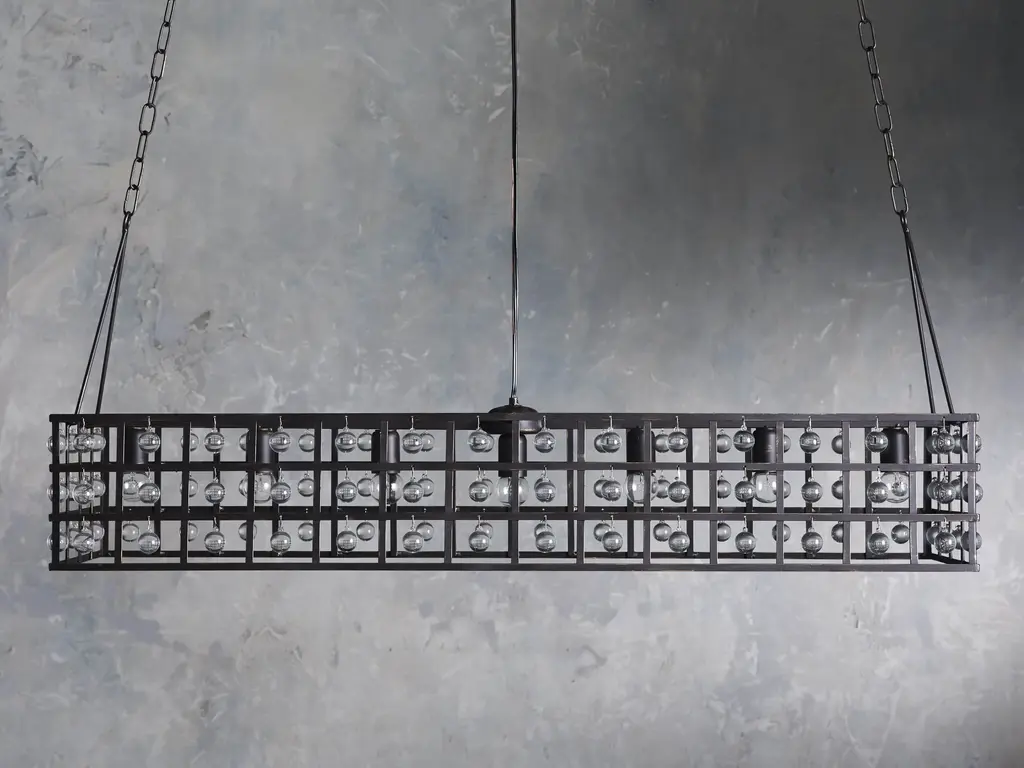 Industrial chic meets modern flair in this eye-catching chandelier. Crafted in Italy, this fixture’s iron cage frame with antiqued patina is inspired by vintage factory lighting. Glass crystal spheres add unexpected glamour.