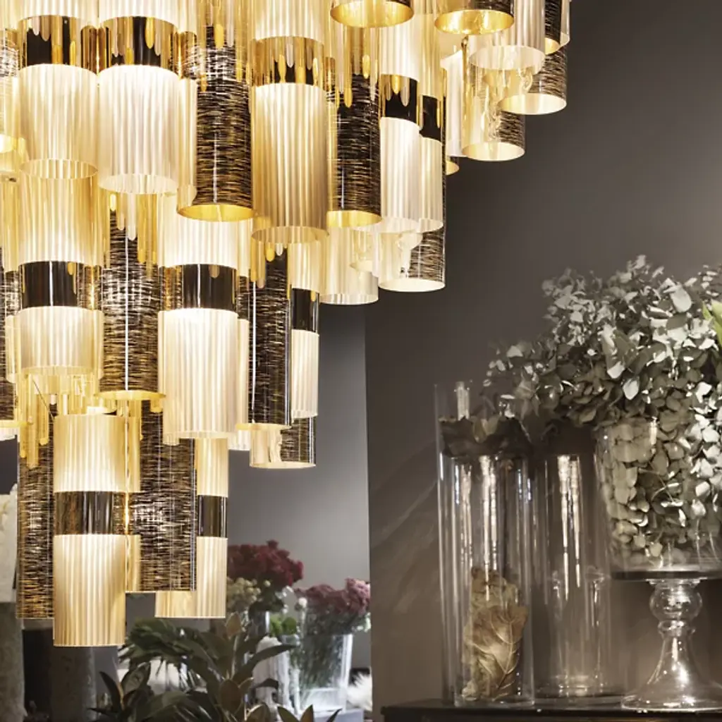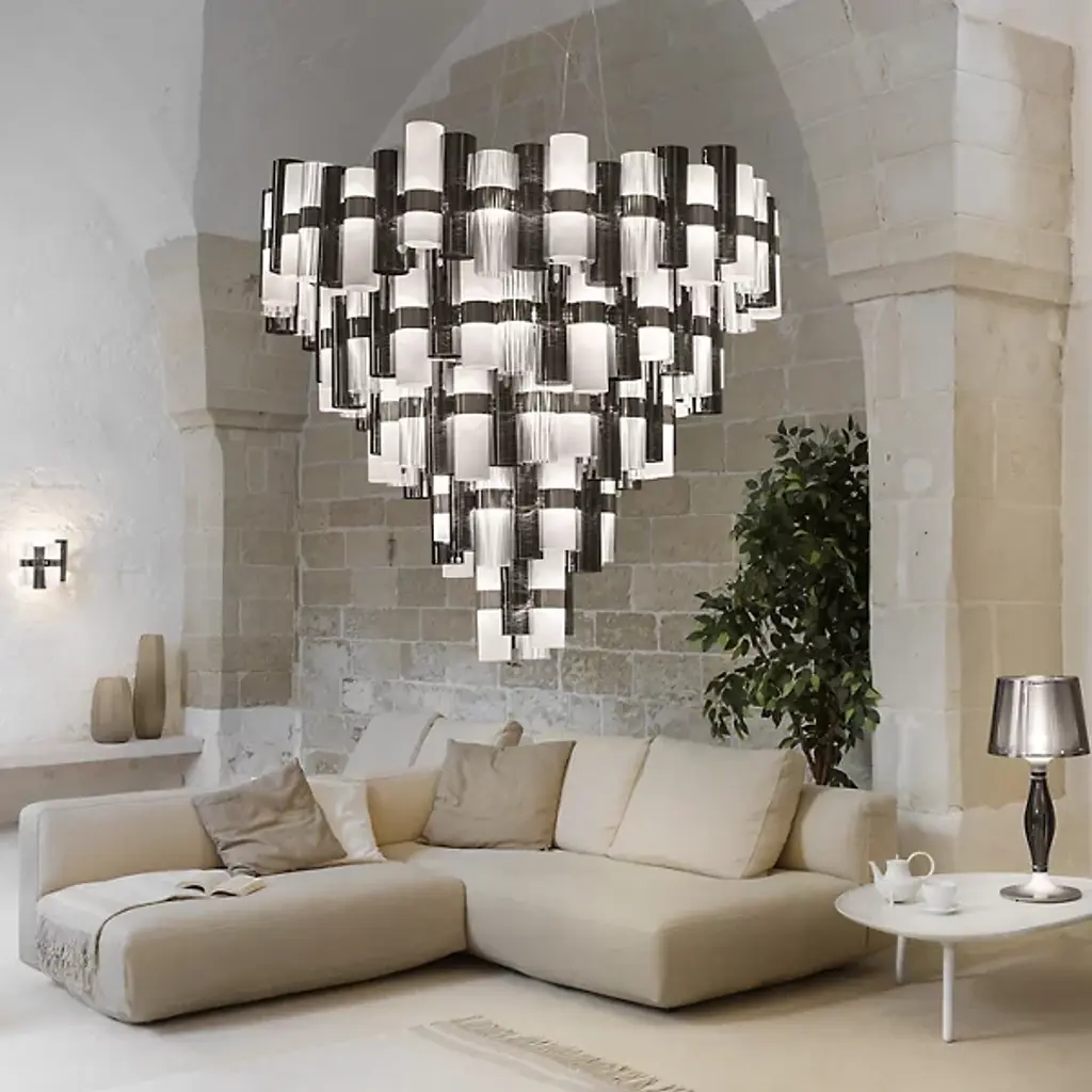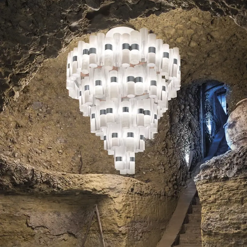 Bringing an extraordinary touch to spaces, the La Lollona LED Chandelier by Slamp comes from fashion and industrial designer Lorenza Bozzoli. Created as a tribute to the roaring 50s, this chandelier dresses spaces up much like a collection of jewelry, featuring a mix of sophisticated gradient chromatics, metallization, laced patterns, and geometric designs. Composed of technopolymer cylinders, this artful and functional design is a beautiful and brilliant way to add a bright touch to your home.