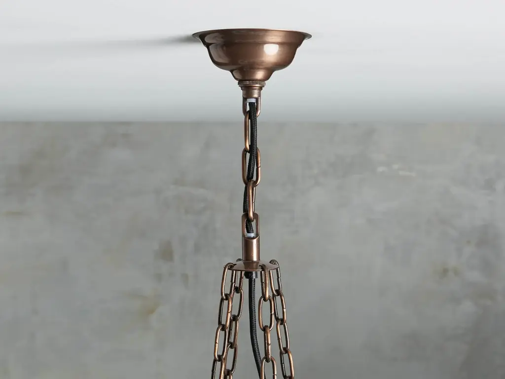 Lustrous, hand-antiqued mirrored-glass panes of various sizes make up the unique shape of our Moroccan-inspired Laila Lighting Collection. Finished in Antique Copper with just the right amount of shine, this chandelier will add soft, warm light to any room.