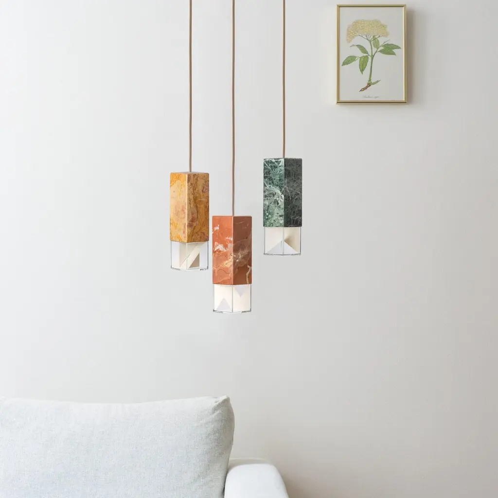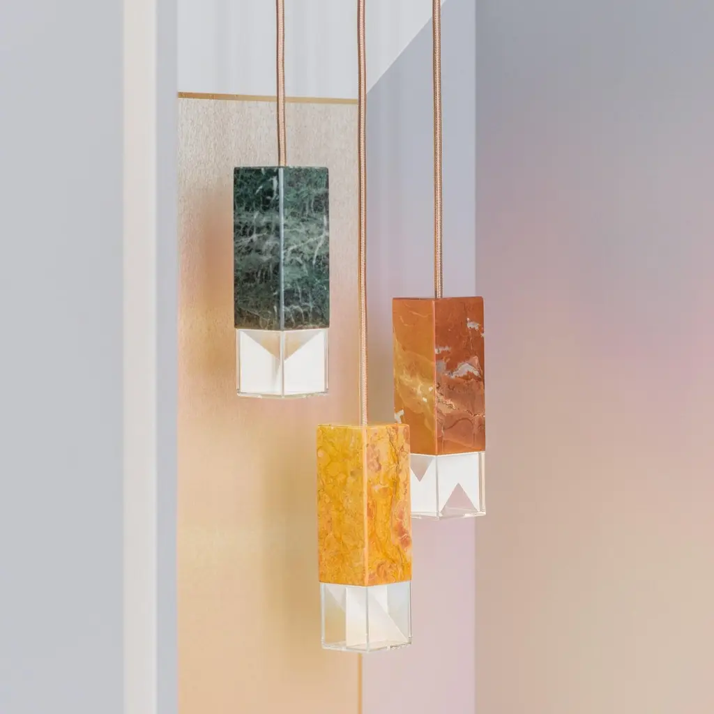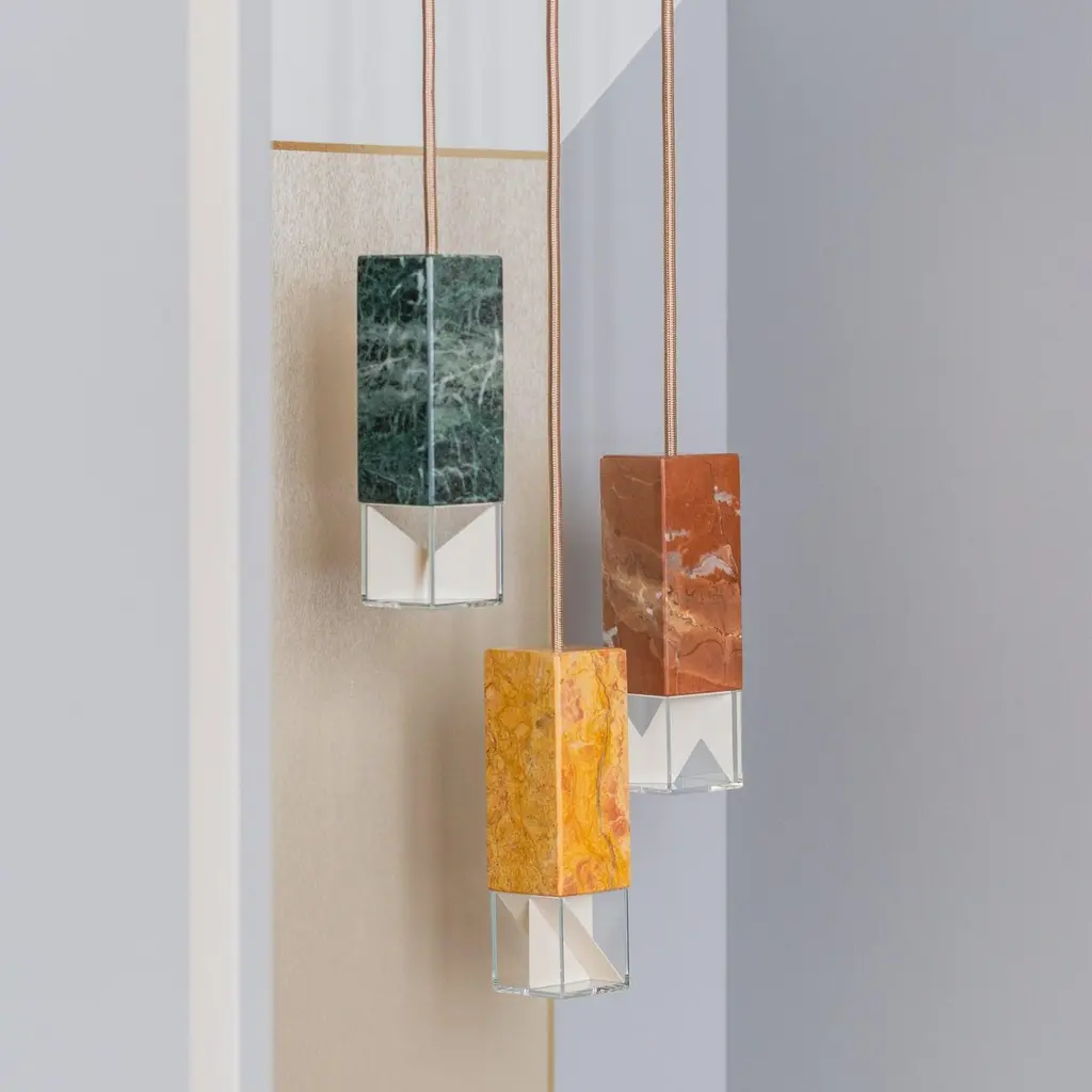 Lamp one trio chandelier in brass by FormaminimaLimited editionDimensions: 30 x 30 x H 68 cmMaterials: Red Collemandina, Green Alpes, Royal pink yellow Satin solid brass, crystal glass diffuser Limoges biscuit-finish porcelain sheetsUltra- thin anti-reflection crystal diffuserInside- diffuser Limoges biscuit-finish porcelain sheetsSatin brass ceiling rose H 5 x 5 x 5 cmLight source supplied per lamp:LED 1xG9 max 2.6W, 50-60Hz G9 connection320lm 2700K Rc 80 EU standard compliantVoltage: 220-240v (120v available upon request)Supplied accessories:Adjustable fabric cable: 2 x 0.75 Ø 6.2 mm L 2mMounting kit: screws UX Fischer screws (2x)Ø 6mm x 30mm, satin brass ceiling roseDecorative pendant lamp for indoor use.Both The Single Suspension series as well as The Chandelier series are characterized by the same endless passion for simplicity and attention for details that best representus. The inspiration, as well as the genesis of the entire design process, that led to the creation of the collection, belongs to the world of Porcelain, to its surface andstructural characteristics. Therefore, our project was born from the exploration of two-dimensional geometries on one hand, and on the other one, from the design intentaimed at researching lightness and thinness, bringing them to unforeseen results. As a consequence, this was a path subject to curiosity, to research, to the story of how alight beam may transform the features of a marble surface becoming translucent, and a porcelain sheet turning as thin as an eggshell.Formaminima is an emerging brand within the Italian Design panorama, prone to exploring the concept of object itself, in the field of lighting and product designin its broadest sense. This exploration starts in the first instance from the tradition, from the artisan mastery and that making full of charm, care, and perseverance.Each project is in fact crafted in those same places where the know-how is handed down and kept for generations, exclusively in our territory. Carefully selected workshops, ateliers, and studios become our precious partners in the creation of every single piece, conceived and designed by us. Therefore, in this latter, multiple knowledge is merged, especially that linked to high-quality materials, production processes, and an innovative aesthetic. Thus to achievewhat for us represents a contemporary Design Sleek Poetry.We create value through the masterly realization of unique pieces, as well as minimizing the intermediation between the Design product and its audience. Hence our projects result in the outcome of a direct collaboration between our designers and the excellence of Italian craftsmanship, along with its valuable know-how. To this end, we believe that a slow design process, together with its time of thought andresearch, is essential for what we believe Good Design may be.So this latter, passing from the inspiration to the concrete realization of each of our design creation, arrives directly to the customer.