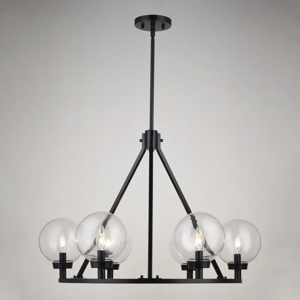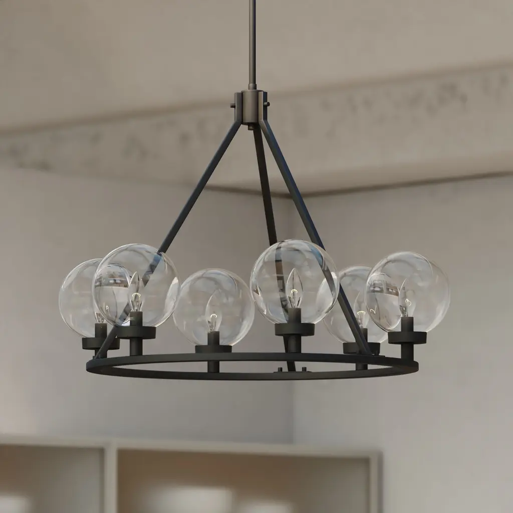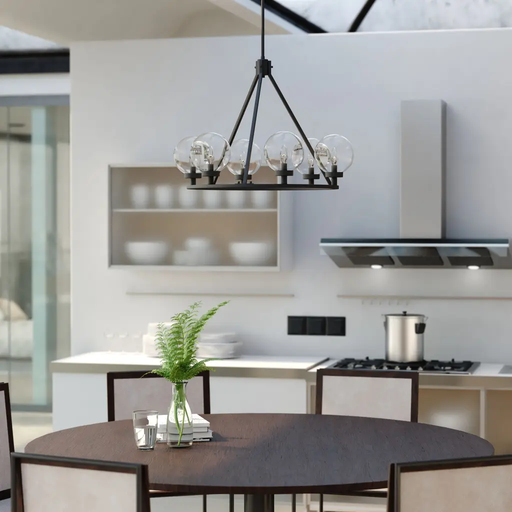 The Lander interior lighting collection is contemporary style with flair. A distinctive metal ring finished in matte black supports and highlights the clear glass globe shades. Hung with down rods suitable for vaulted ceilings, this chandelier light fixture is a perfect addition to your dining area or any other living area where a little extra style is desired.