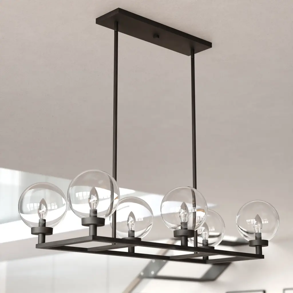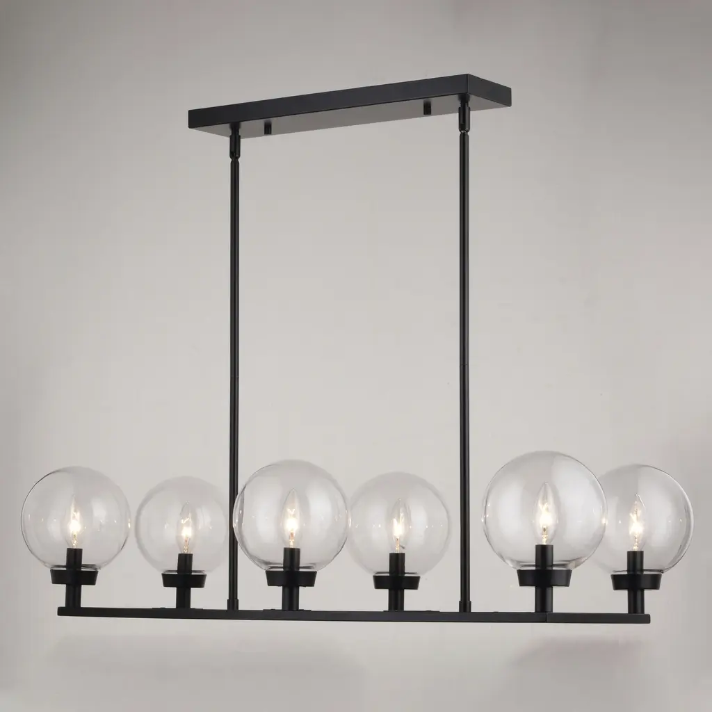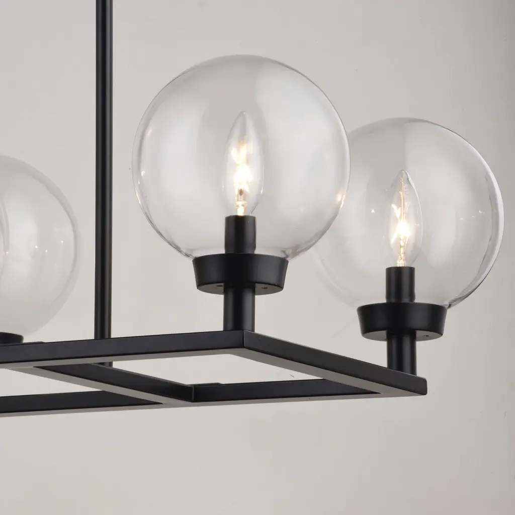 The Lander indoor lighting collection is contemporary style with flair. Distinctive arms finished in matte black support and highlight the clear glass globes. Hung with downrods suitable for vaulted ceilings, this linear chandelier is a perfect addition to your kitchen, dining area, or any other living area where a little extra style is desired.