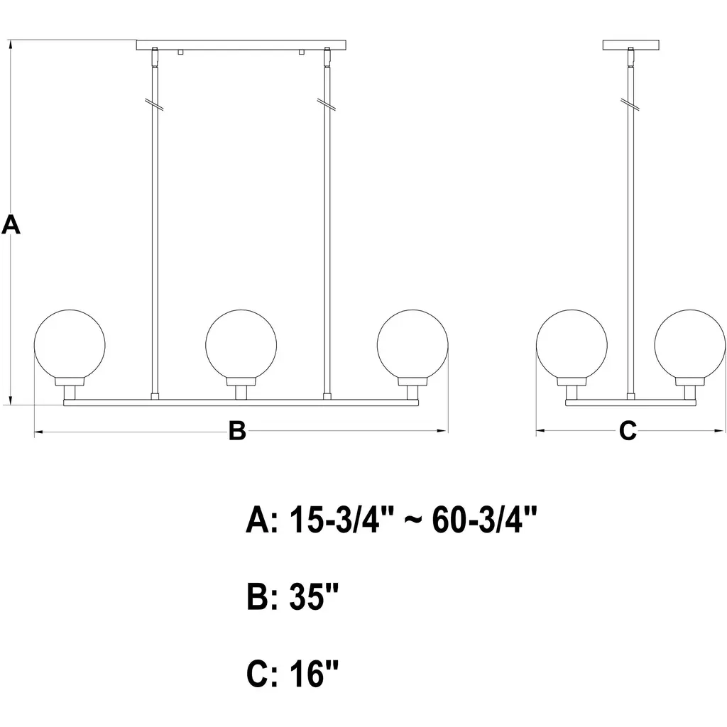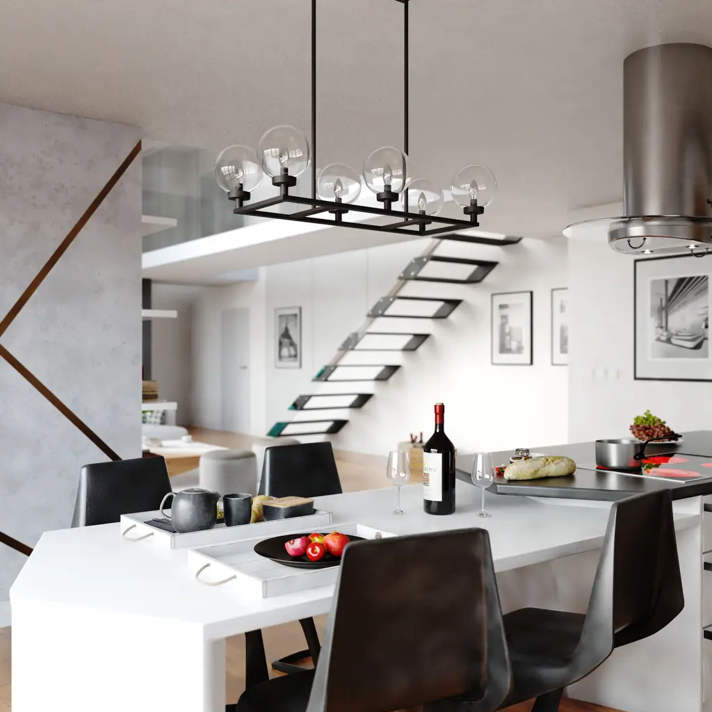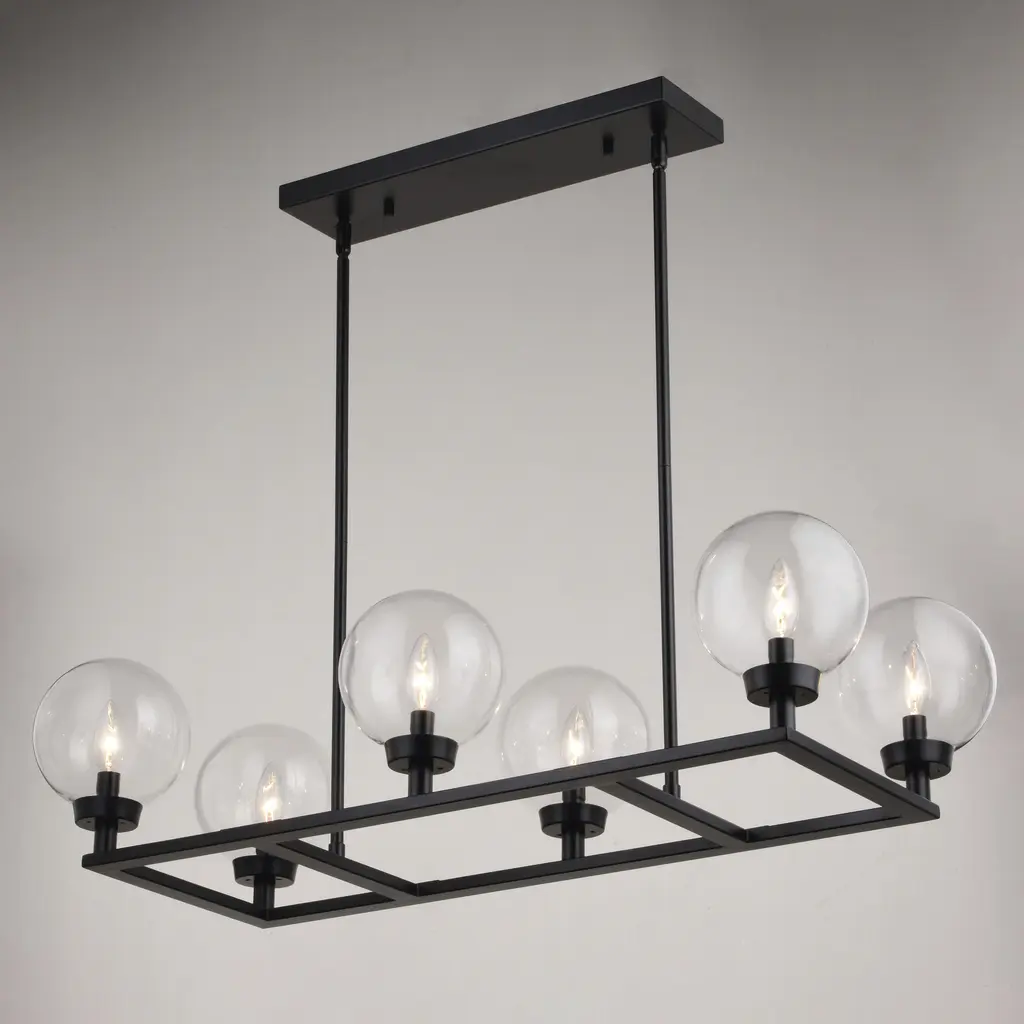 The Lander indoor lighting collection is contemporary style with flair. Distinctive arms finished in matte black support and highlight the clear glass globes. Hung with downrods suitable for vaulted ceilings, this linear chandelier is a perfect addition to your kitchen, dining area, or any other living area where a little extra style is desired.