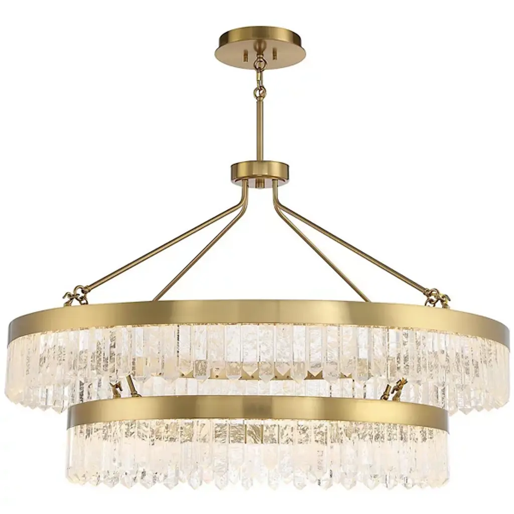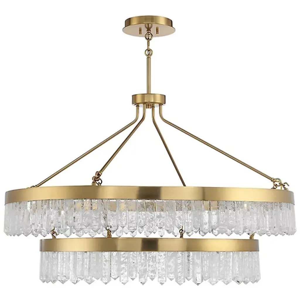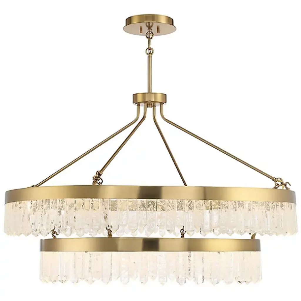 The Landon LED Chandelier from Savoy House is a dazzling blend of sophistication and transitional elegance. Crafted from premium metal, it features exquisite calcite crystal shades that emanate an inviting glow provided by an integrated LED. With two tiers of shimmering beauty, this chandelier adds depth and dimension to your space. Supported by slender arms and secured by a downrod and ceiling canopy, it is as durable as it is refined.