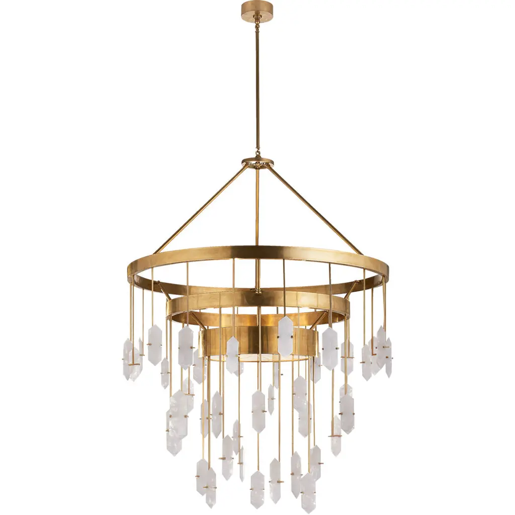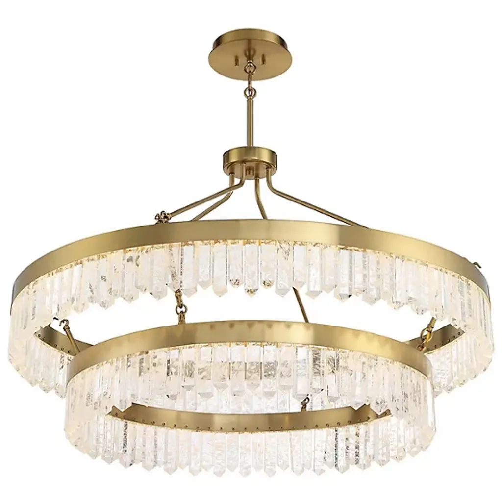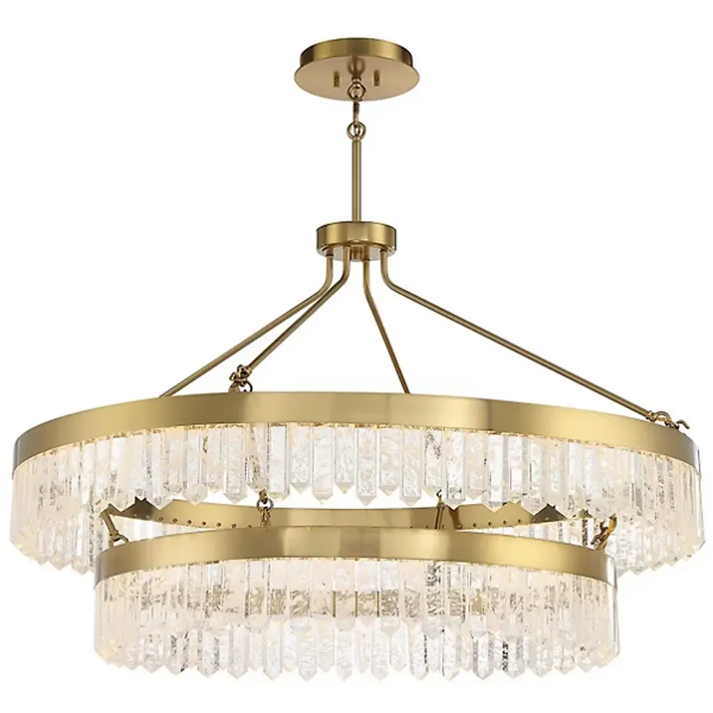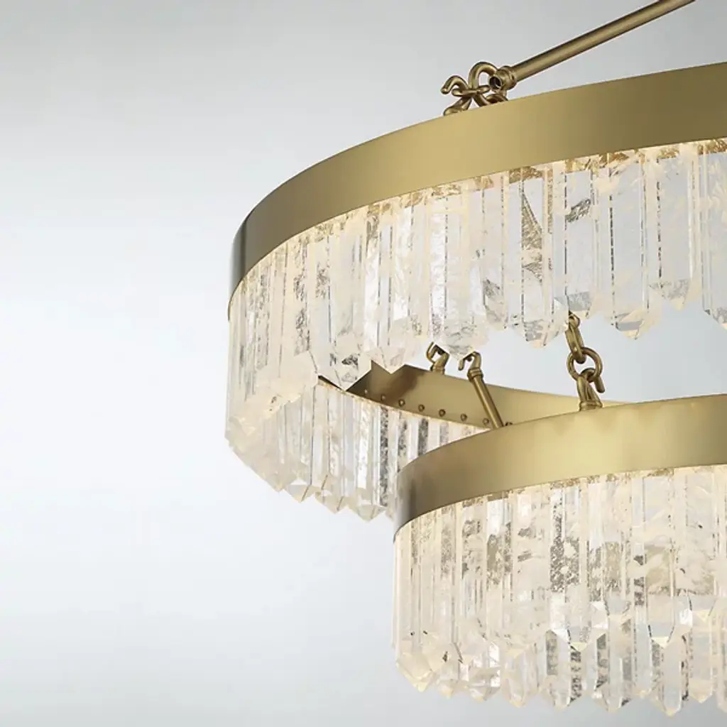 The Landon LED Chandelier from Savoy House is a dazzling blend of sophistication and transitional elegance. Crafted from premium metal, it features exquisite calcite crystal shades that emanate an inviting glow provided by an integrated LED. With two tiers of shimmering beauty, this chandelier adds depth and dimension to your space. Supported by slender arms and secured by a downrod and ceiling canopy, it is as durable as it is refined.