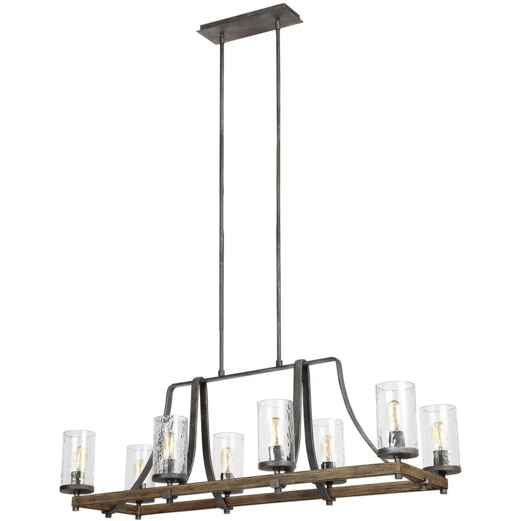 Influenced by both rustic and industrial design, the transitional Lanesnoro chandelier collection by Spark & Spruce celebrates the beauty of imperfection and the visual impact of mixed materials to create an overall rugged look. The cylindrical Clear Thick Wavy glass shades complement the two-toned finish of Distressed Weathered Oak on the outer structures and a new pitted, richly textured Slated Grey Metal finish on the sloping arms for a rustic but tailored look. Perfect as foyer lighting, living room lighting, or paired over a dining room table, and the largest fixture will be the crowning touch to any great room. The Lanesnoro lighting collection includes a five-light chandelier, six-light chandelier, a nine-light, two-tier chandelier, an eight-light linear island chandelier and a one-light sconce light.