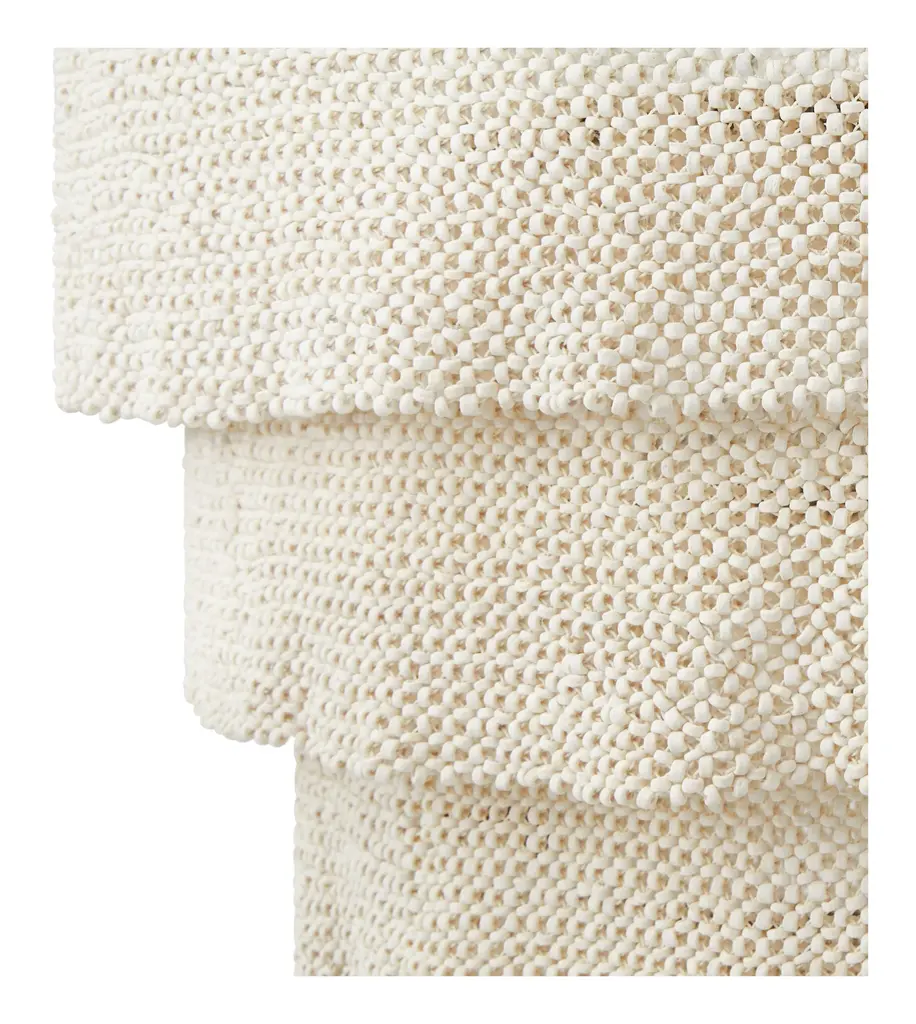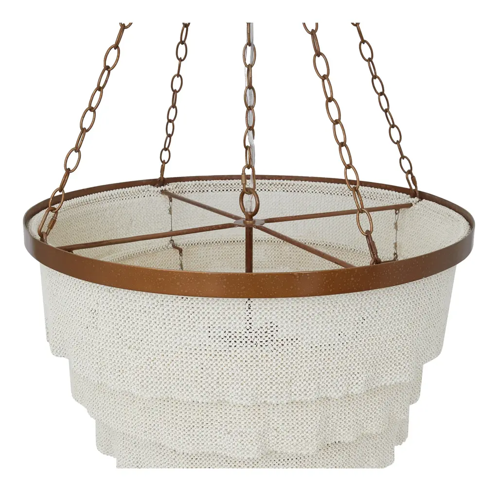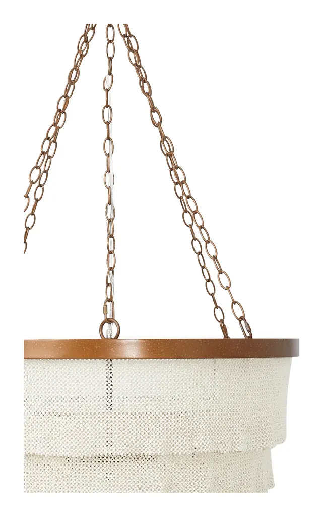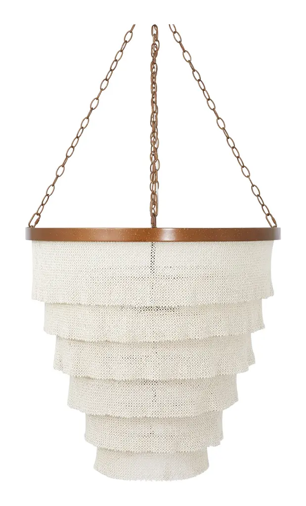 There’s no better way to bring a bit of effortless glamour to your space than our Lani Chandelier. This organic-modern beauty is made up of tiers of natural white coco beads, which dangle from six concentric rings in antiqued brass for a cascading feel. All of this hangs from five metal chains in matching antiqued brass. Perfect for adding a touch of earthy texture to any room of the house, we love Lani illuminating a boho-chic entryway, making a statement over an elegant dining table or casting its glow in a laid-back bedroom or living room. •natural coco beads •antiqued brass •hardwire •requires 40W max/type B-E12 bulb x 5 •30" diameter x 30"H•chain: 44" long•canopy: 5" diameter x 1"H