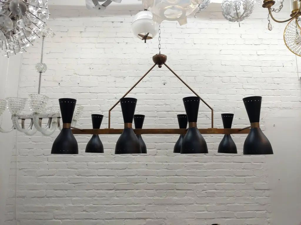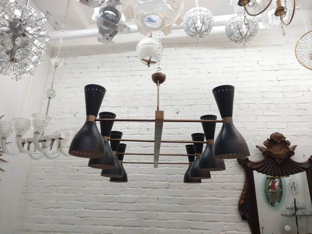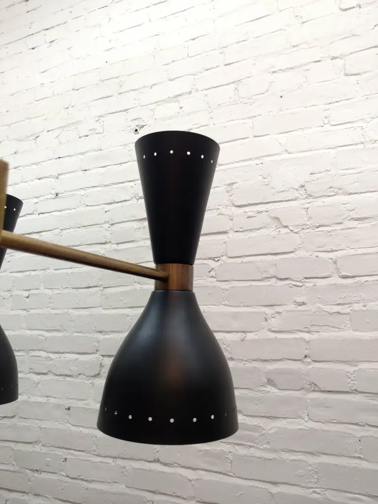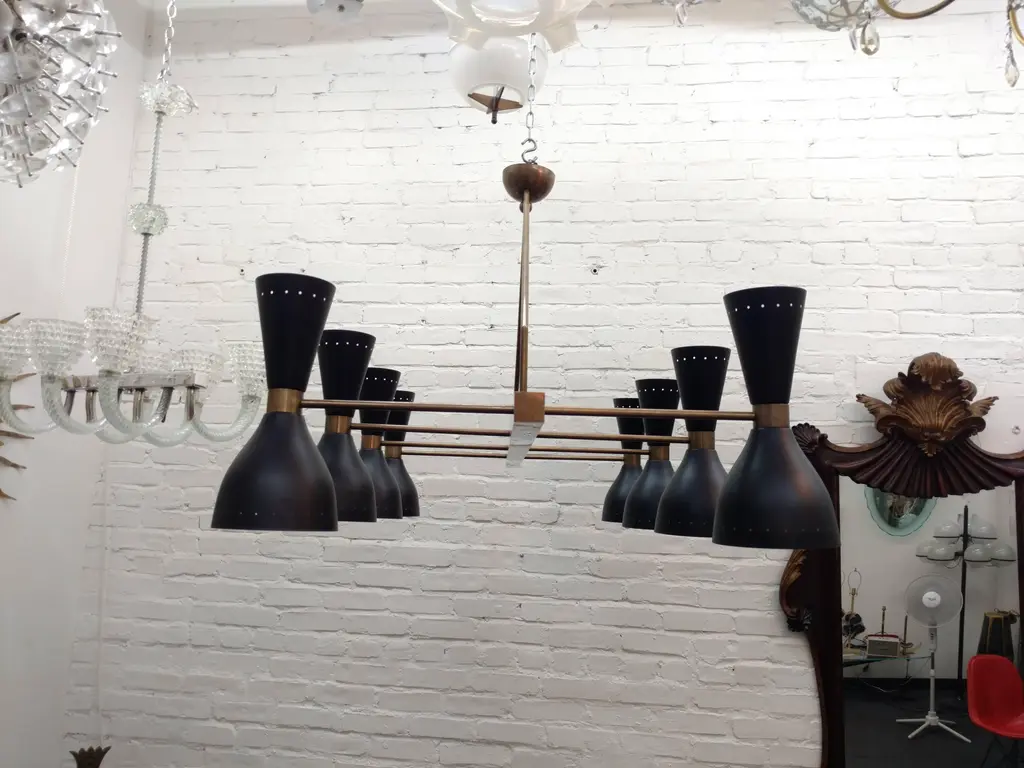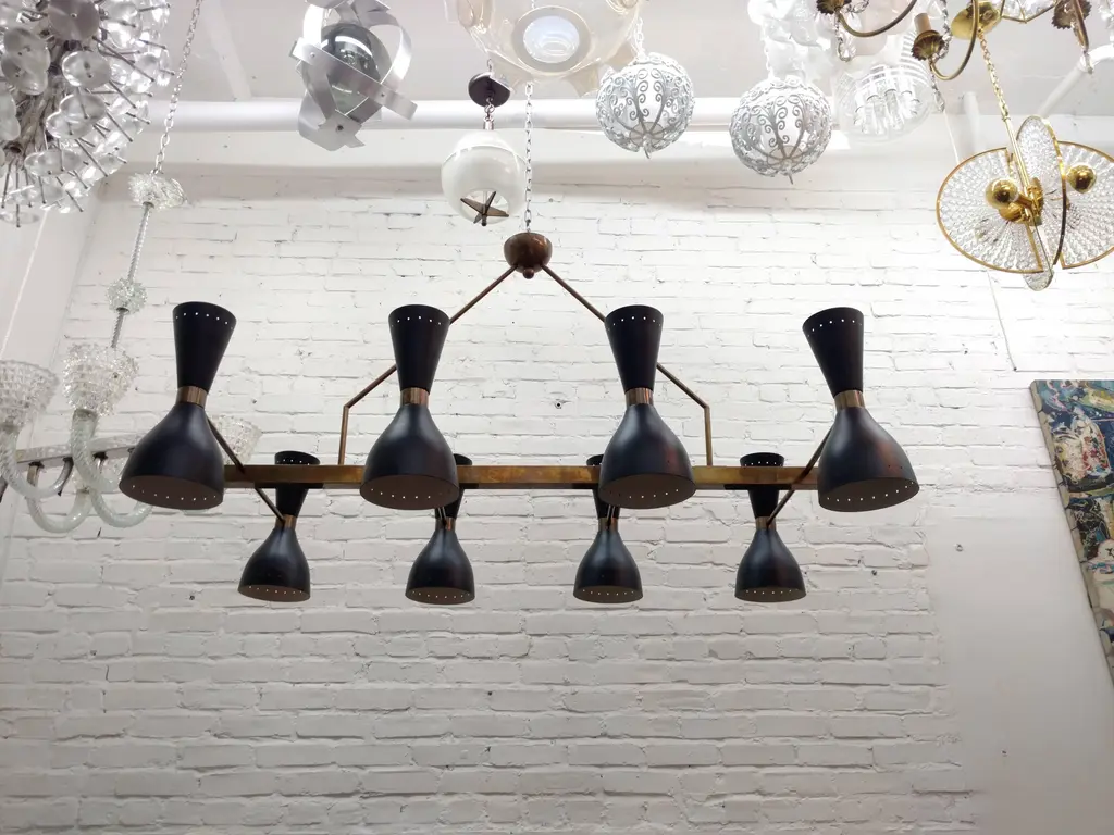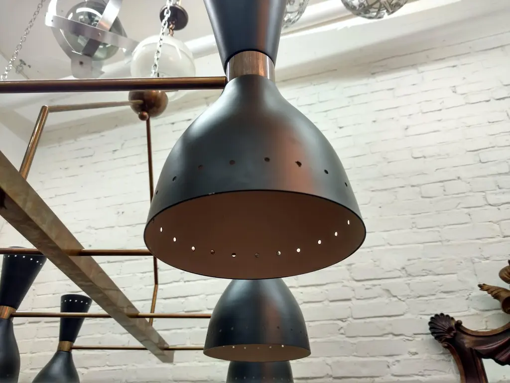 Large made to order contemporary fixture composed of ten satin black enameled shades. Each fitted with a set of candelabra socket (upwards) and a medium base Edison socket (downwards). It will take 11-12 weeks to make this piece