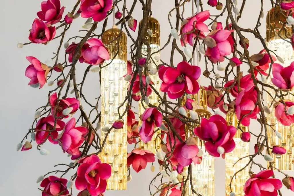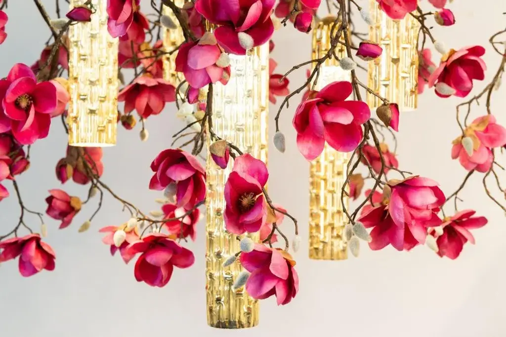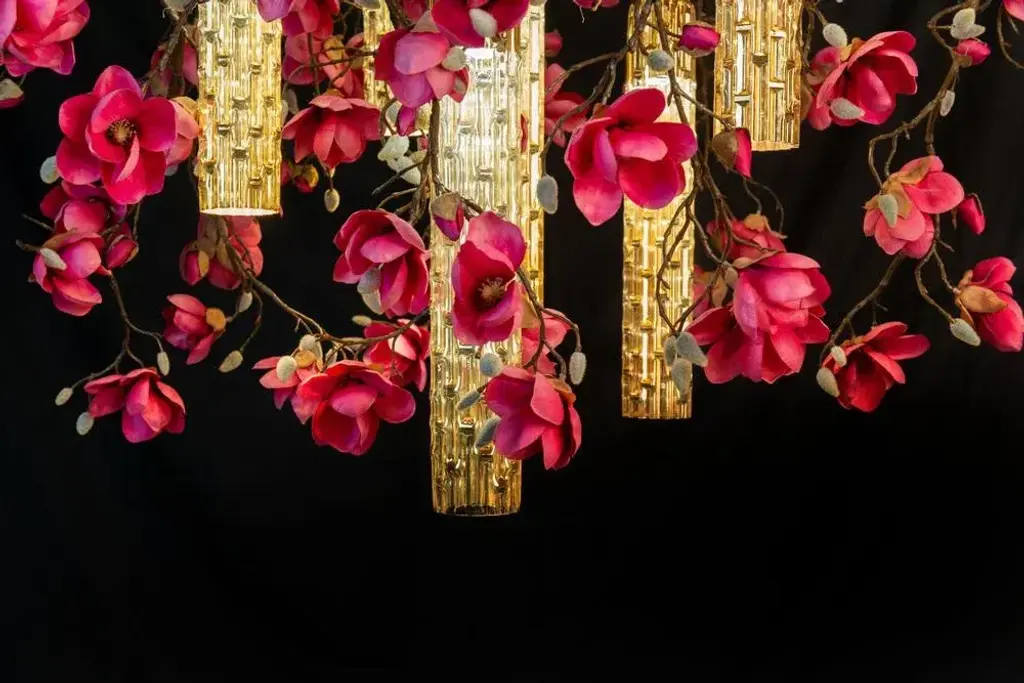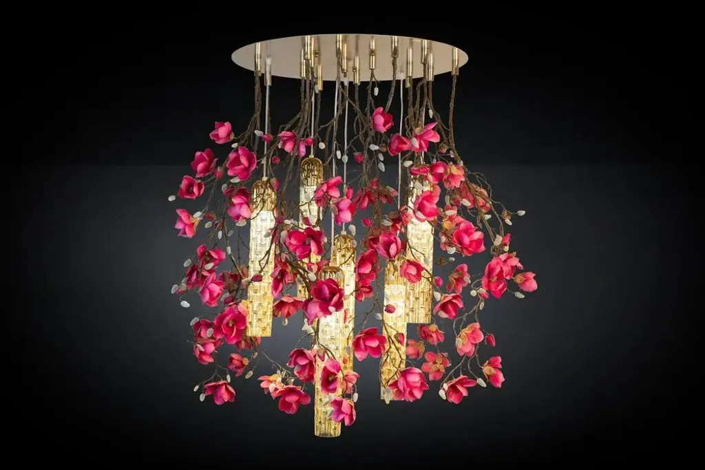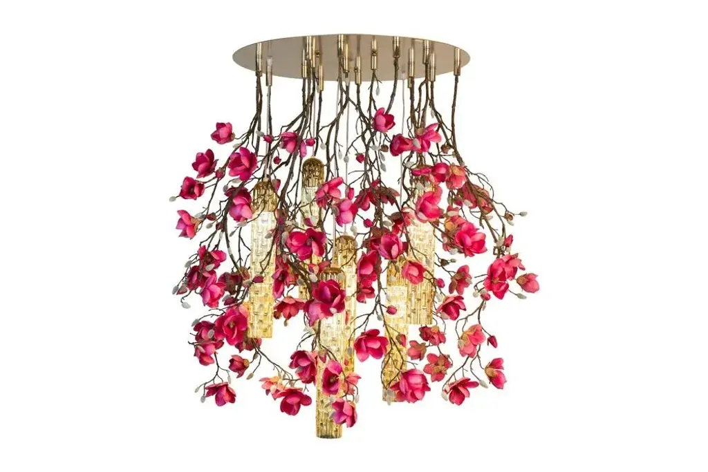 Chandelier consisting of vg artificial flowers and pipes in muranese glass, led bulbs (6 bulbs gu10 x 6w each) fitted with fixing plate in varnished steel champagne color, to be suspended or ceiling mounted. the standard version uses vg fuchsia magnolias & glossy gold pipes in muranese glass. plate size is approx 15 cm shorter in length and width than volume dimensions. up to 250v (europe/uk standard).