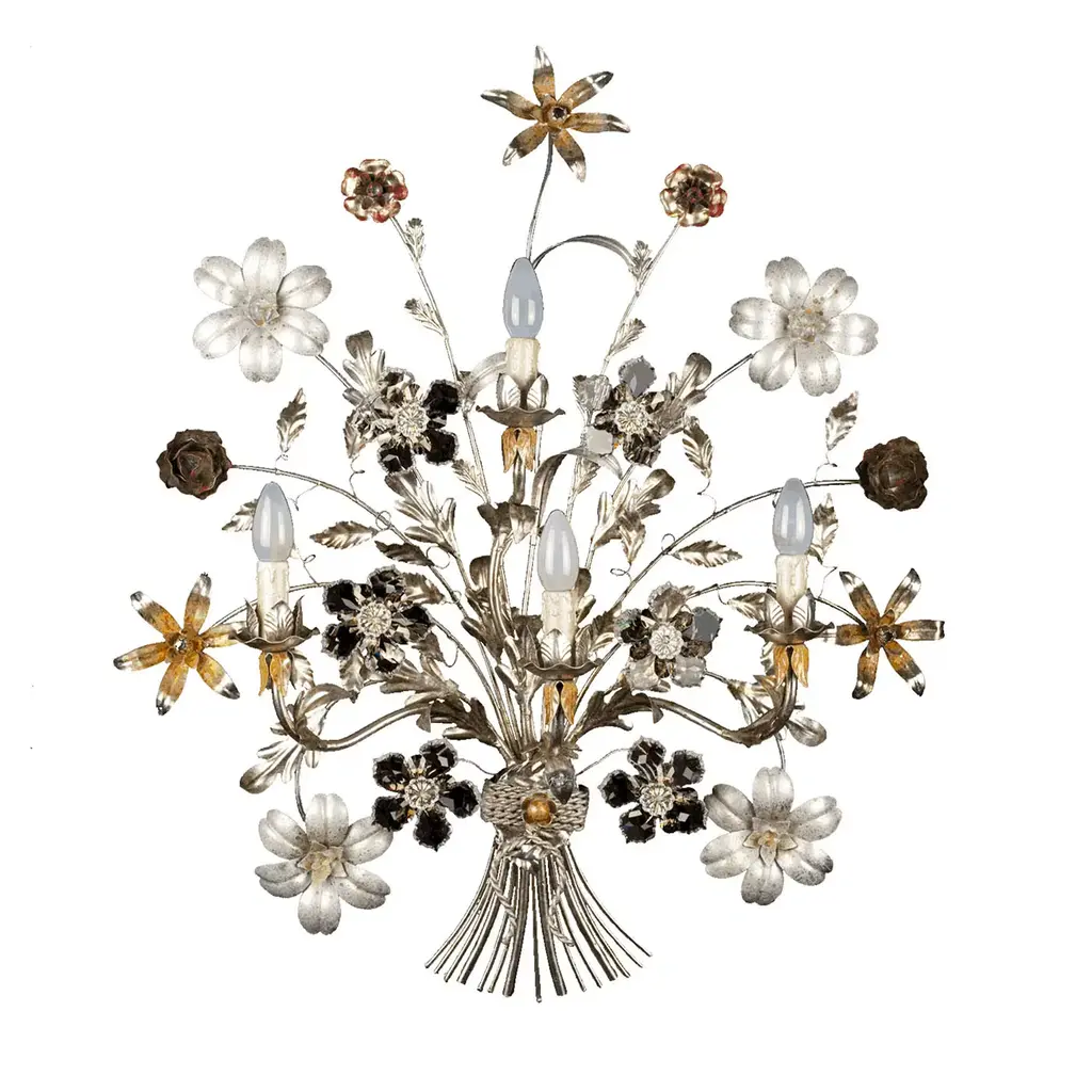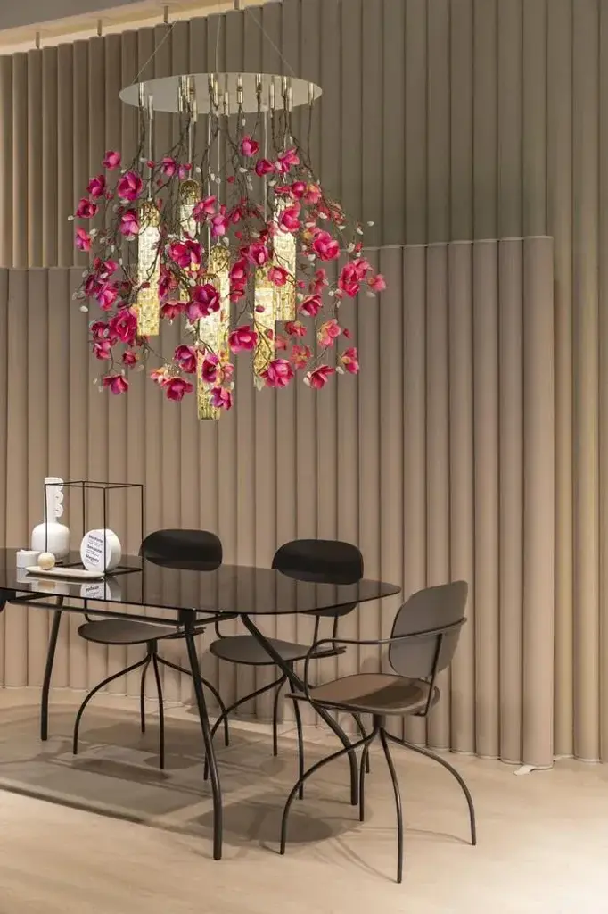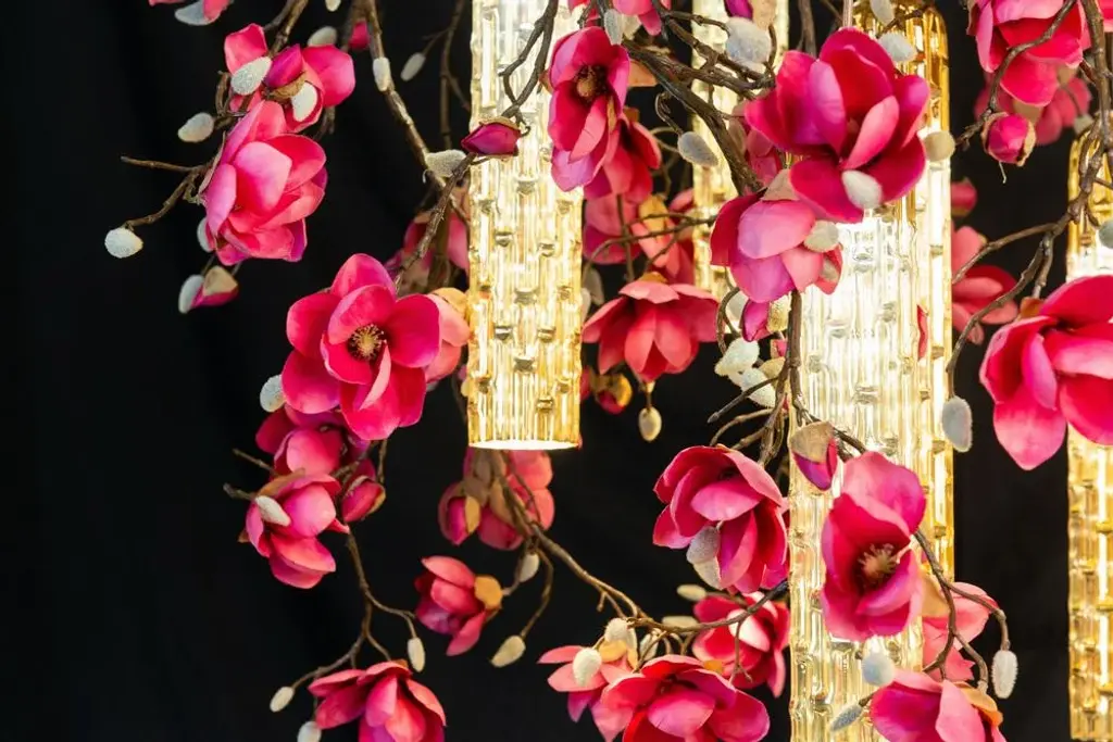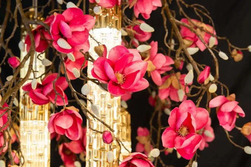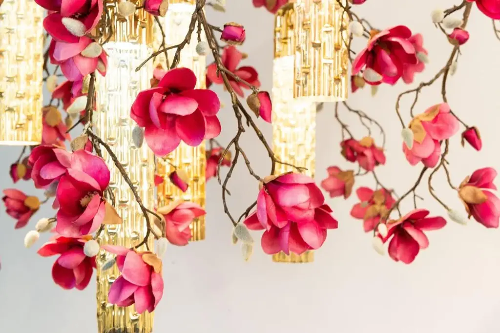 Chandelier consisting of vg artificial flowers and pipes in muranese glass, led bulbs (6 bulbs gu10 x 6w each) fitted with fixing plate in varnished steel champagne color, to be suspended or ceiling mounted. the standard version uses vg fuchsia magnolias & glossy gold pipes in muranese glass. plate size is approx 15 cm shorter in length and width than volume dimensions. up to 250v (europe/uk standard).