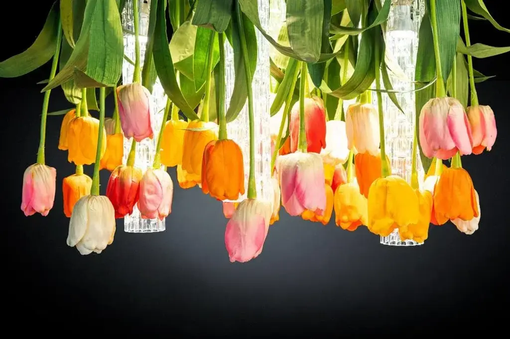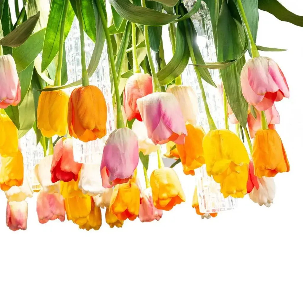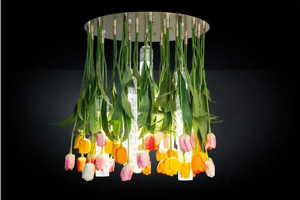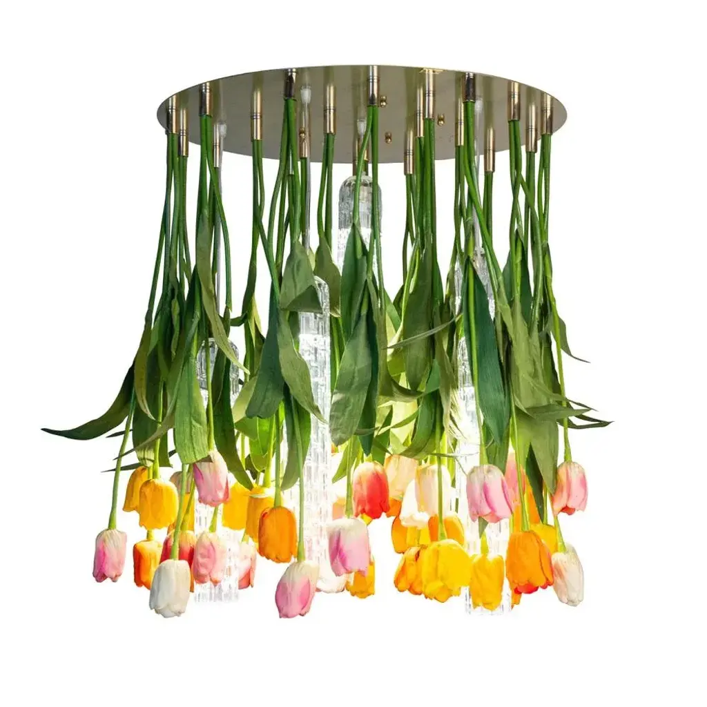 Chandelier consisting of vg artificial flowers and pipes in muranese glass, led bulbs (6 bulbs gu10 x 6w each) fitted with fixing plate in varnished steel champagne color, to be suspended or ceiling mounted. vg tulips in various colours and different length are supplied as standard version, creating a vegetative flower bed. plate size is approx 15 cm shorter in length and width than volume dimensions. up to 250v (europe/uk standard).