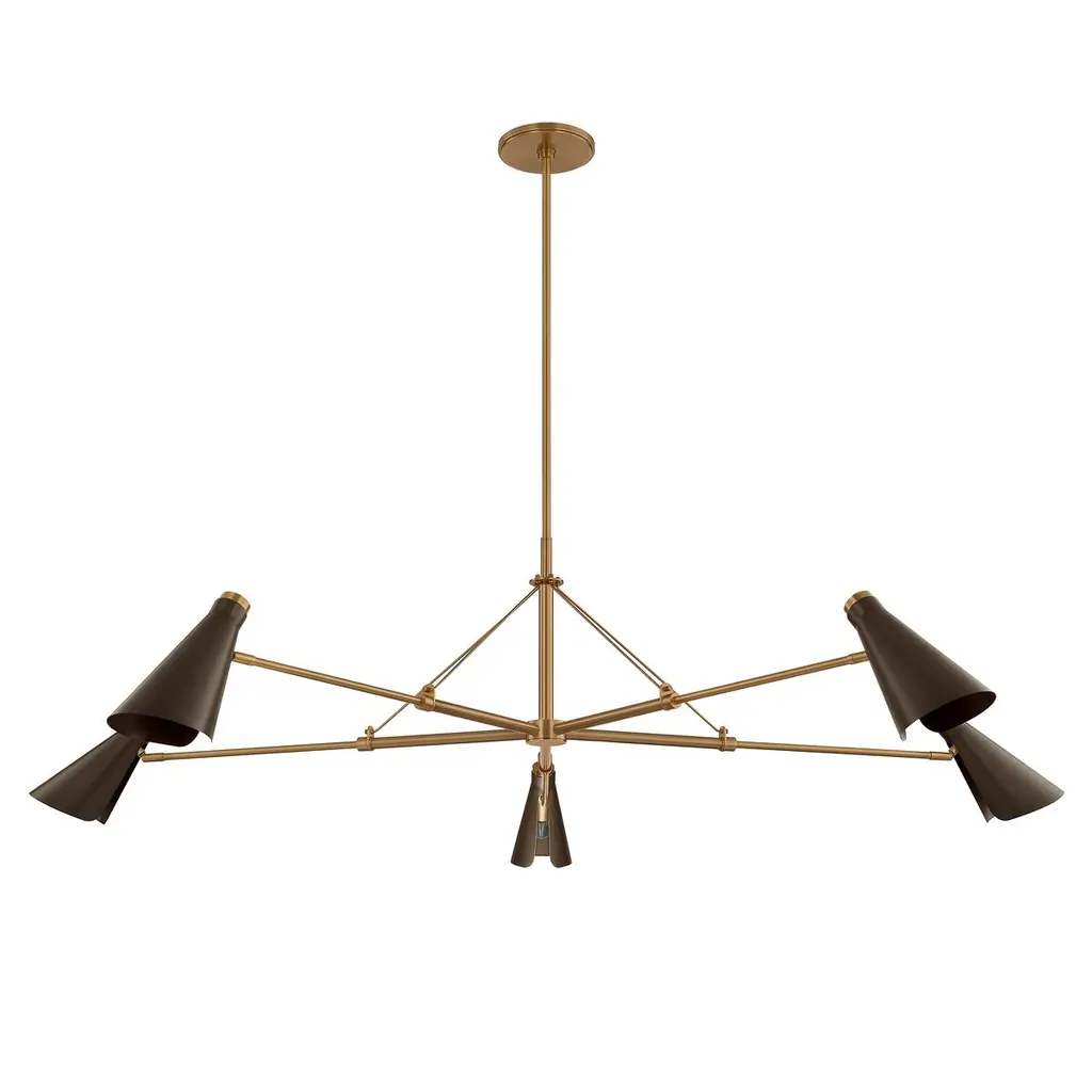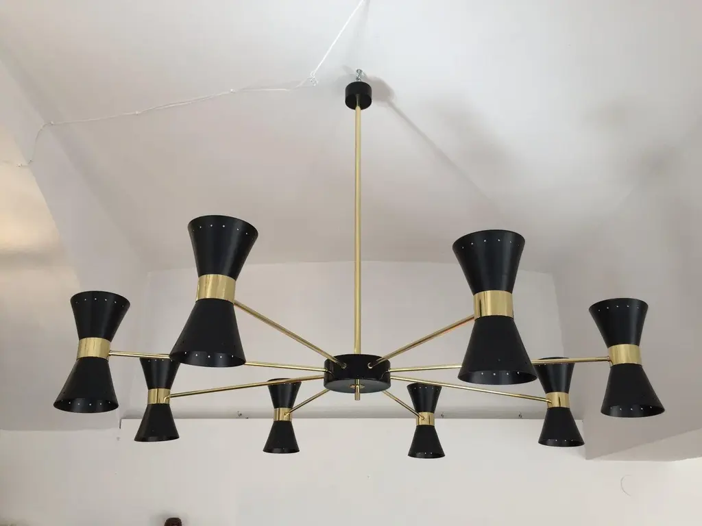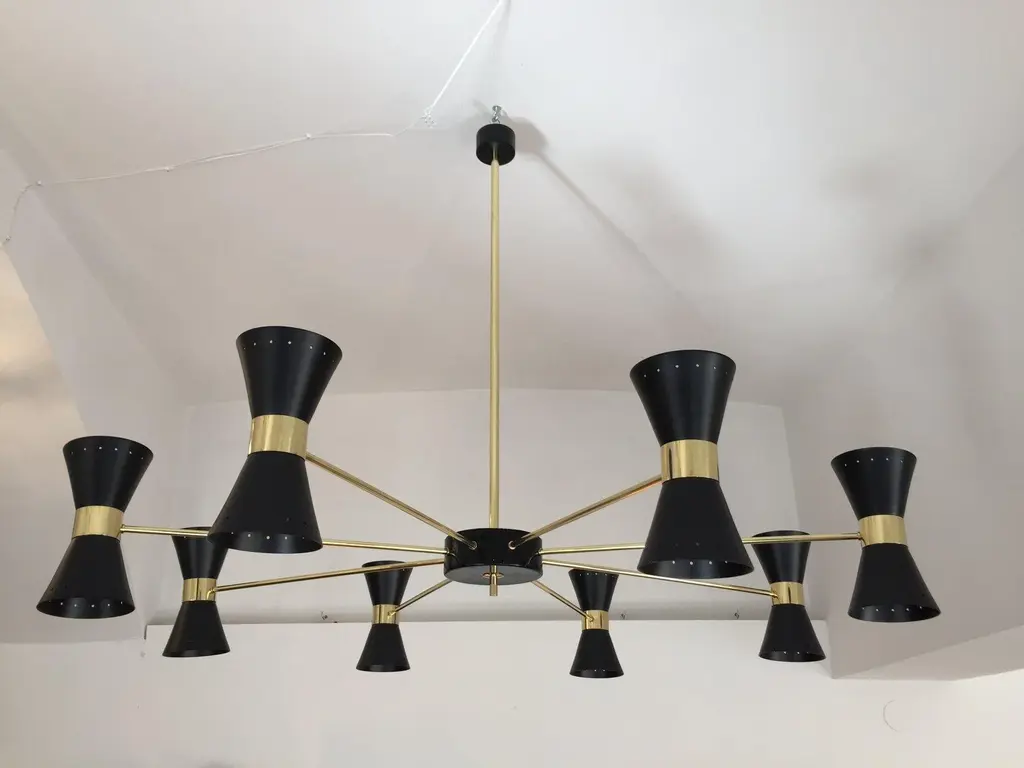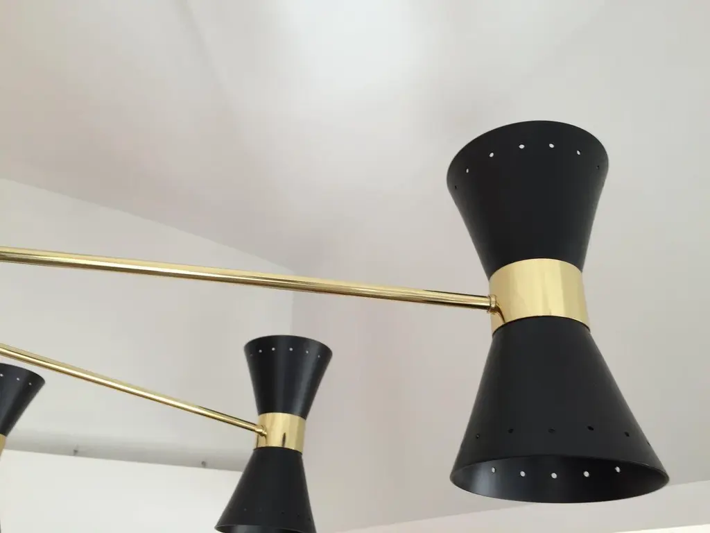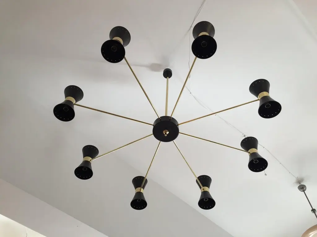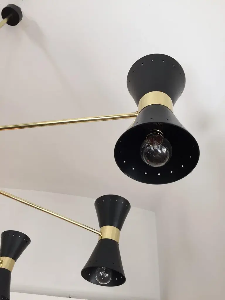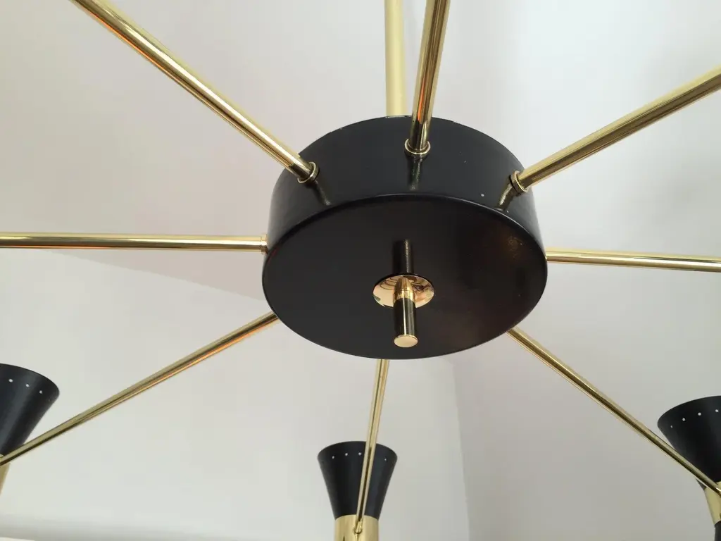 This Sputnik chandelier, in the style of Stilnovo, was produced in Italy in the 1958. The piece is made from brass and is lacquered in black. It has eight arms that hold black lacquered diabolo shaped double cones, and each cone is powered with an E14 socket, holding 16 lights (eight up and eight down). It has been restored. European Plug (up to 250V).The wiring of this item may be original and might need replacement, if not specified otherwise.