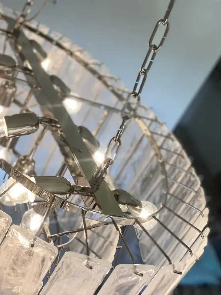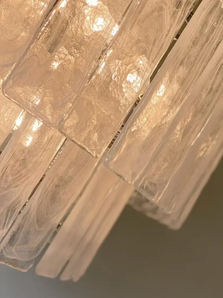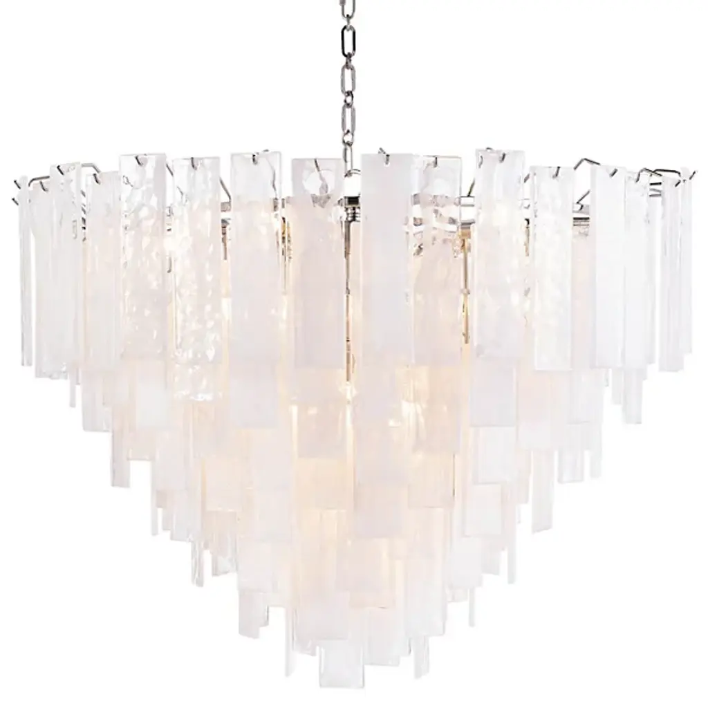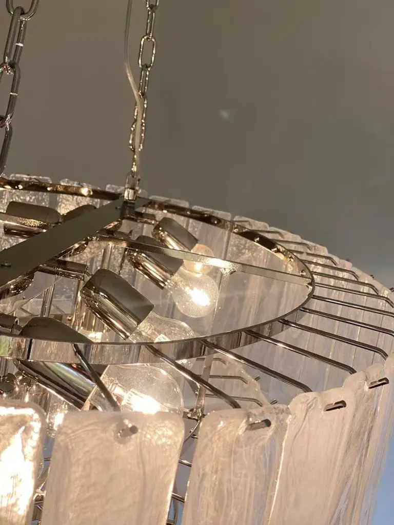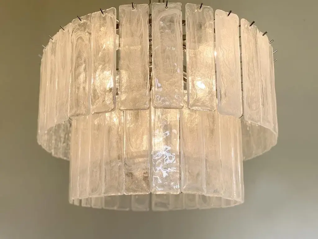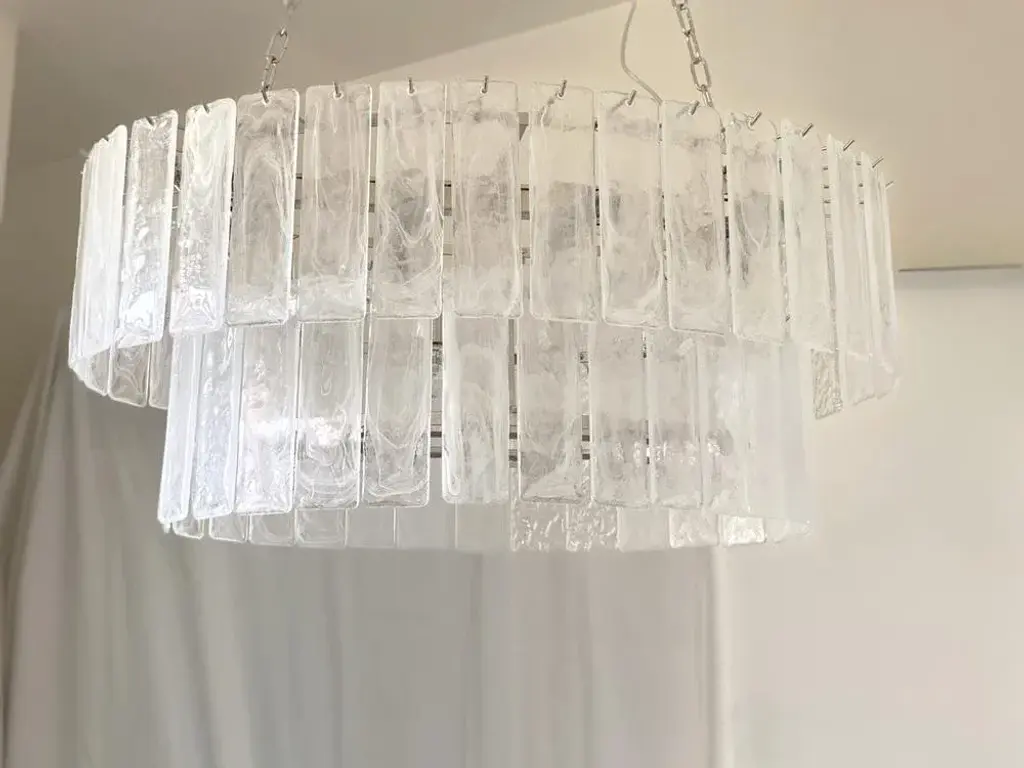 Chandelier contemporary oval huge diamond “listelli ” murano glass contemporary oval huge diamond “listelli ” murano glass chandlier contemporary diamond striped “listelli ” murano glass chandelier. oval chandelier in three levels of rectangular strips “listelli ” elements of murano glass worked with traditional tecnique in “piastra” -slab. this working process made with this diamanted texture the trasparent murano glass very sparkling also when the chandelier is turned off. entirely made in italy, fruit of murano glass of high italian know-how. a luxury piece of italian art. oval l 96x70cm h 45cm /l 37.8" x 27.5" h 17.7" 12 bulbs, led compatible , not included spare parts included two chain more canopy h 19.7″ up to 250v (europe/uk standard).