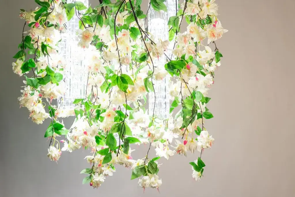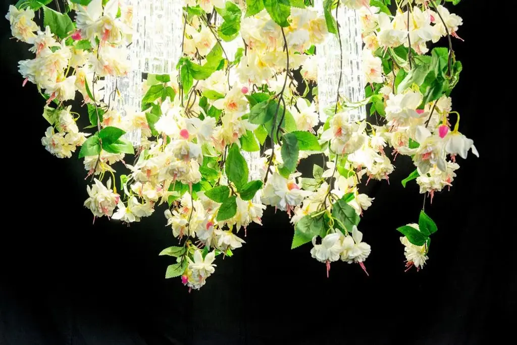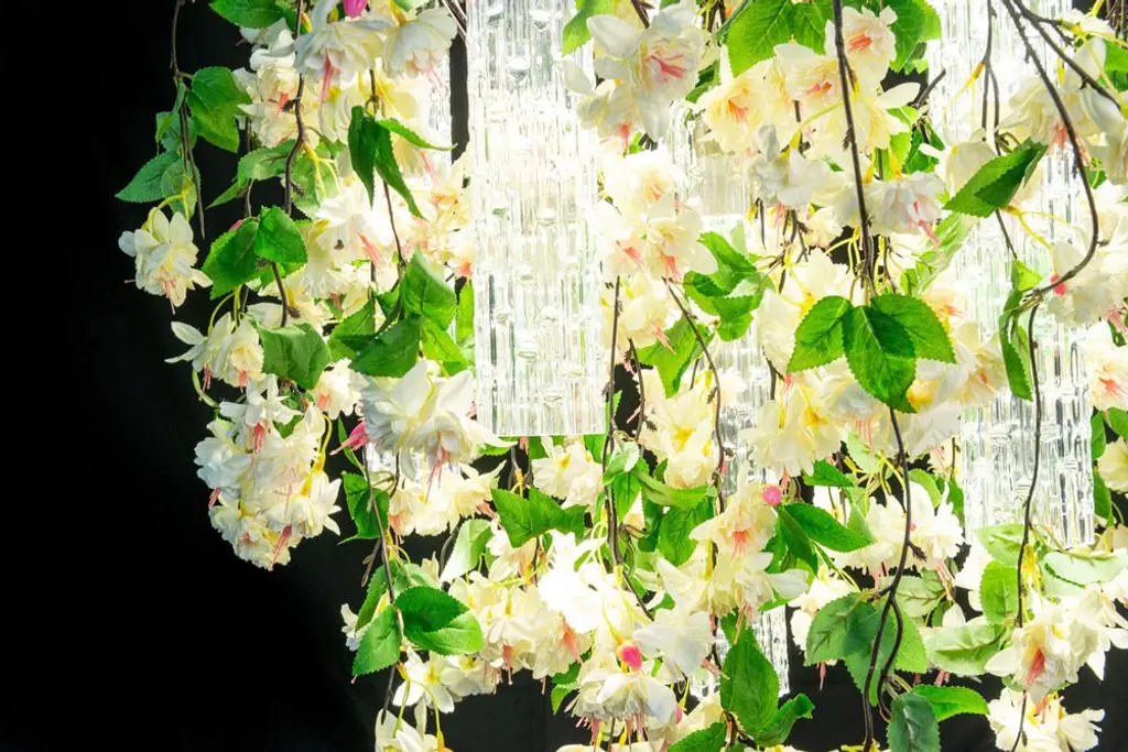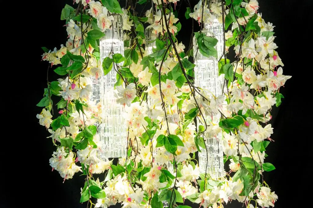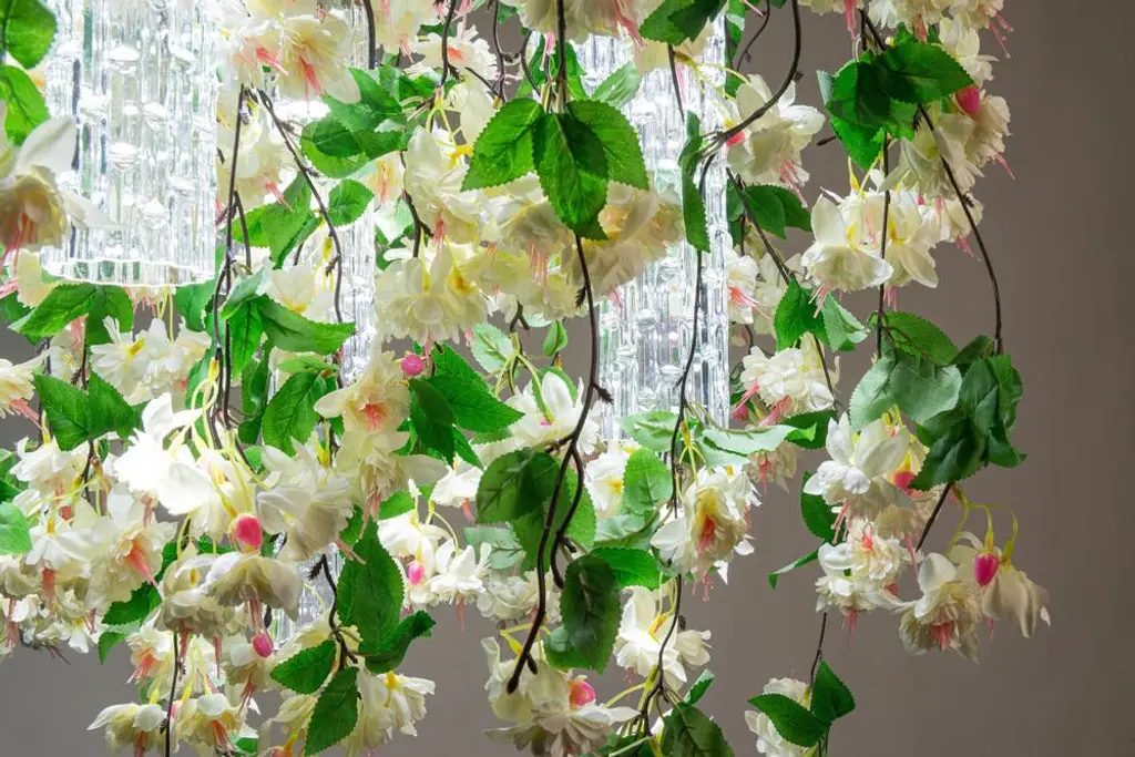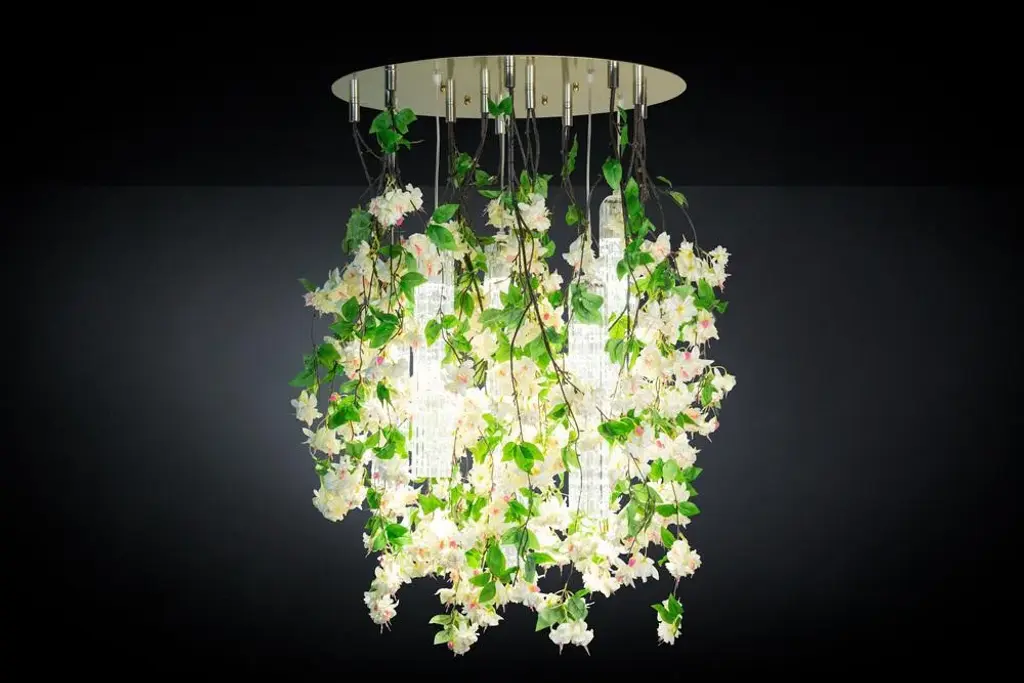 Chandelier consisting of vg artificial flowers and pipes in muranese glass, led bulbs (6 bulbs gu10 x 6w each) fitted with fixing plate in varnished steel champagne color, to be suspended or ceiling mounted. the standard version uses vg fuchsia flowers, available with transparent or glossy gold muranese glass. plate size is approx 15 cm shorter in length and width than volume dimensions. up to 250v (europe/uk standard).