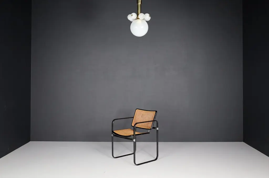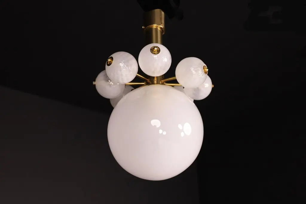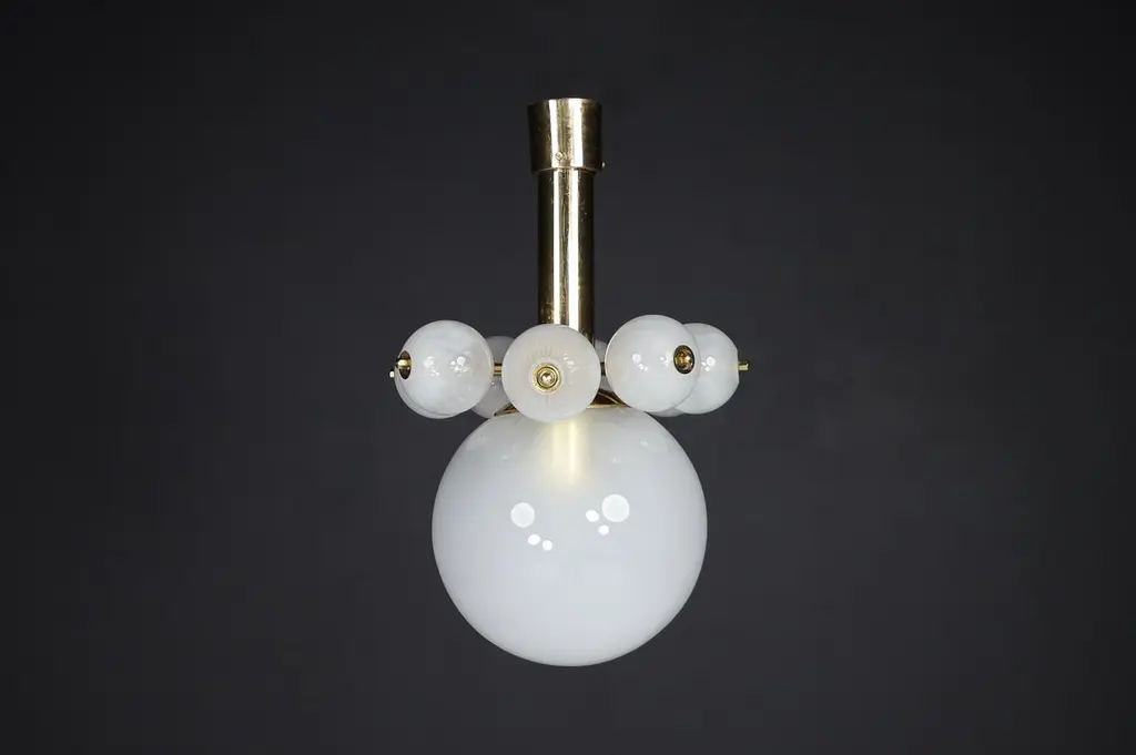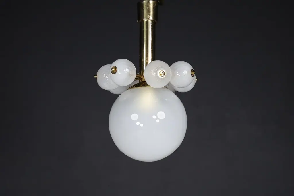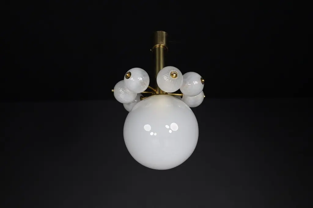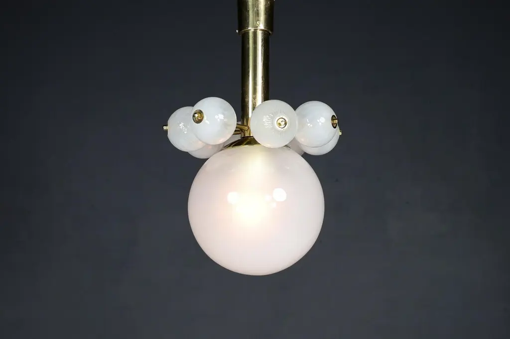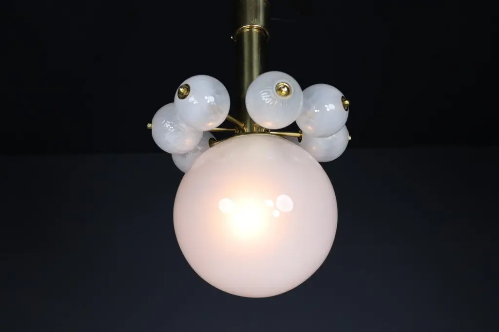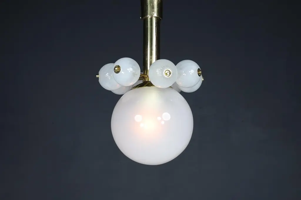 Large set chandelier with brass fixture and hand-blowed frosted glass globes, Czechia 1960sAn extensive set chandelier with a brass fixture was produced and designed in Czechia in the 1960s. A large frosted glass globe and eight smaller structured frosted glass globes. The pleasant light it spreads is very atmospheric. Completed with structured frosted glass and brass details, this enormous chandelier will contribute to the luxurious character of the (hotel-lobby-bar) interior. They have fitted with porcelain E27 socket. The lights are compatible with US/UK/ASIA standards. Also LED compatible. Cleaned and well-wired, in complete working order, and ready to use. The frame is in excellent condition, with a minor patina on the brass parts. This light can be disassembled, and the glasses can be individually wrapped for easy transport.- Size: Diameter 35 cm- Size: Height 45 cm - Fitted with E27 socket suitable for LED.- The lights are compatible with US/UK/ASIA standards.- Cleaned, well-wired, and ready to use - 16 items are available. Price per light.