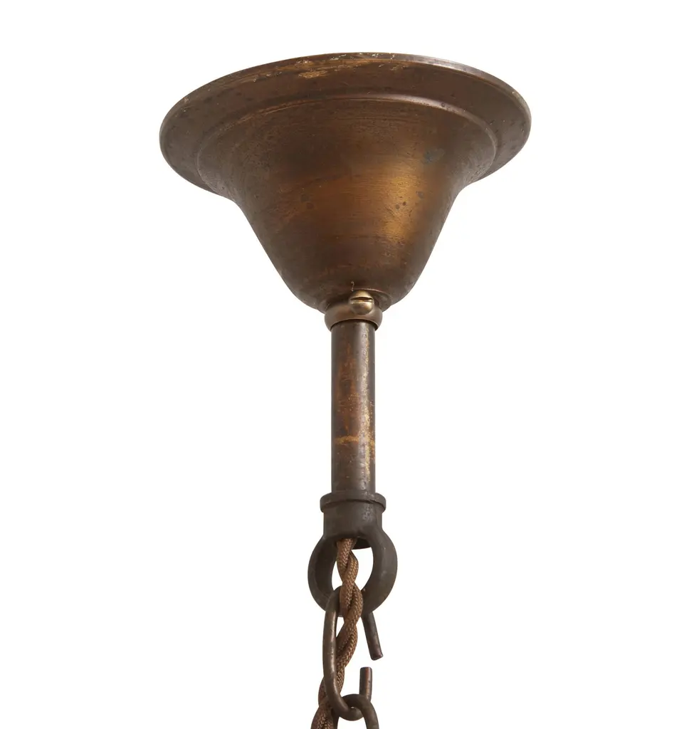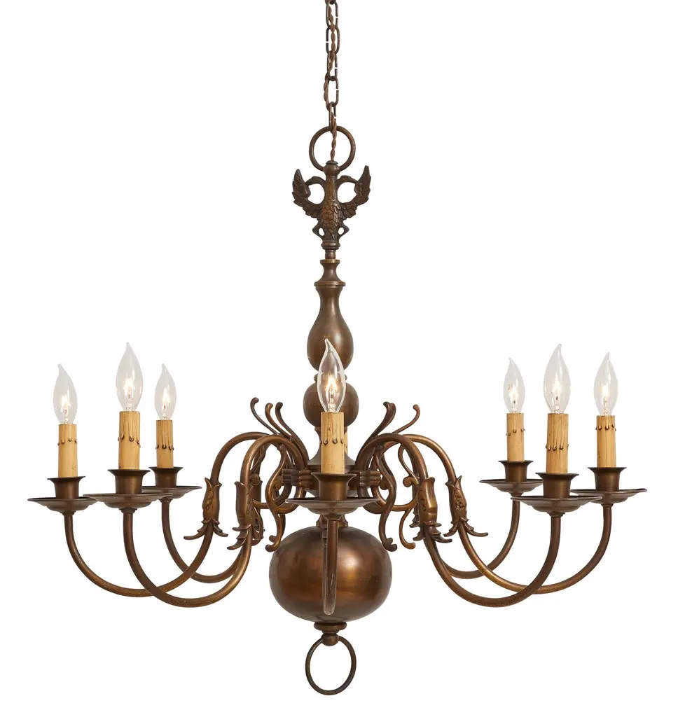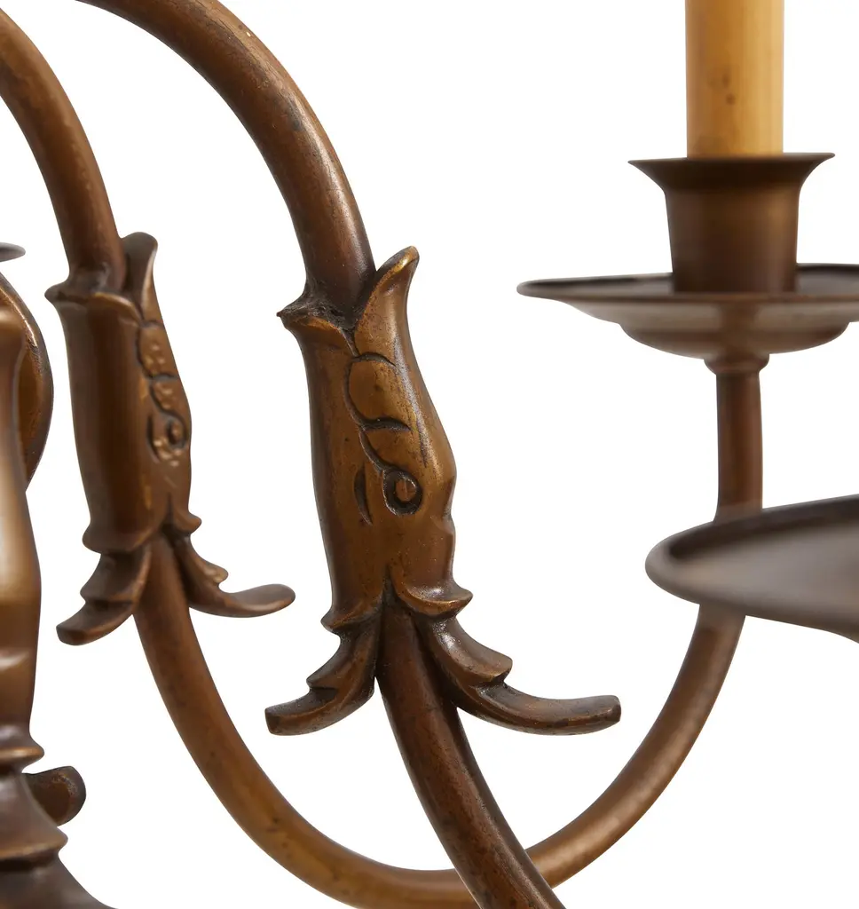 Coinciding with the rise of Colonial-inspired architecture in the late 19th century, Colonial Revival lighting was a popular style from the 1920s through the 1950s. Referencing American history and neoclassical styles, Colonial Revival lighting features traditional, symmetrical forms, graceful curves, and turned elements without overt ornamentation. Shining brass and polychrome surfaces were the most popular in this period, with silver-plated finishes adorning more elegant fixtures.