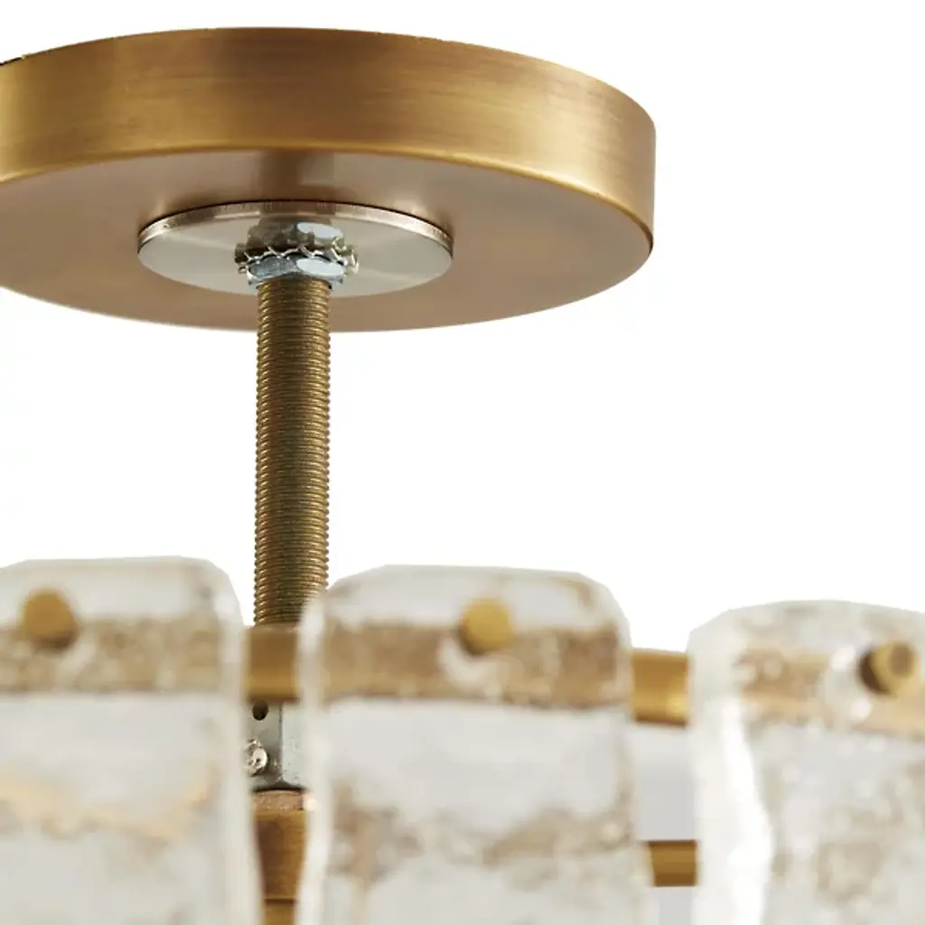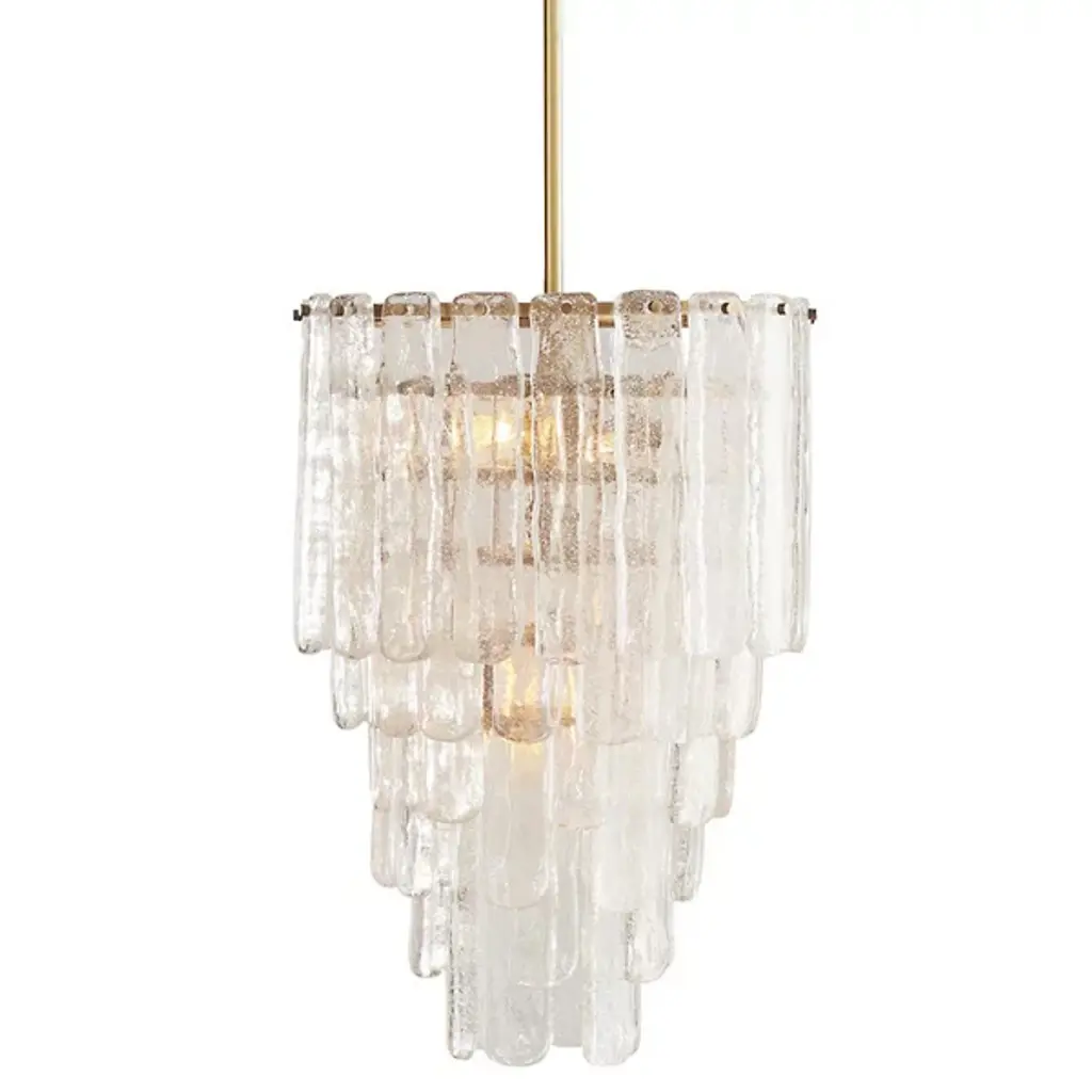 The spectacular Larie Chandelier by Arteriors melts the heart of anyone with a penchant for beautiful things and trendsetting design. Five tiers of clear seedy glass bars resembling icicles create a dazzling crystalline display in traditional living spaces and dining rooms. The steel frame and mounting hardware in a warm antique brass finish contrast with the cool icy sparkle for a stunning ceiling fixture that can be installed inside or in covered exterior areas.