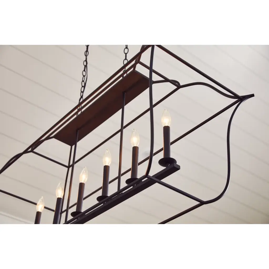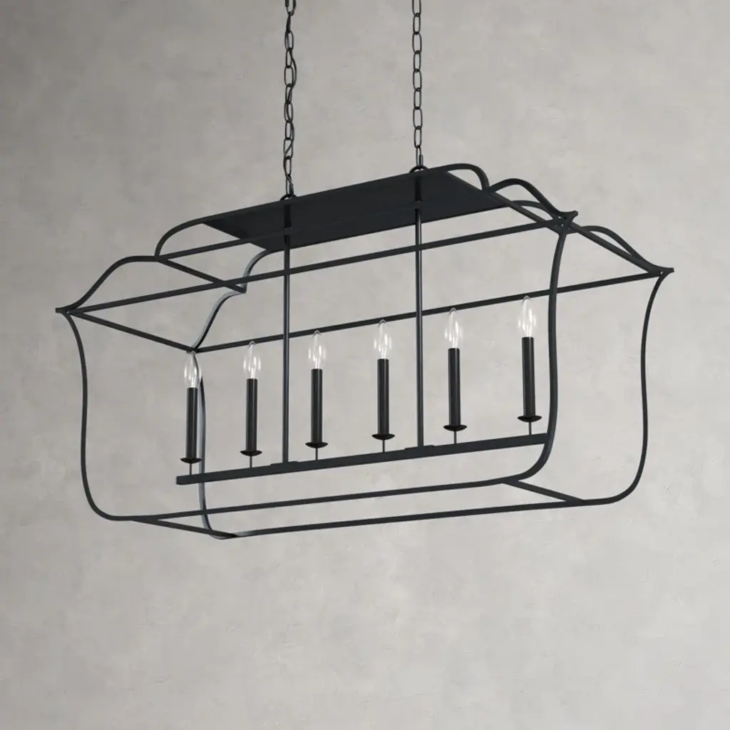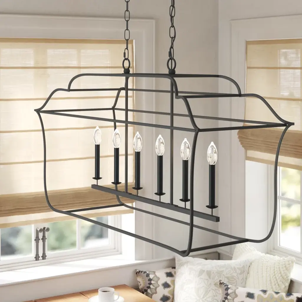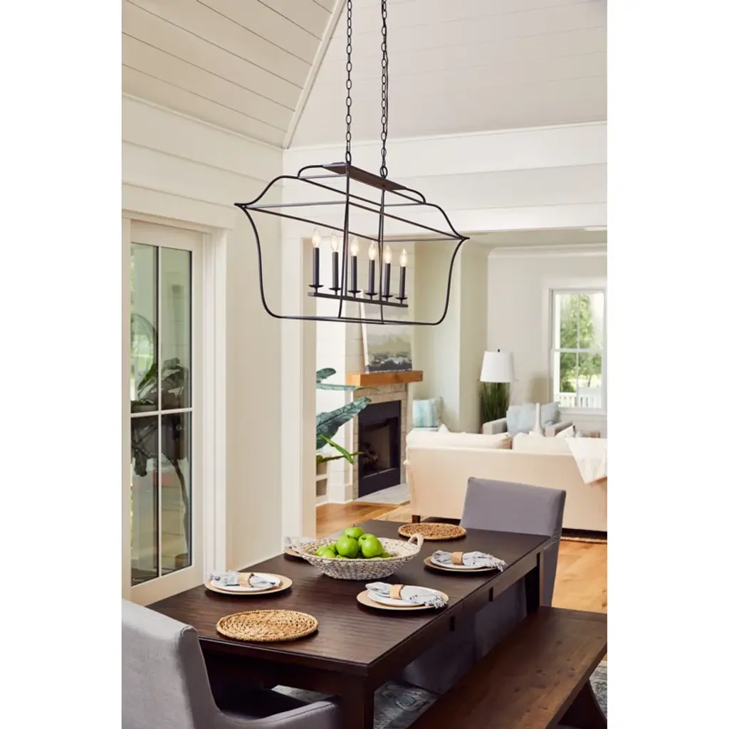 This 6-light chandelier is crafted in an open silhouette with slim, shapely lines that are sure to add a focal point to your farmhouse decor. It's made with a metal frame that lets you see inside to a row of candle-style lights. This linear chandelier gives off ambient light from six 60W candelabra bulbs (sold separately). It hangs from adjustable-height chains that work with sloped ceilings, so it's a sure fit, no matter the shape and size of your dining room. Plus, it's dimmable, so you can set just the right ambience for dinnertime.